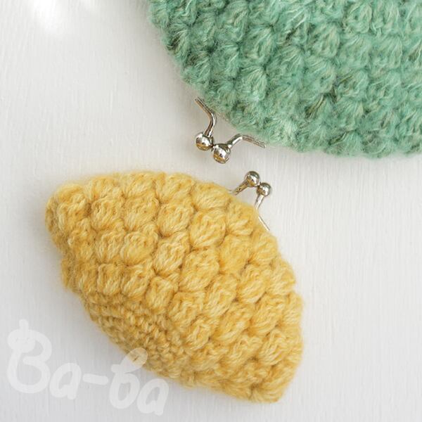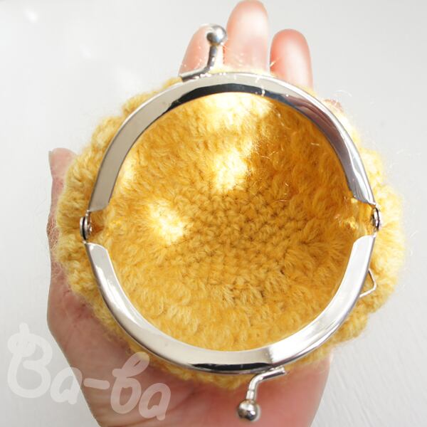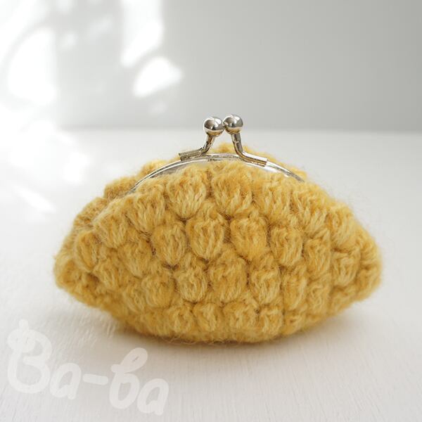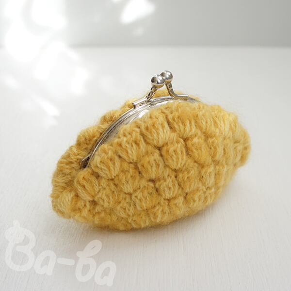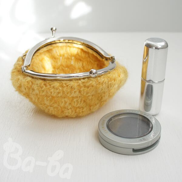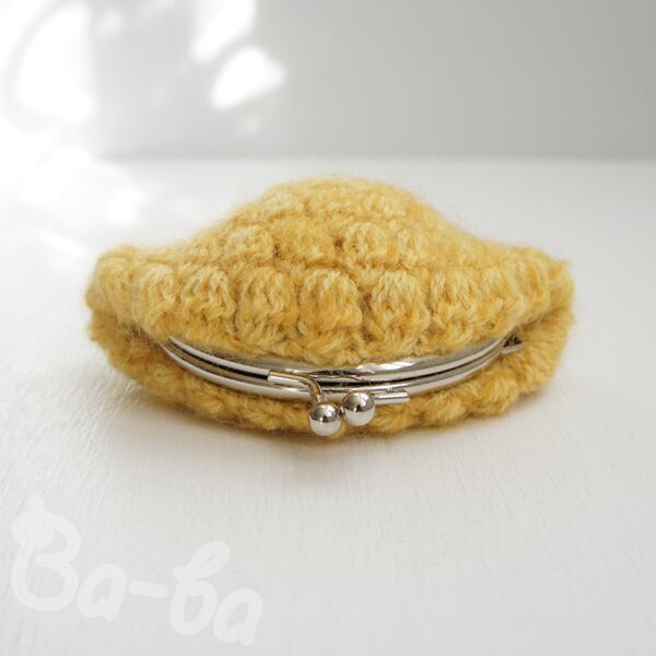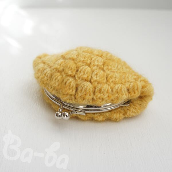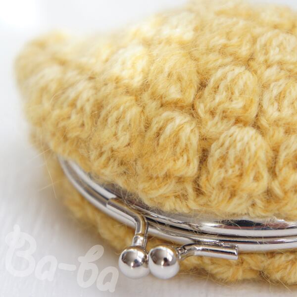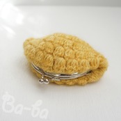 マスタード色のモヘヤ毛糸を「玉編み」で編み上げ、がま口に仕上げました。