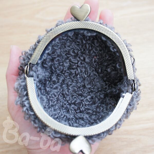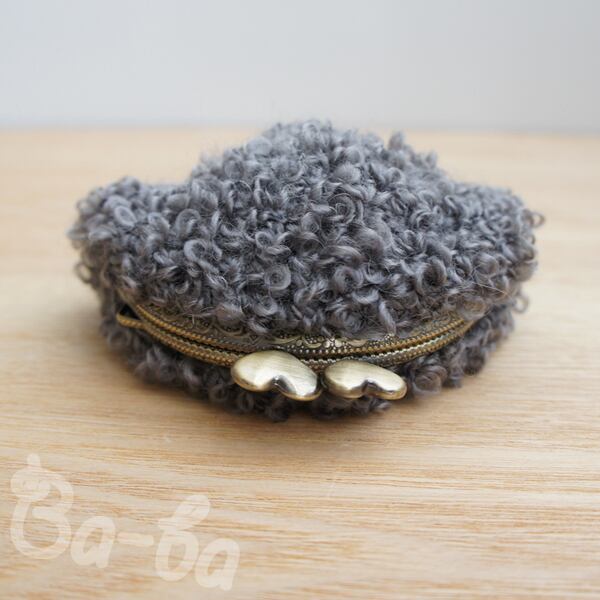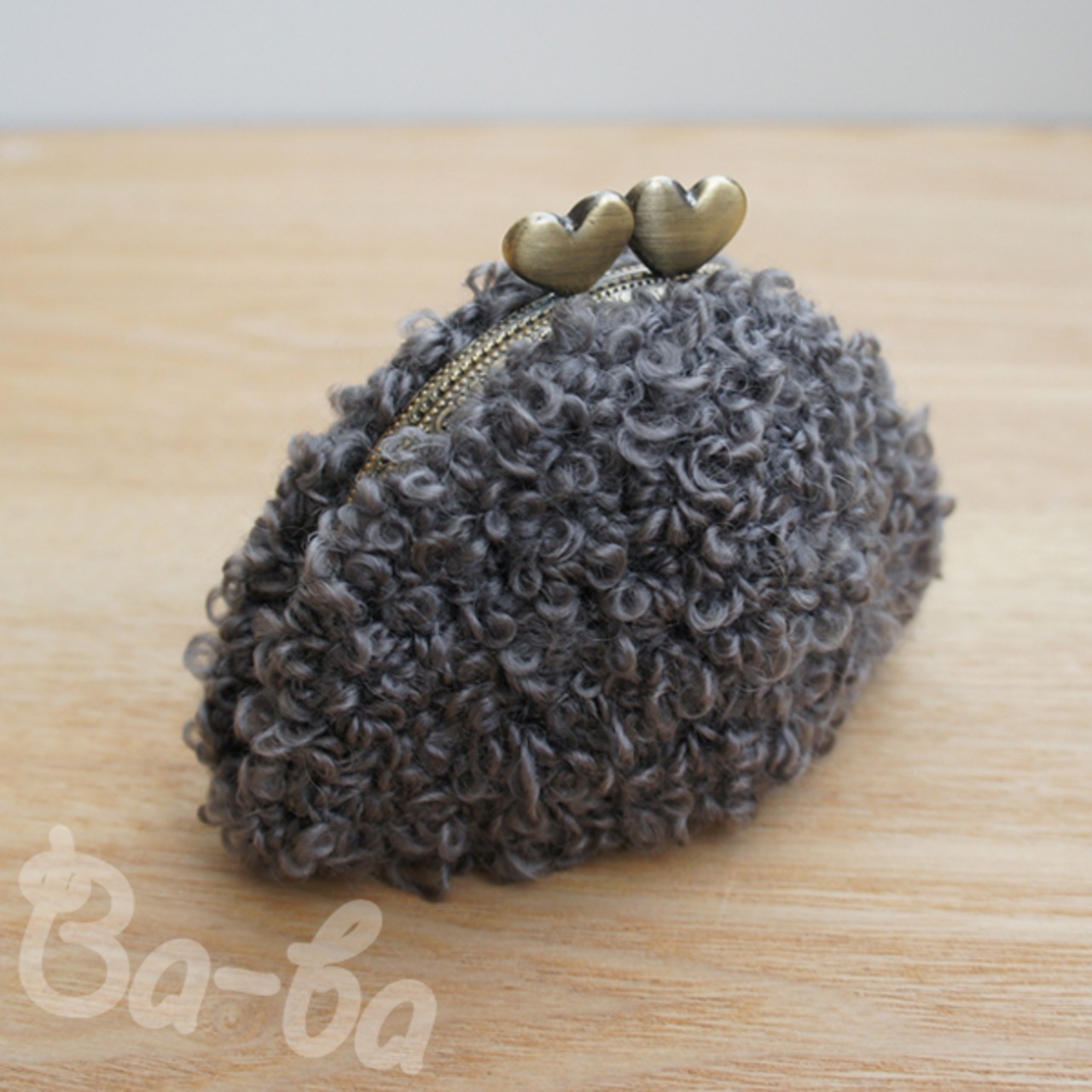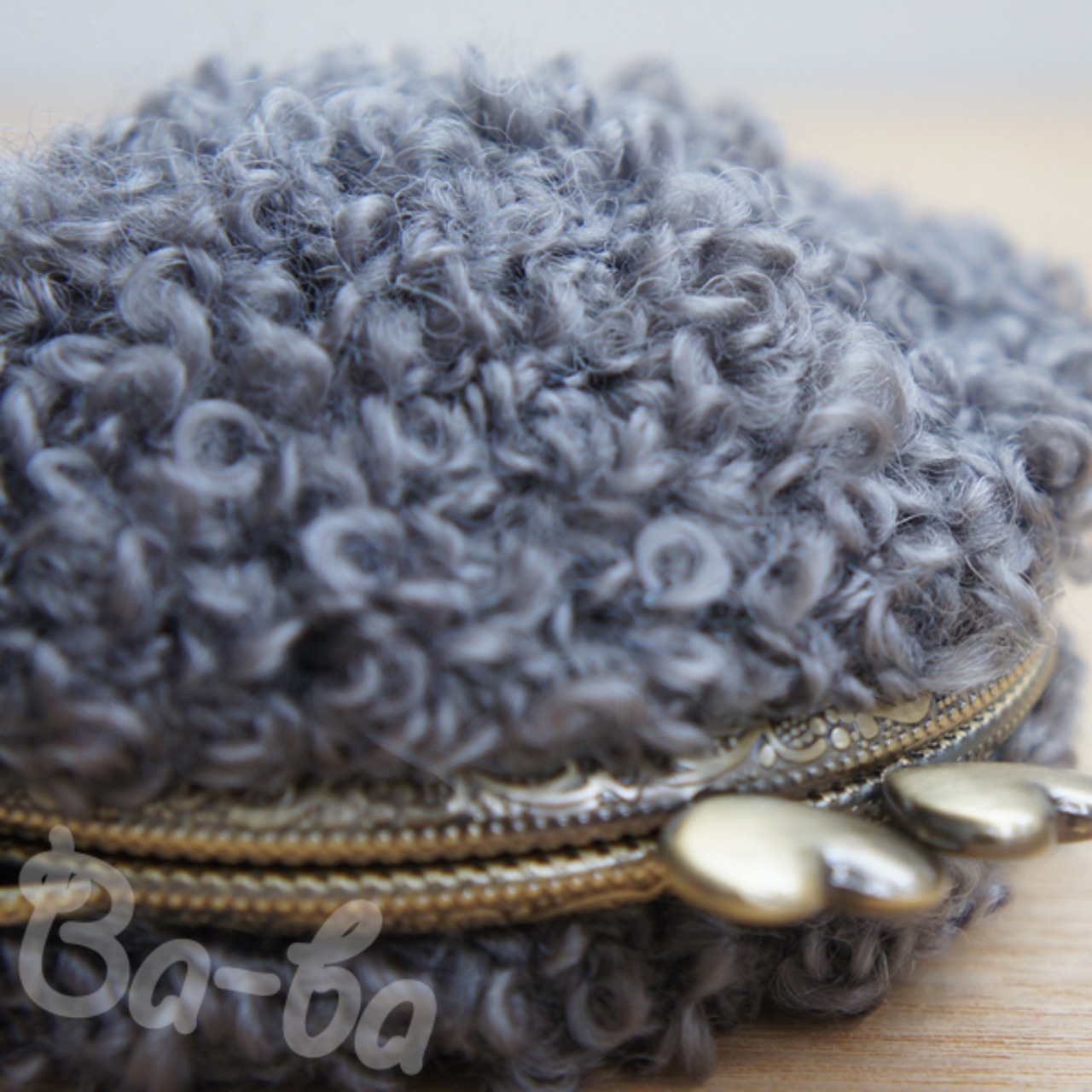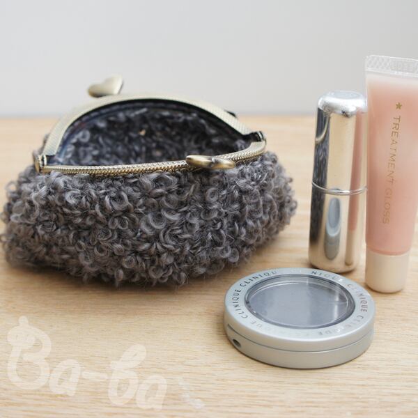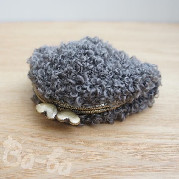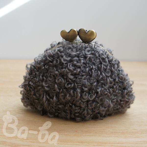 シックなダークグレーのループヤーンをふんわりと編み上げ、ハートつまみの口金と組み合わせました。