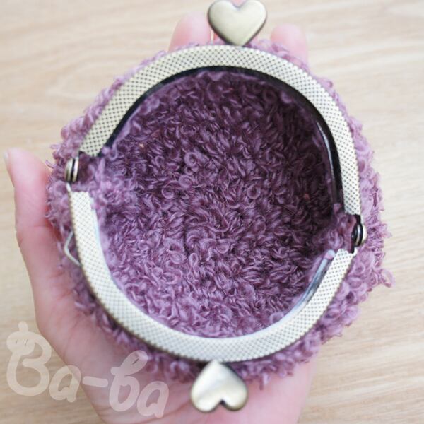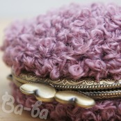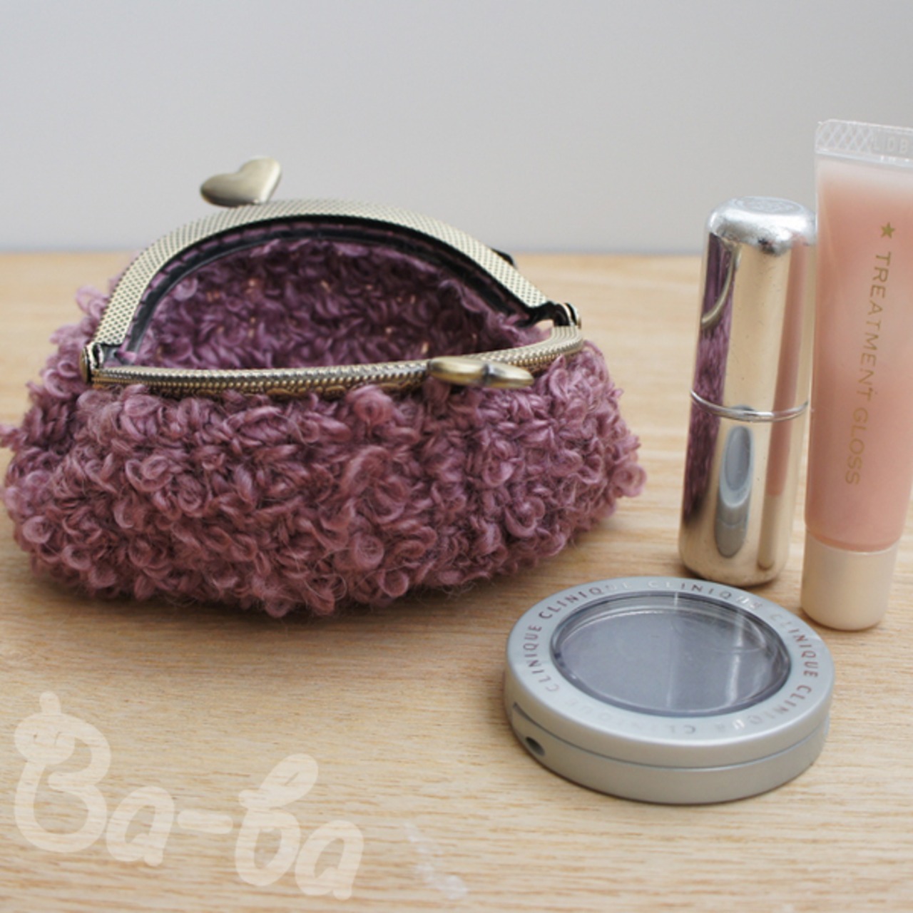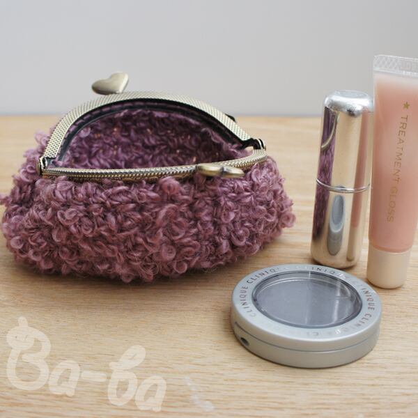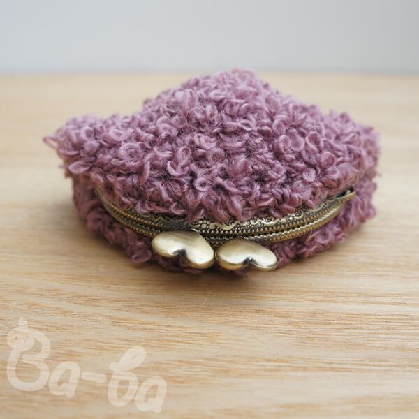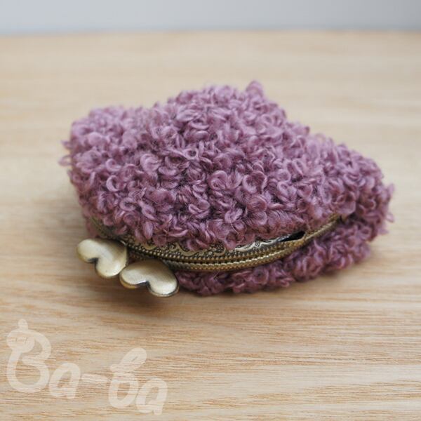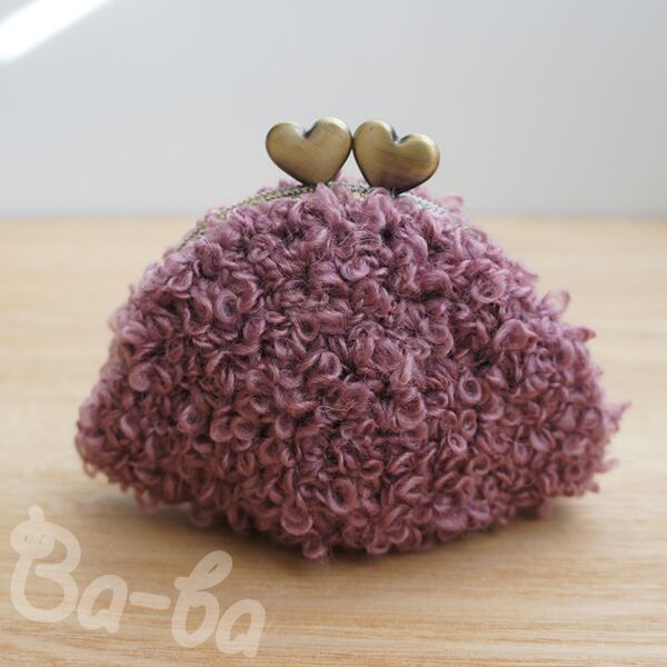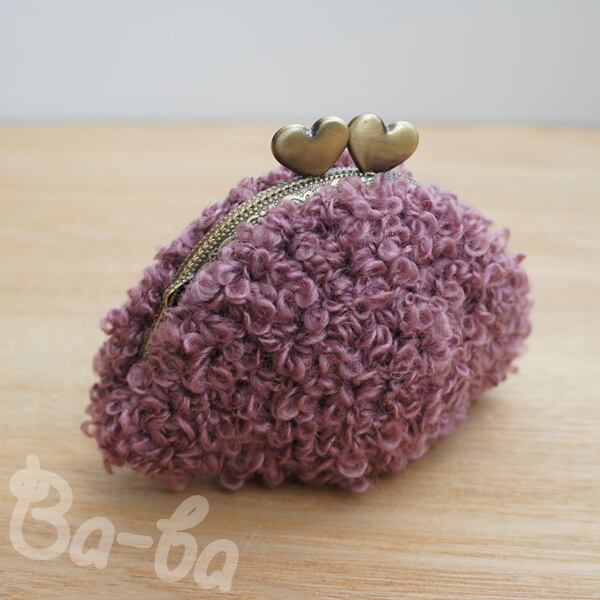 シックなモーヴピンクのループヤーンをふんわりと編み上げ、ハートつまみの口金と組み合わせました。
