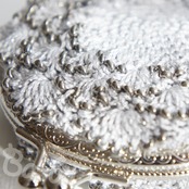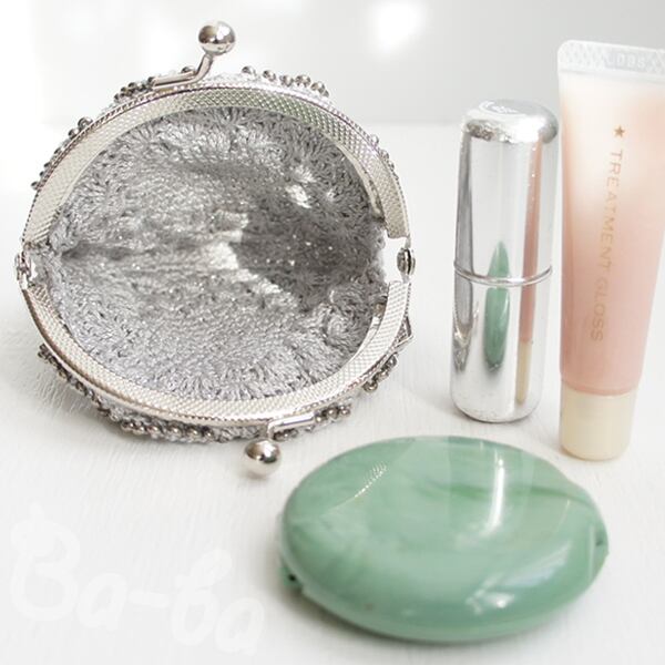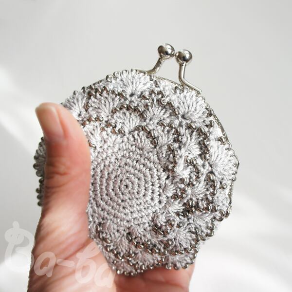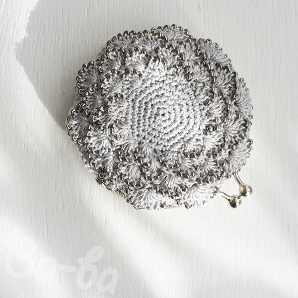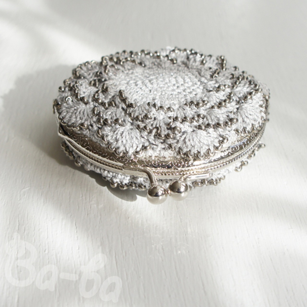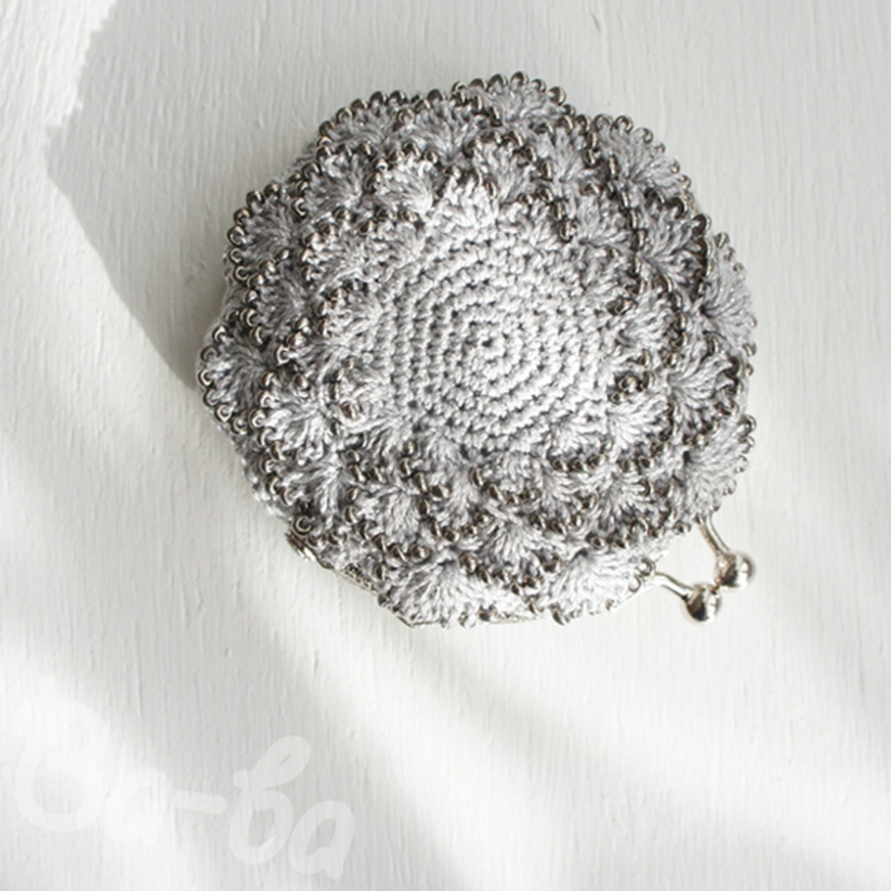 編みがま口の軽量さと、銀色ビーズの輝きを両方取り入れた作品です。