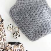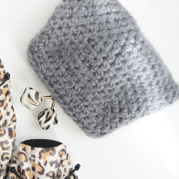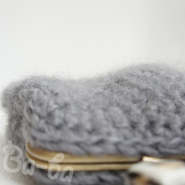 やさしいグレーのロービングヤーン(甘より)をふんわりと編み上げ、