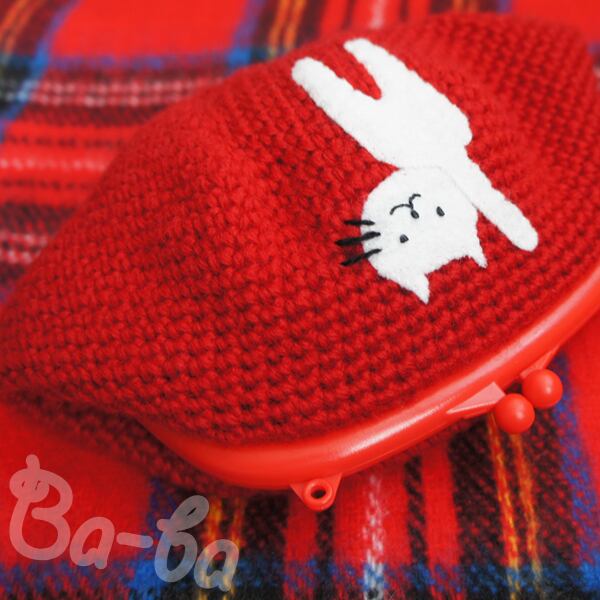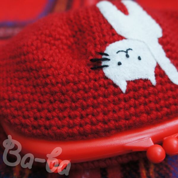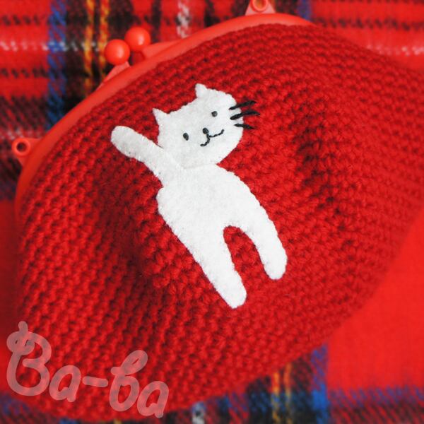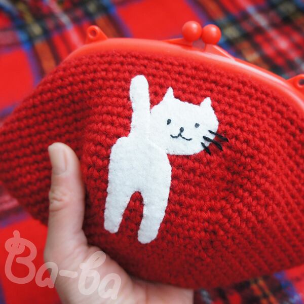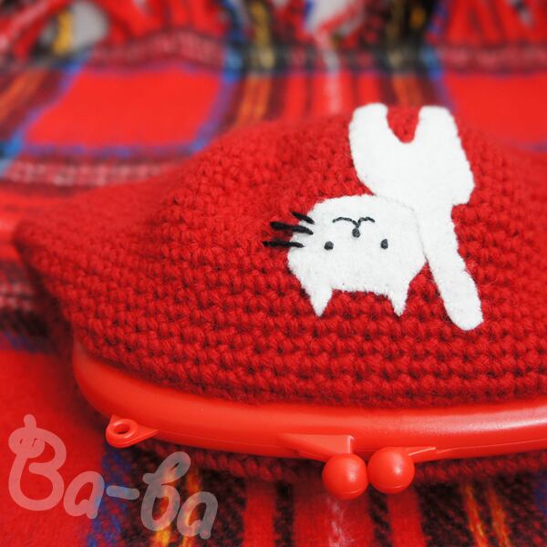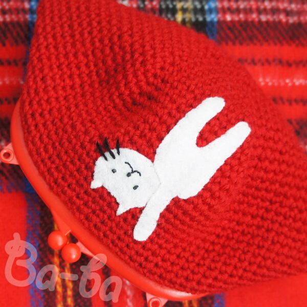 シンプル&真っ赤な編み地のがま口に、シロのアップリケをしました。