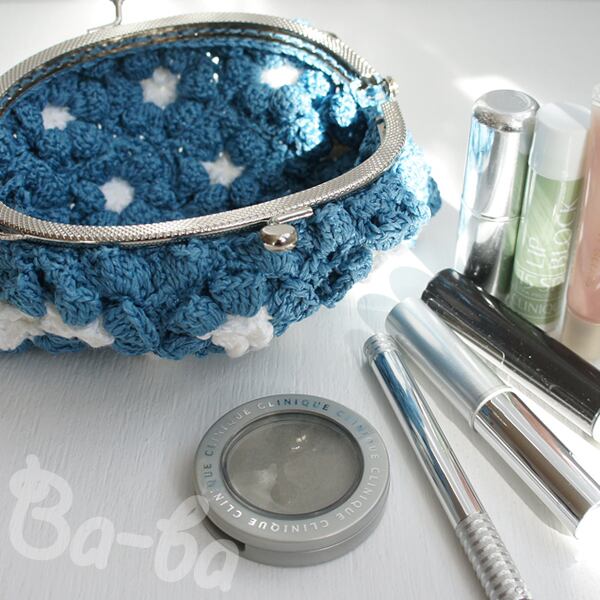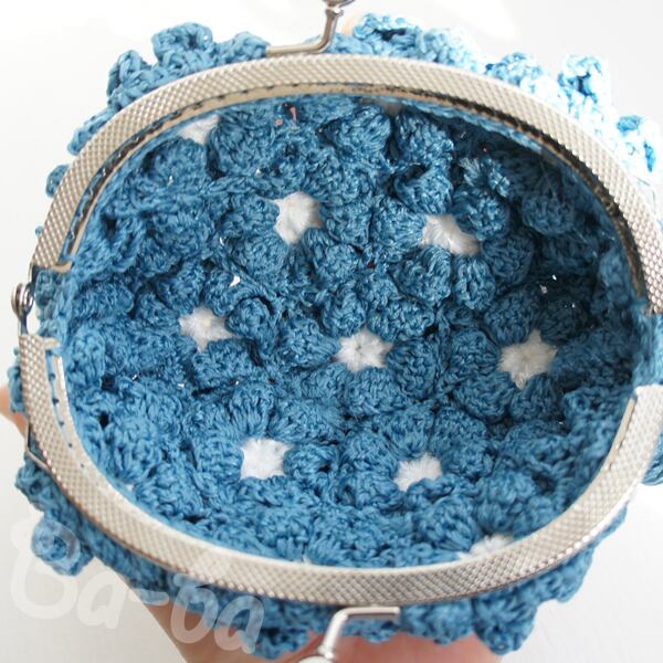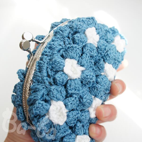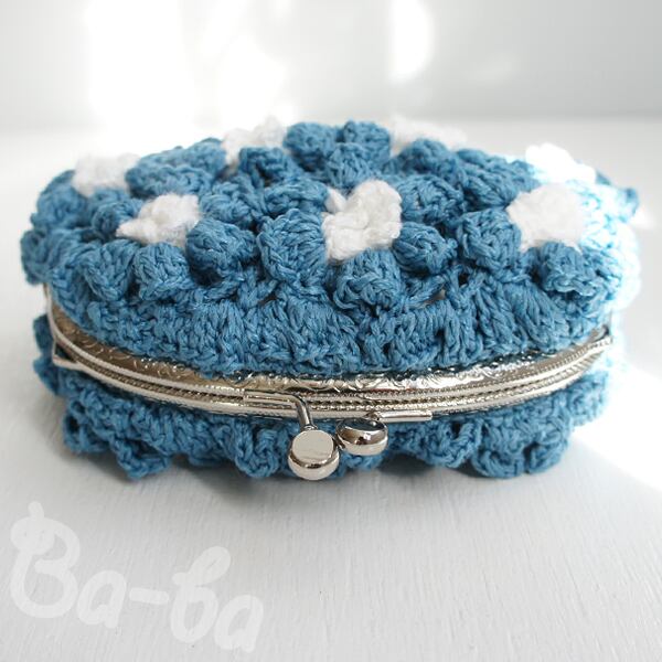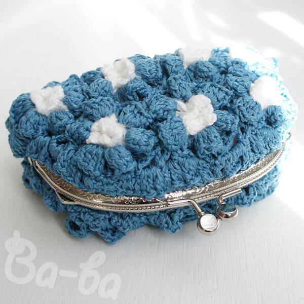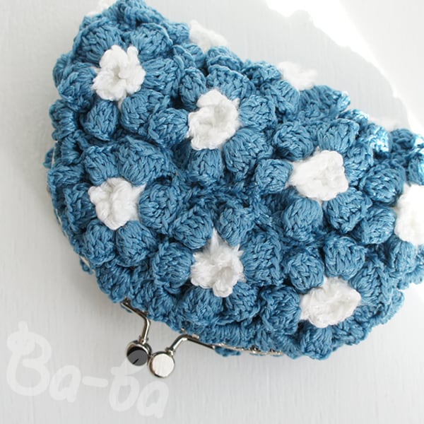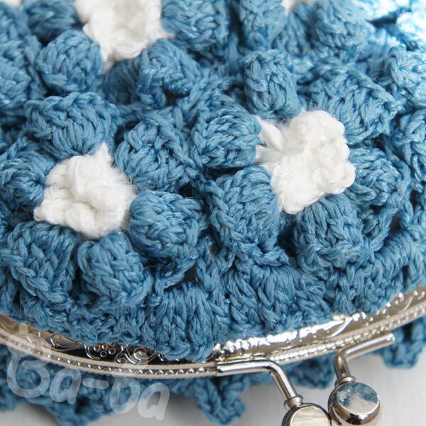ばあば作、ポピーパフ編みのがま口(blue flower・C1409)
