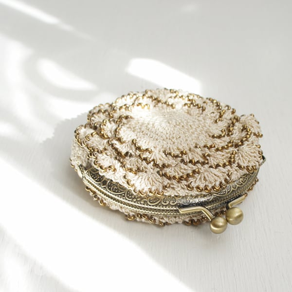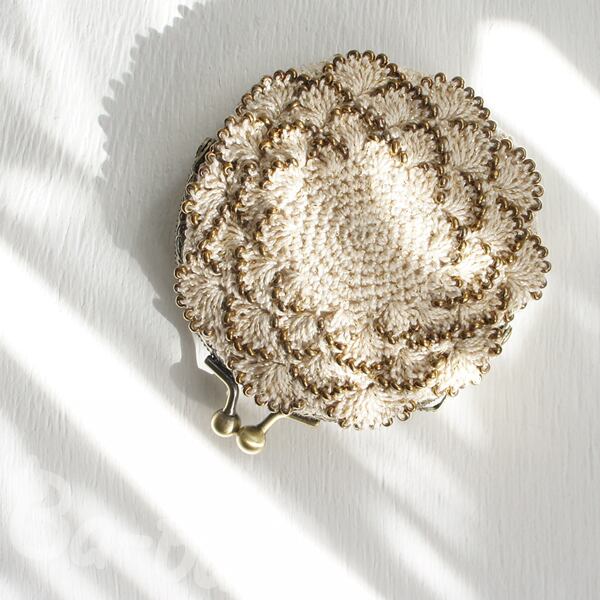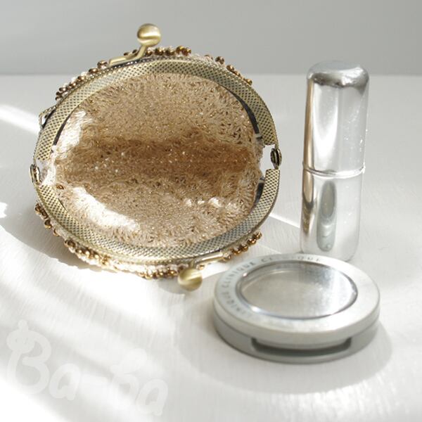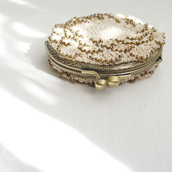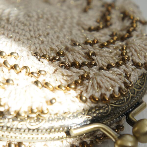 編みがま口の軽量さと、金色ビーズの輝きを両方取り入れた作品です。