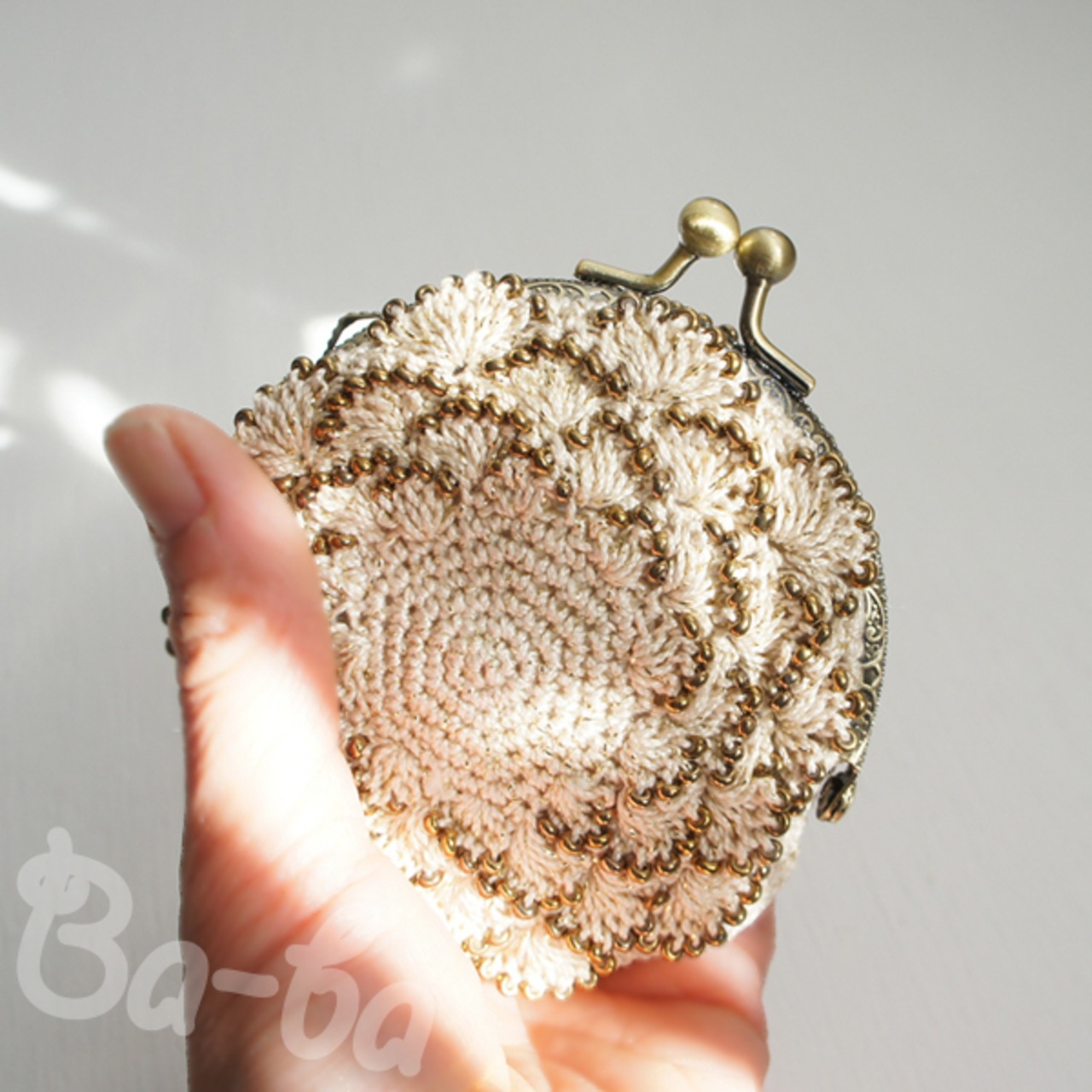 ばあば作、ビーズ入り松編み・まるまるがま口(アンティークゴールド・C1414)