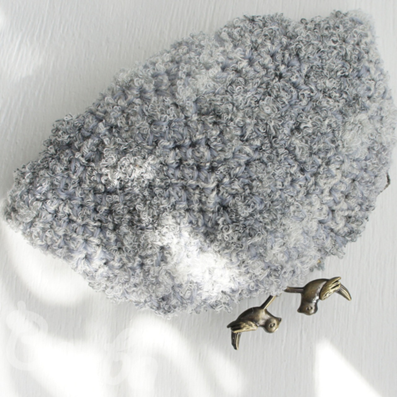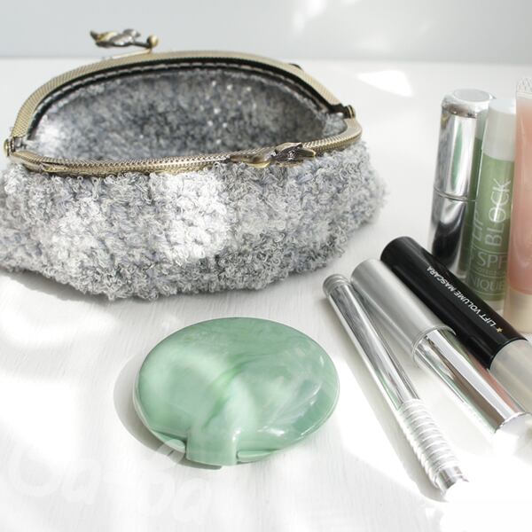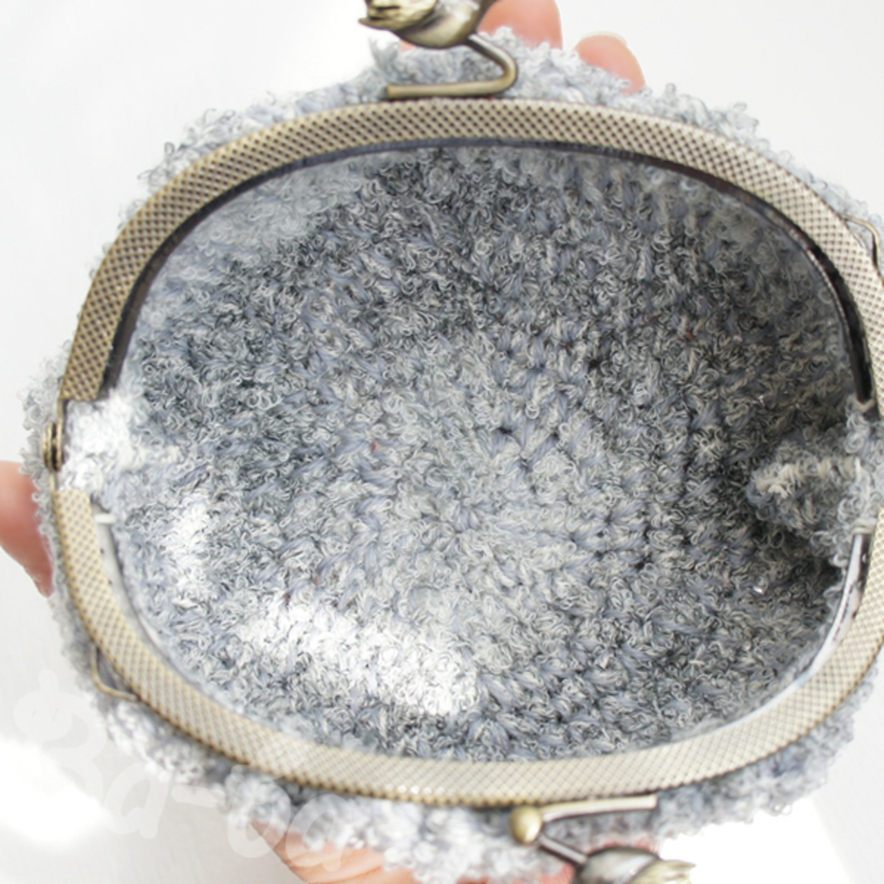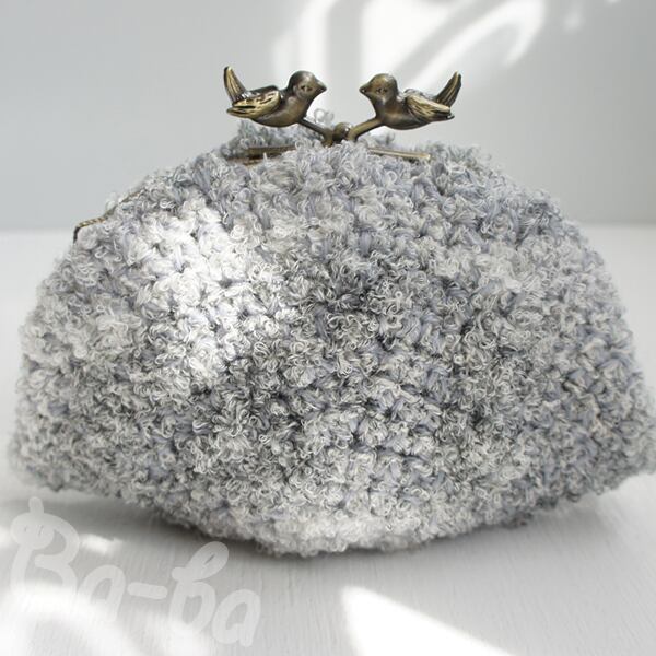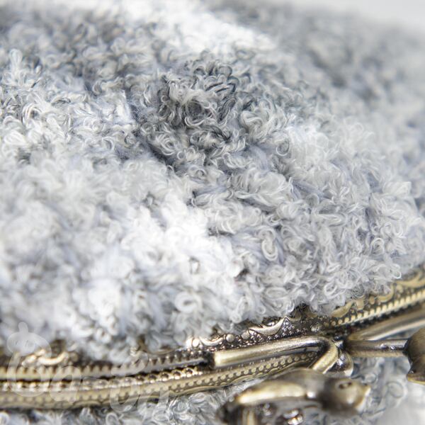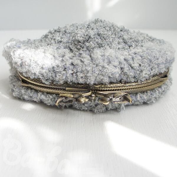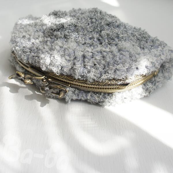 グレー系段染めのふわふわ毛糸を細編みで編み上げ、がま口に仕上げました。