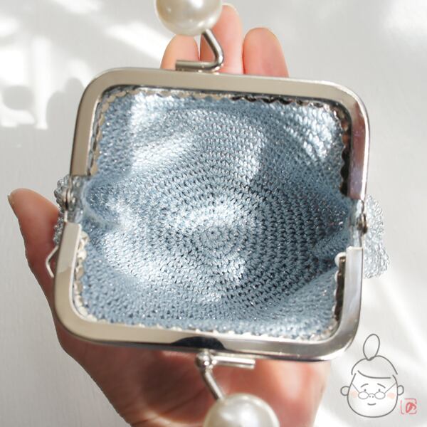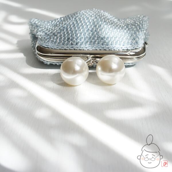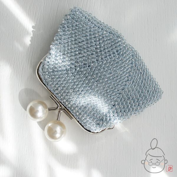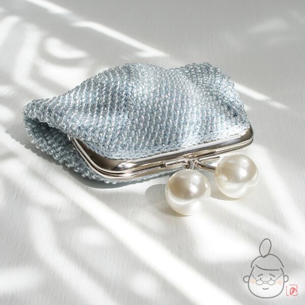 ばあば作☆☆総ガラスビーズの「大きめパール」スクエアがま口(bleu clair・1435)