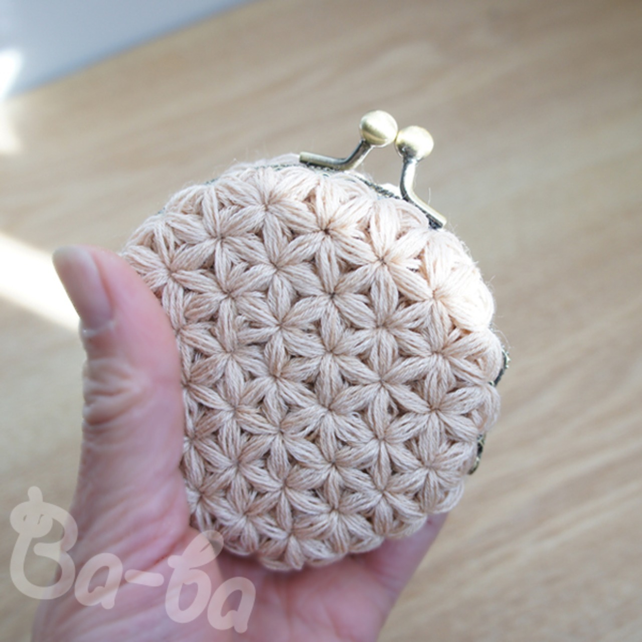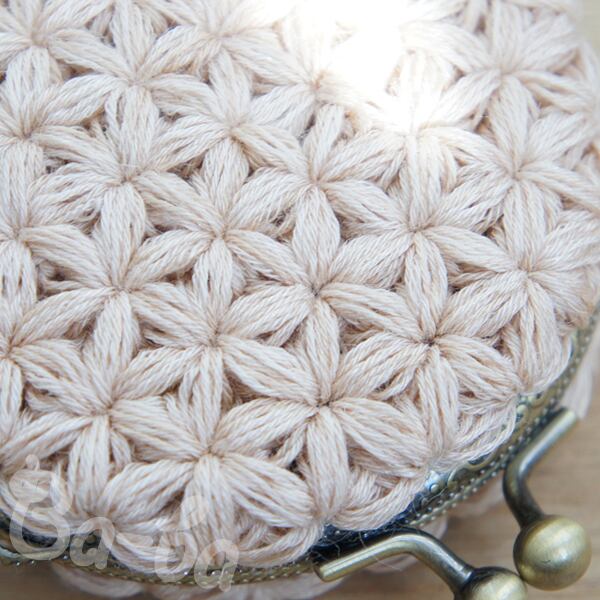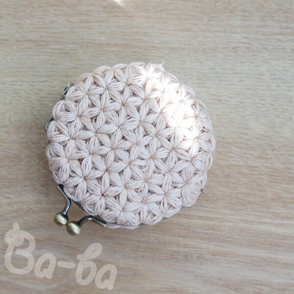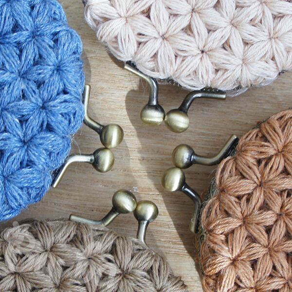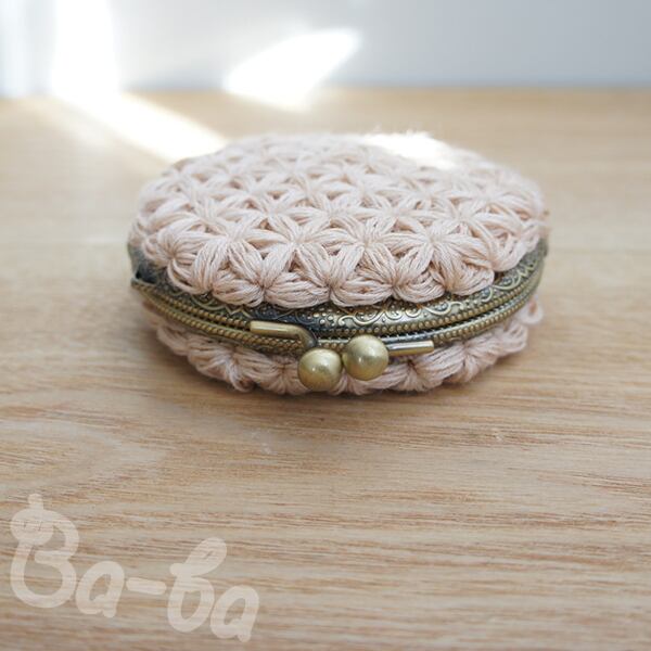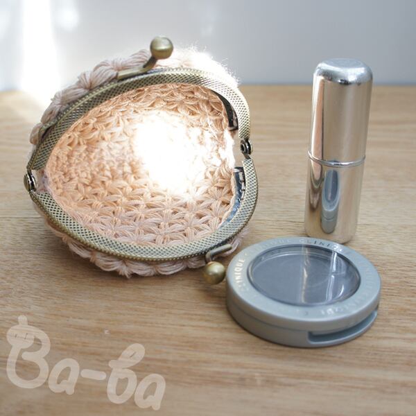 クリーム色の麻混紡糸をふんわりと編み上げ、シンプルな口金と組み合わせました。
