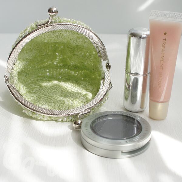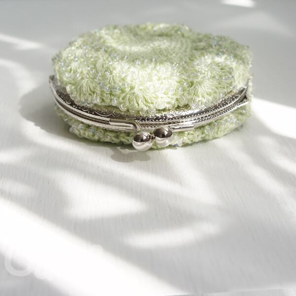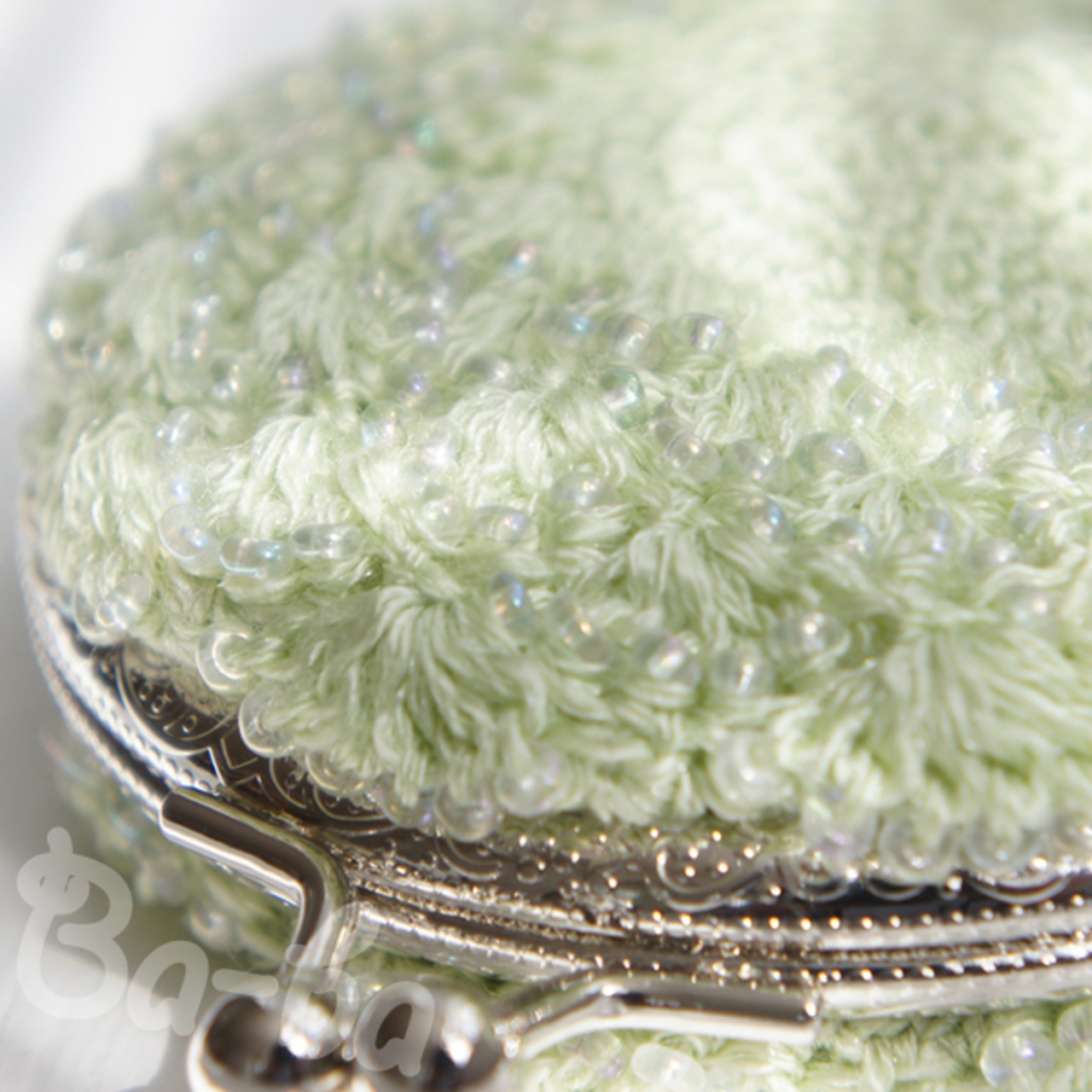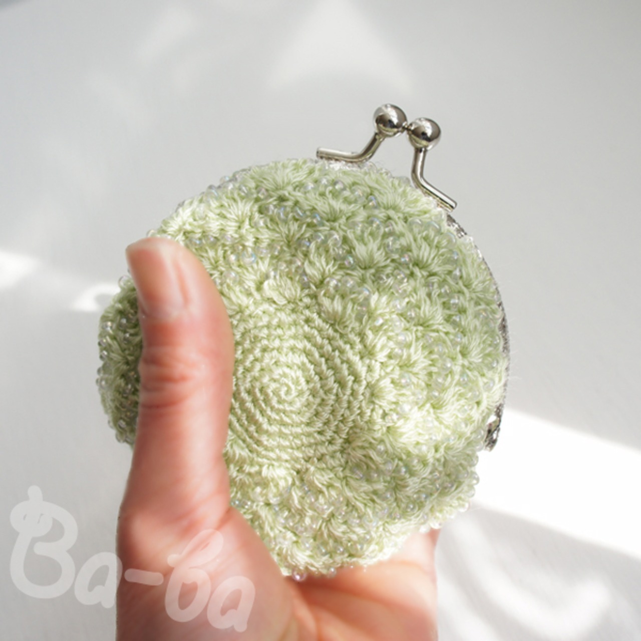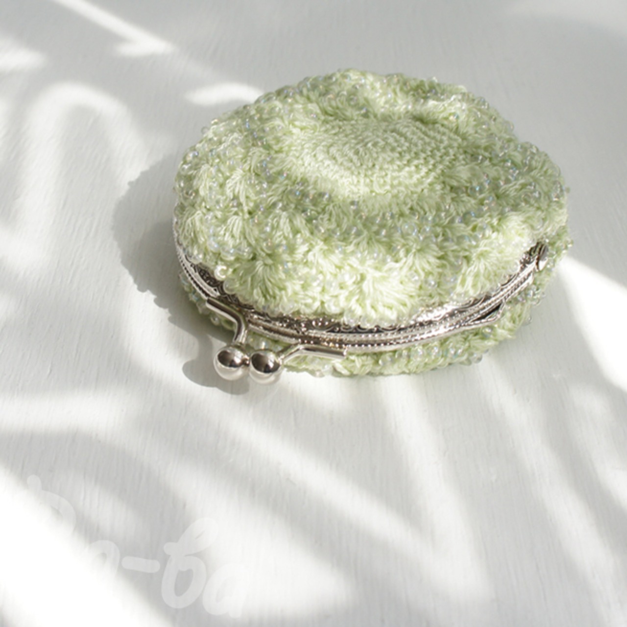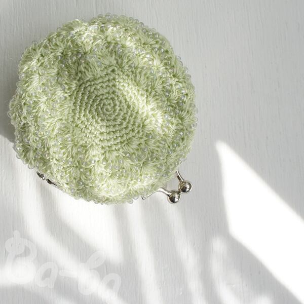 ばあば作、ビーズ入り松編み・まるまるがま口(vert clair・C1428)
