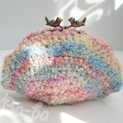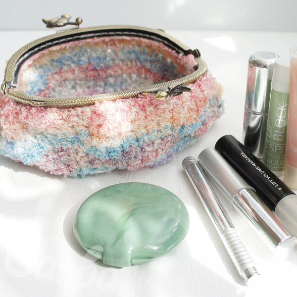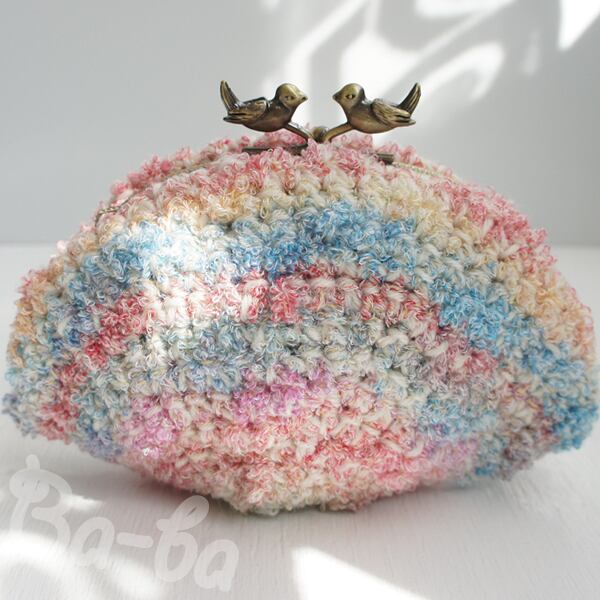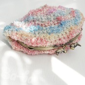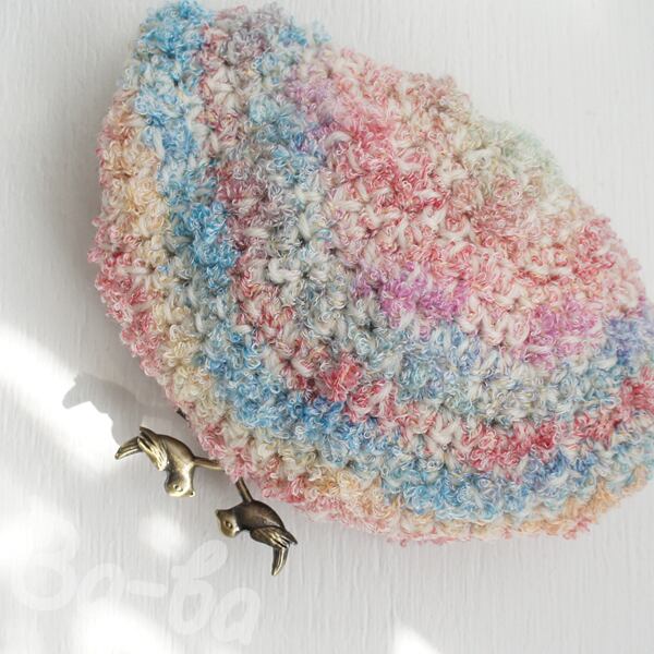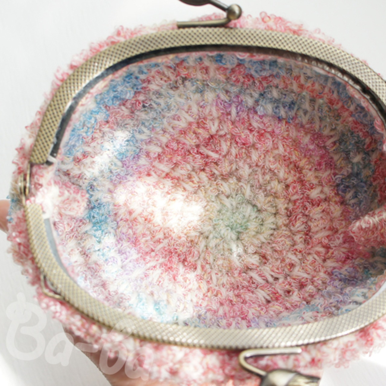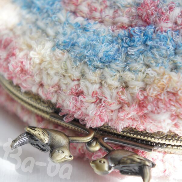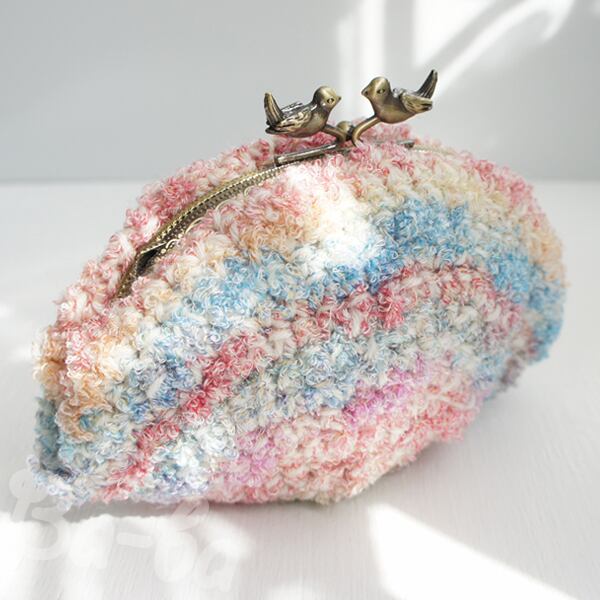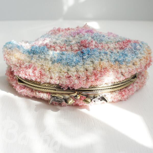 虹色段染めのふわふわ毛糸を細編みで編み上げ、がま口に仕上げました。