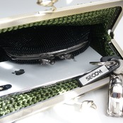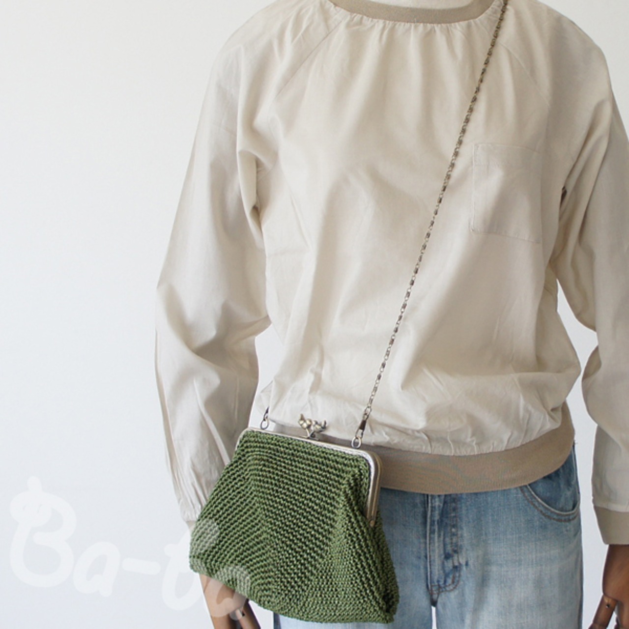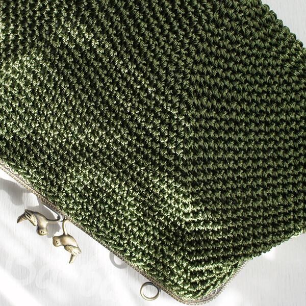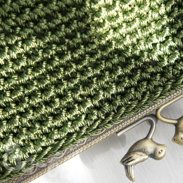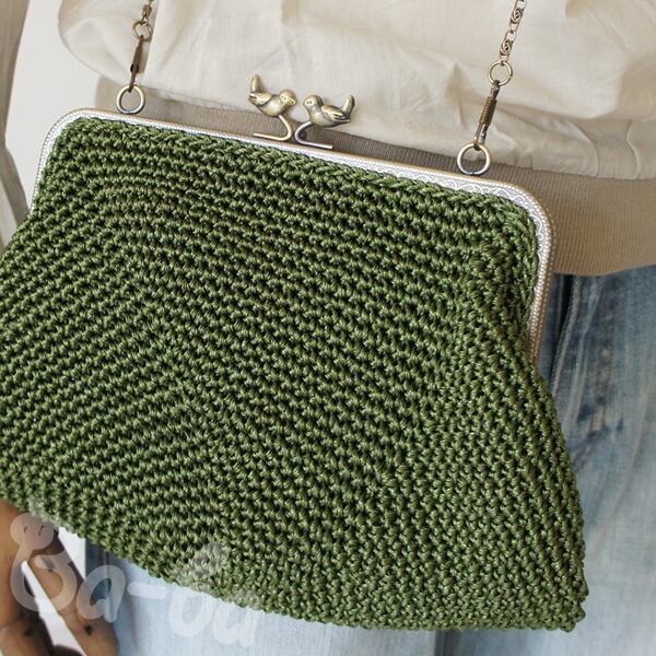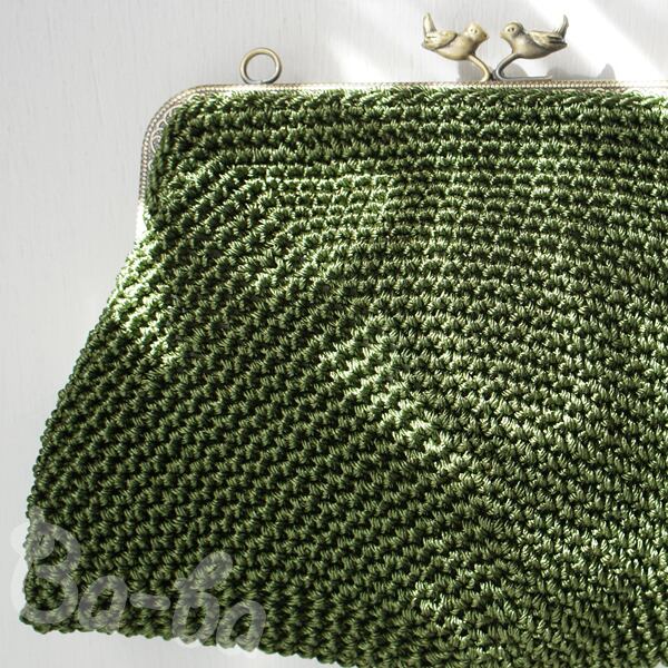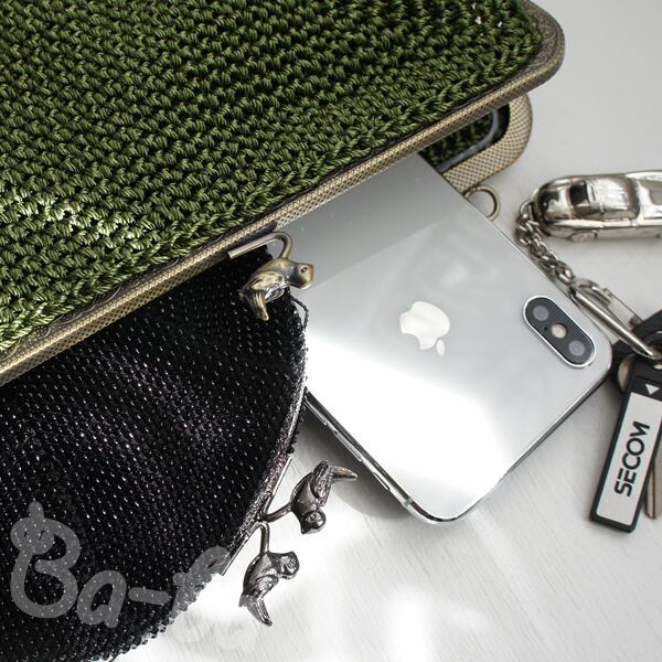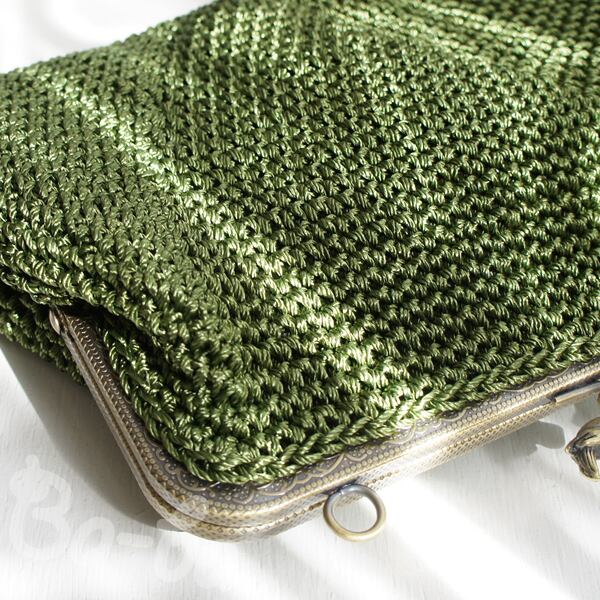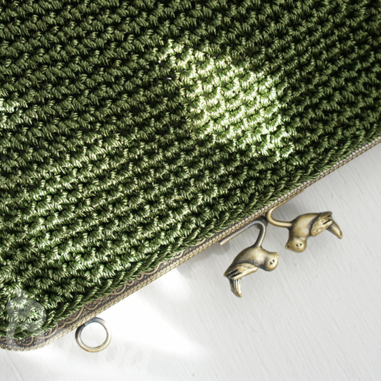 ツヤツヤの編み地に存在感のある小鳥つまみのスクエア口金を組み合わせました。