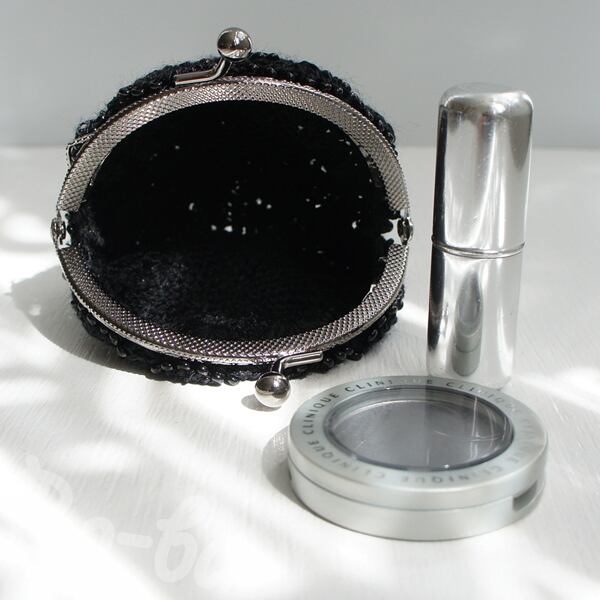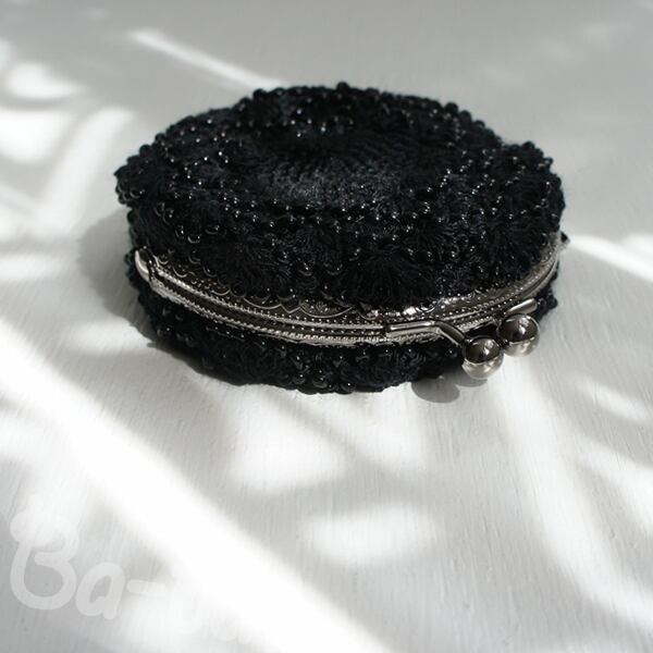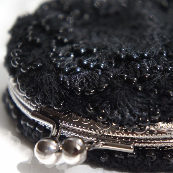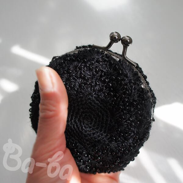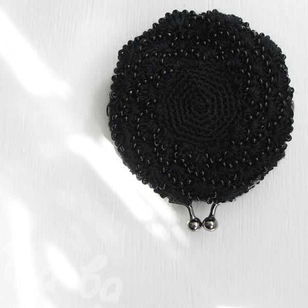 ばあば作、ビーズ入り松編み・まるまるがま口(noire・C1432)
