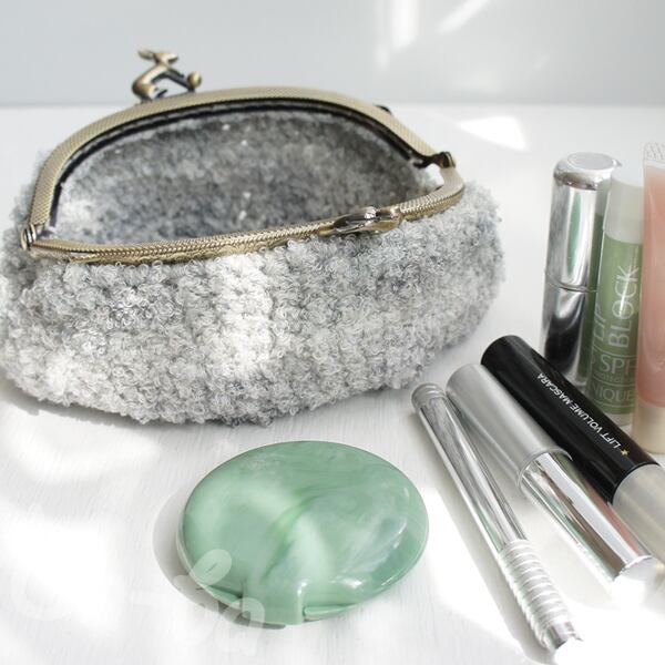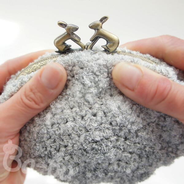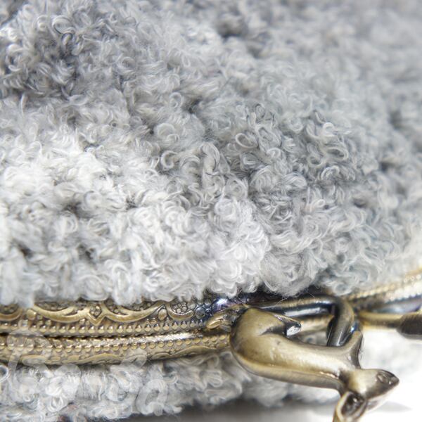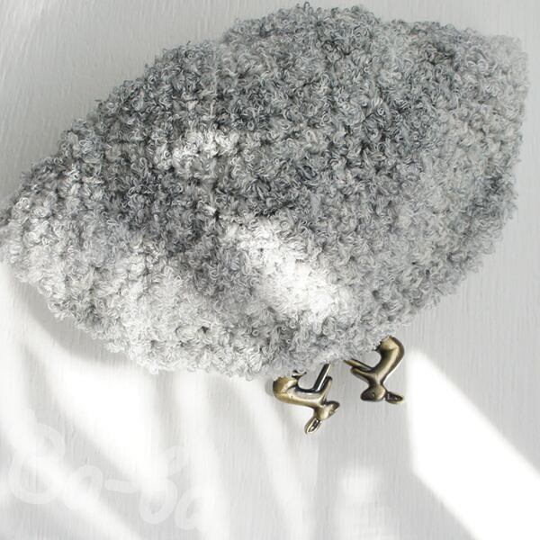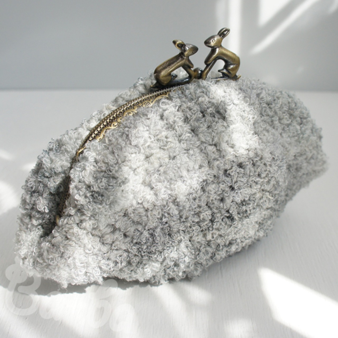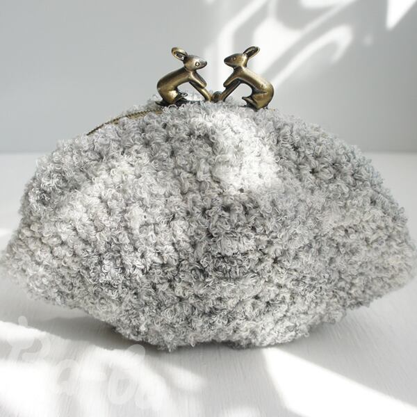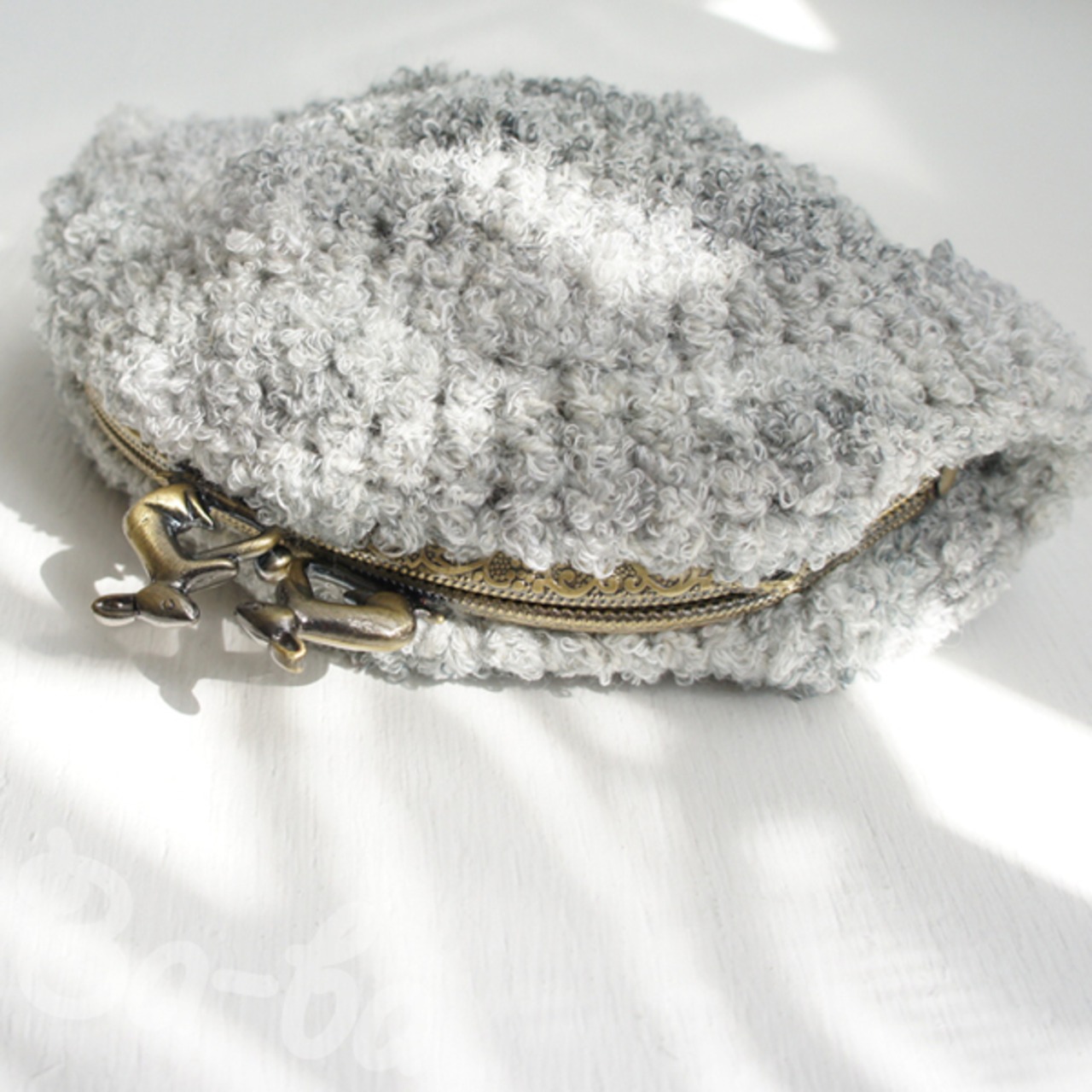 グレー&グラデーションのふわふわ毛糸を細編みで編み上げ、がま口に仕上げました。