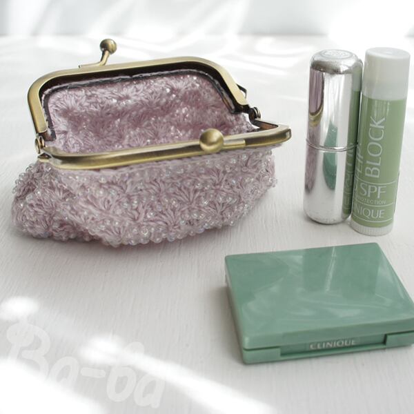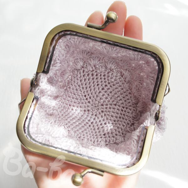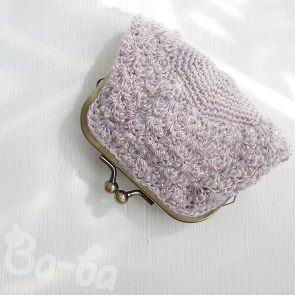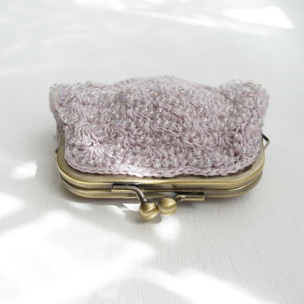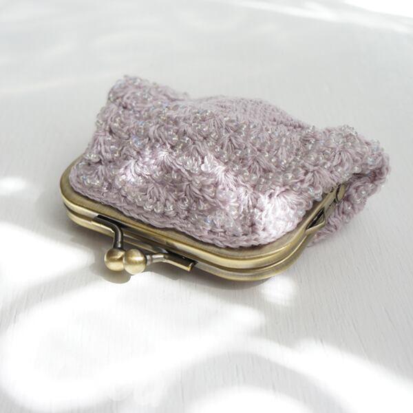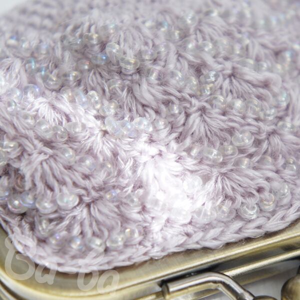 ばあば作、ビーズ入り松編みのスクエアがま口(lavender・C1435)