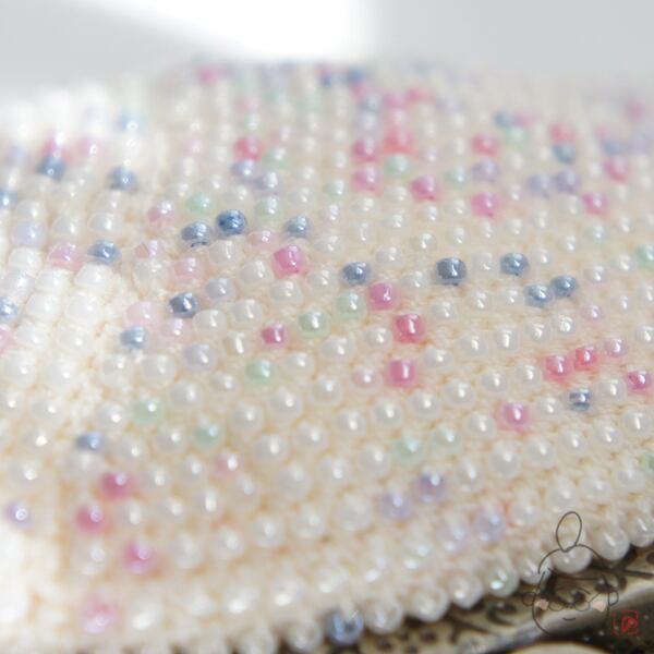 白、ピンク、パープル、ブルー、グリーン、、、パステルカラーをミックスし、ひとつぶづつ全面に編み込みました。