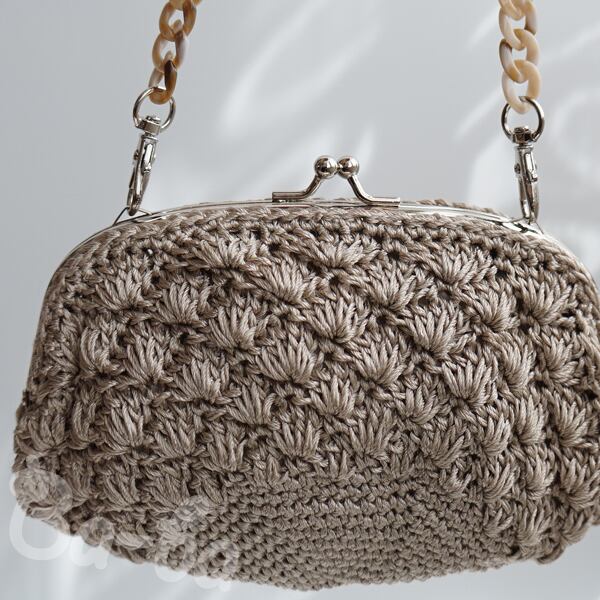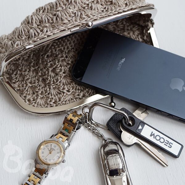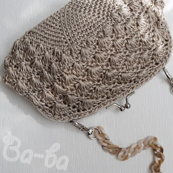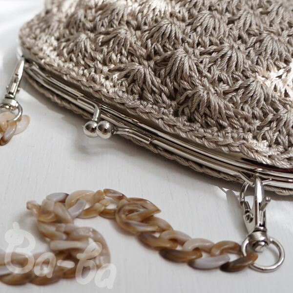 絹混紡の糸を松編みでふんわりと編み上げ、シンプルな口金を合わせました。