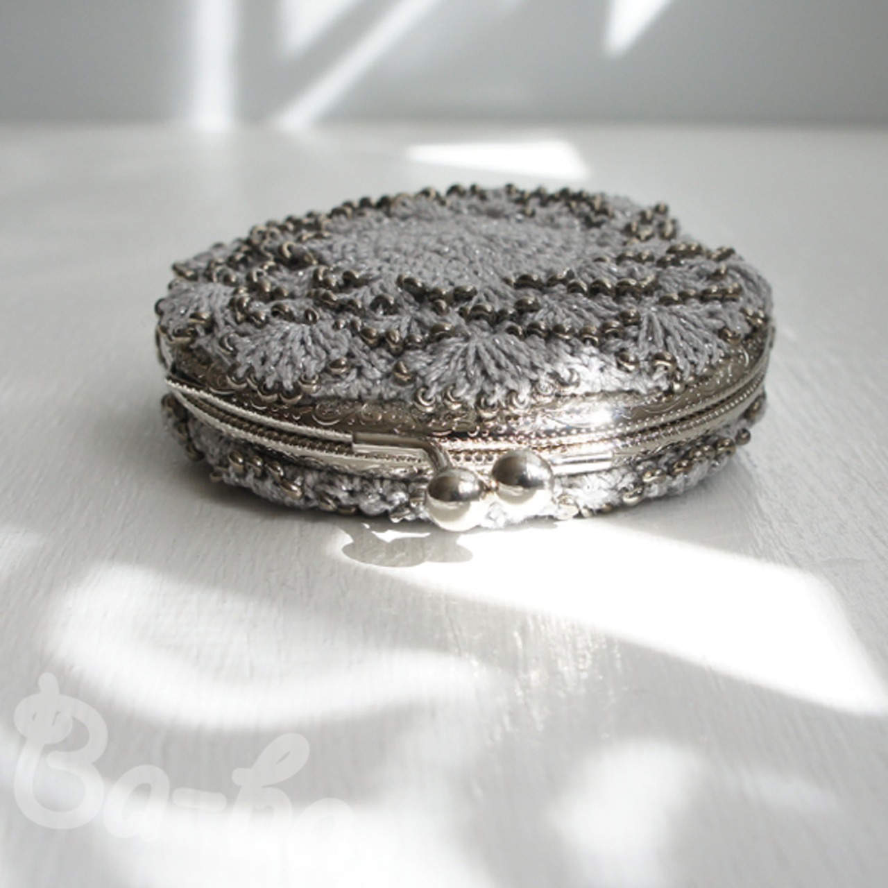 ばあば作、ビーズ入り松編み・まるまるがま口(cool silver・C1431)