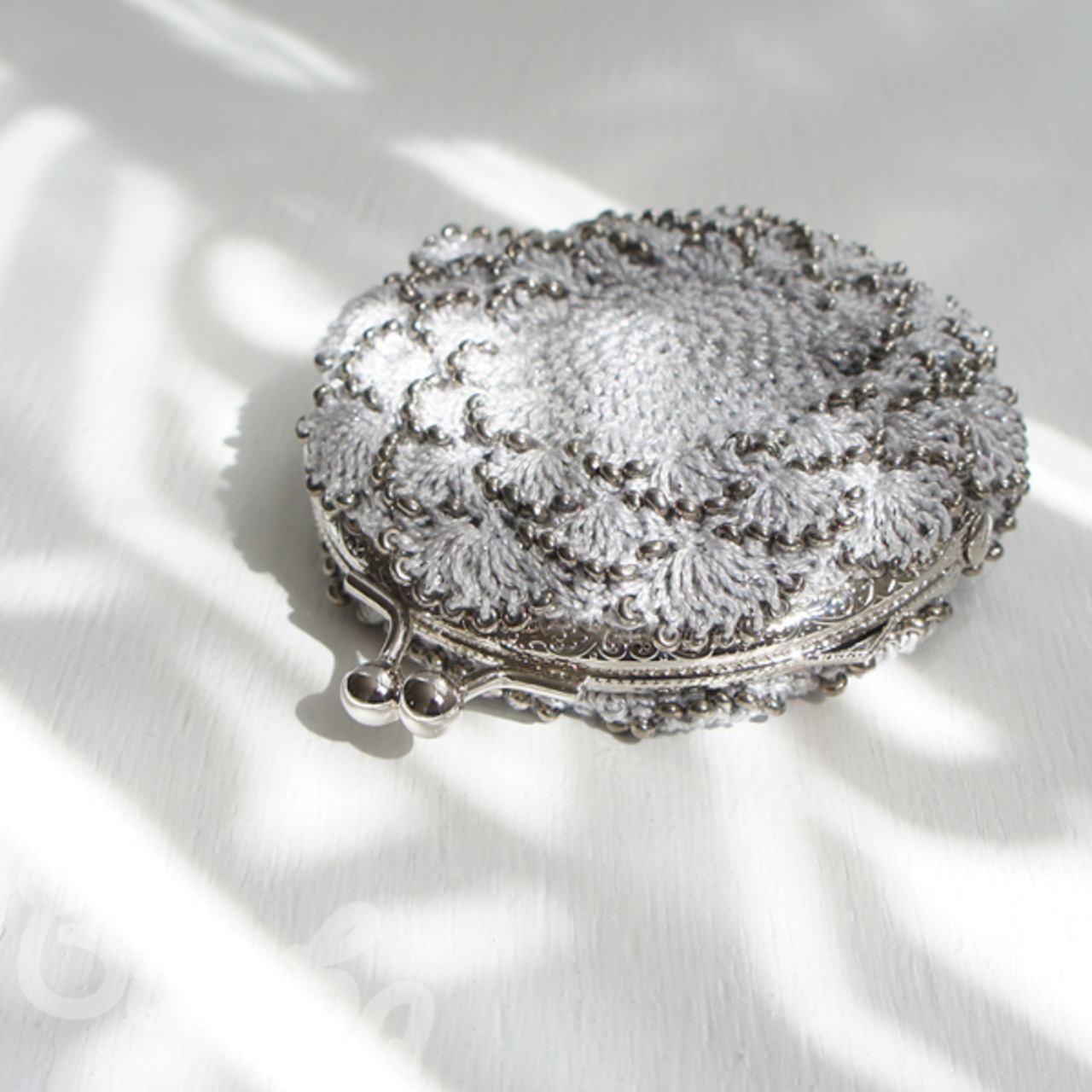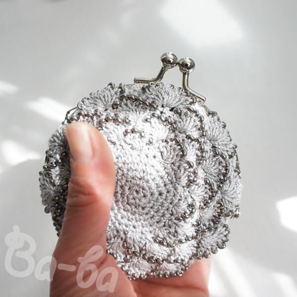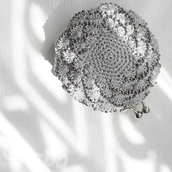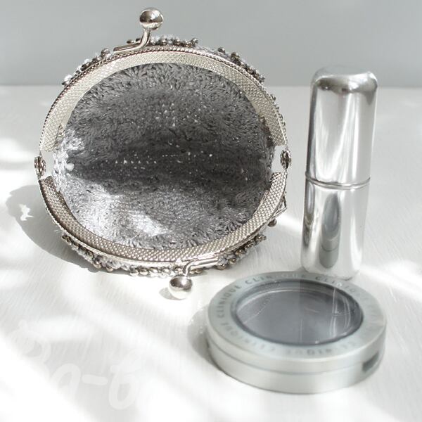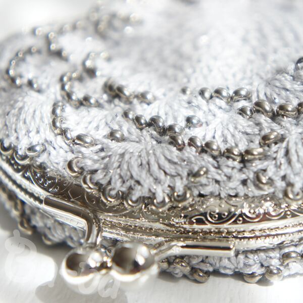 編みがま口の軽量さと、シルバービーズの輝きを両方取り入れた作品です。