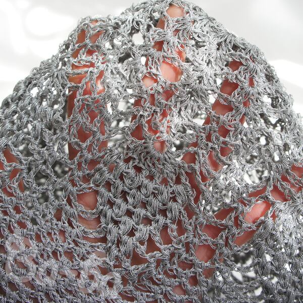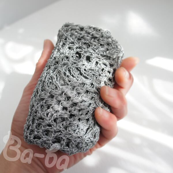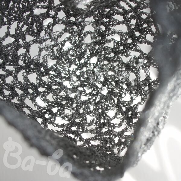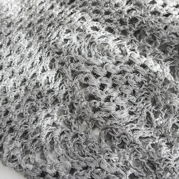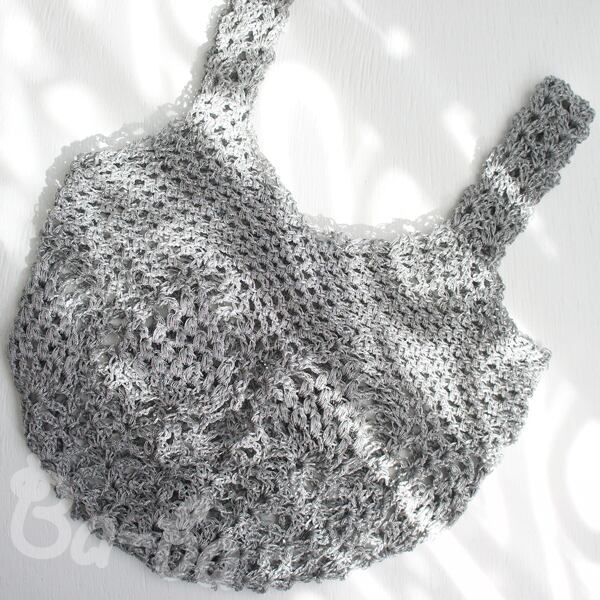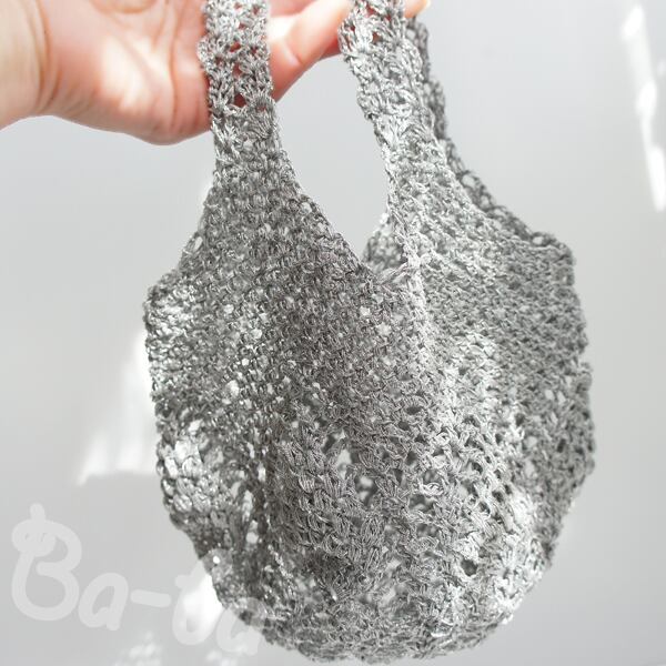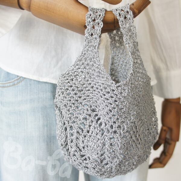 キラキラシルバーの混紡糸を編み込んで小さな手さげ袋にしました。。