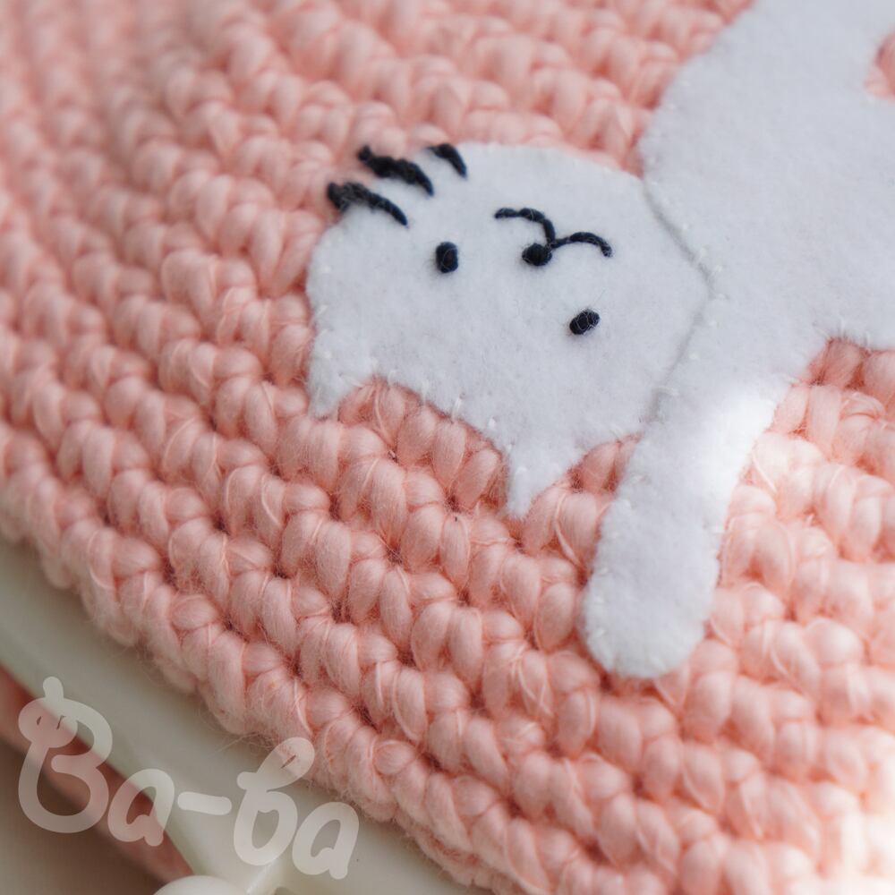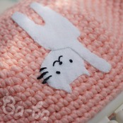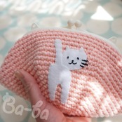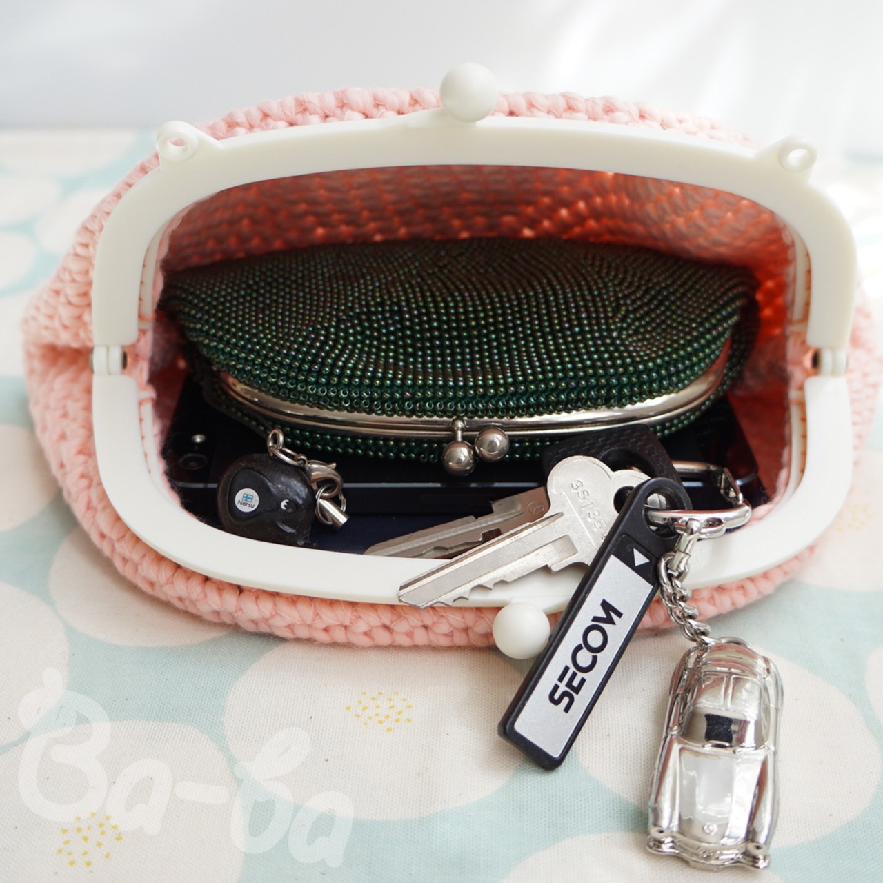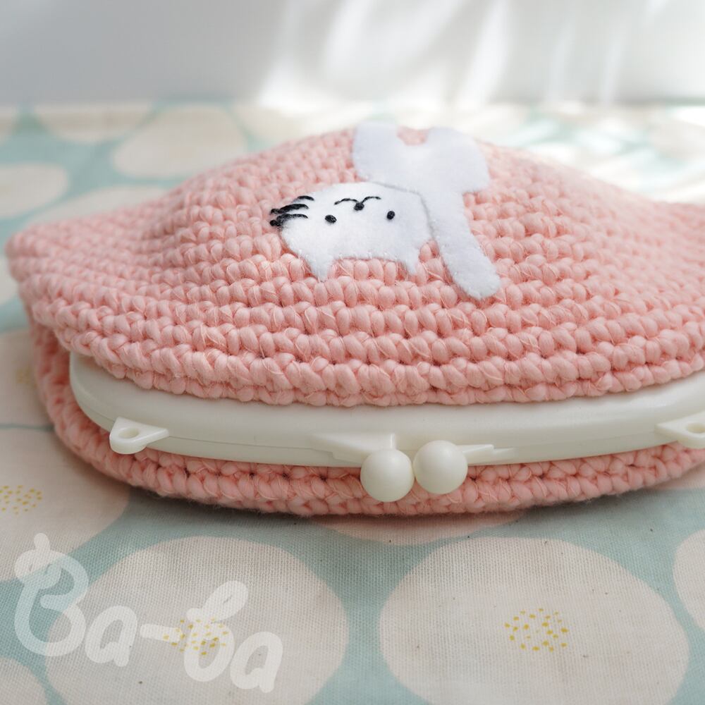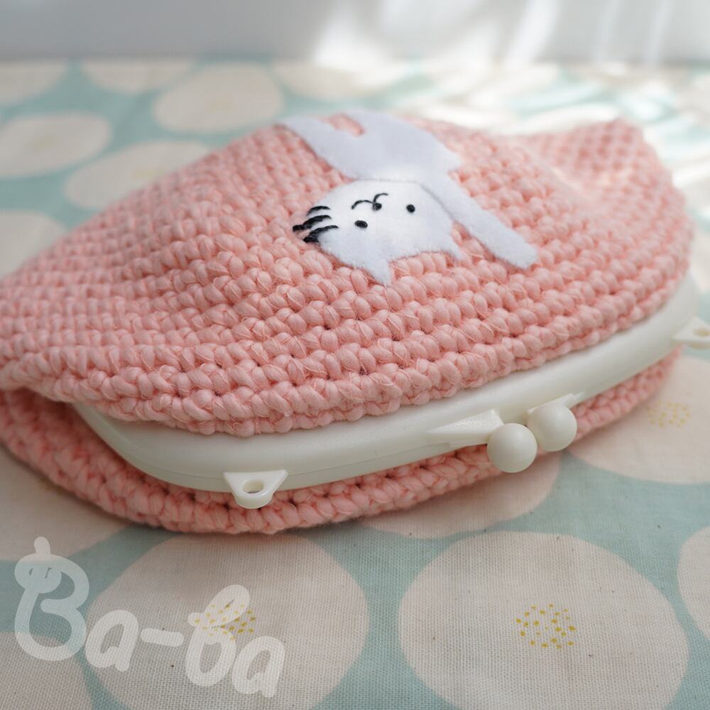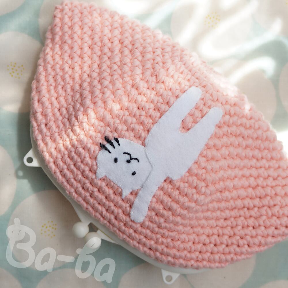 シンプル&ピンク色の編み地のがま口に、シロのアップリケをしました。
