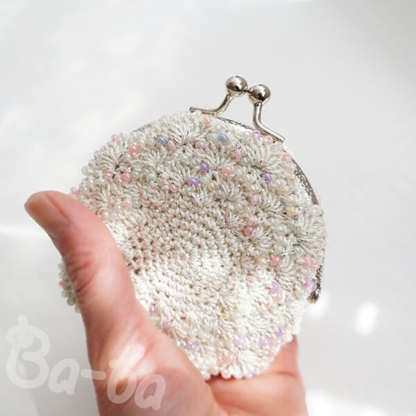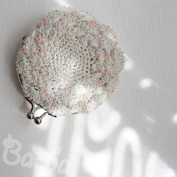 ばあば作、ビーズ入り松編み・まるまるがま口(shiny pastel・C1442)