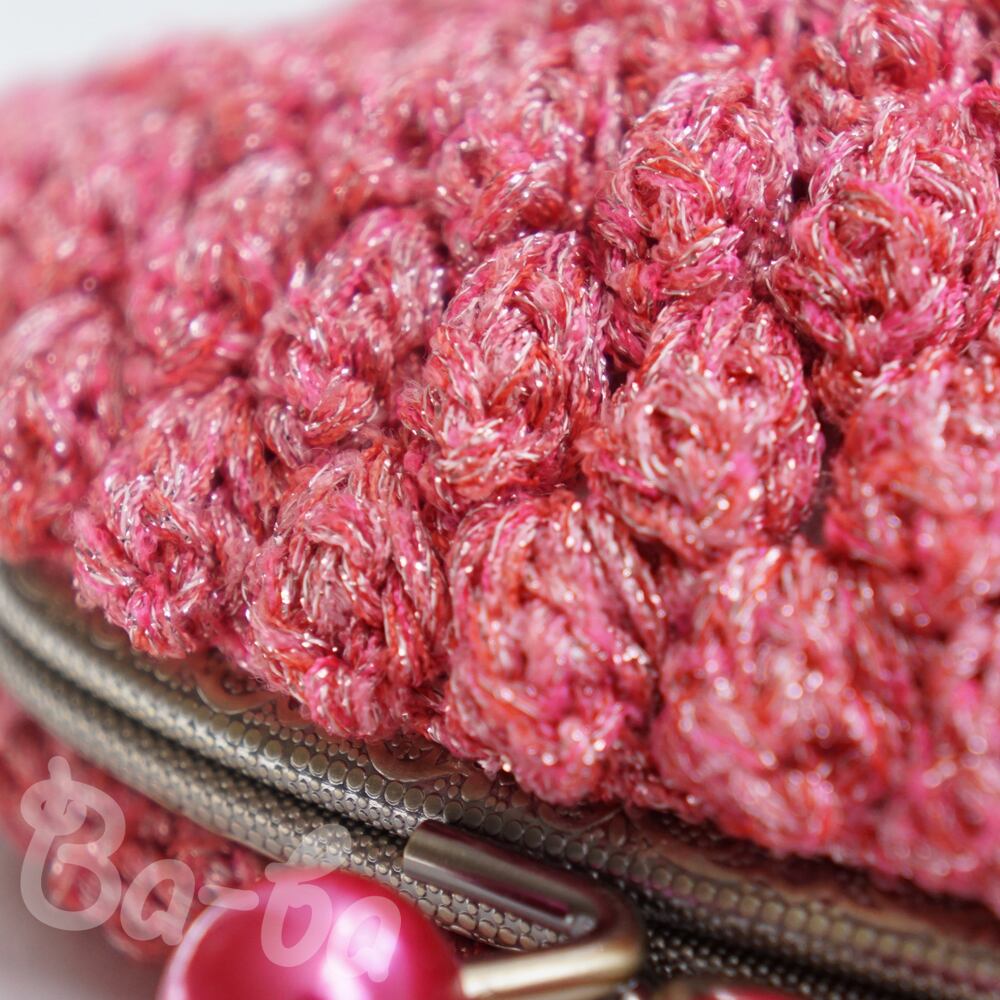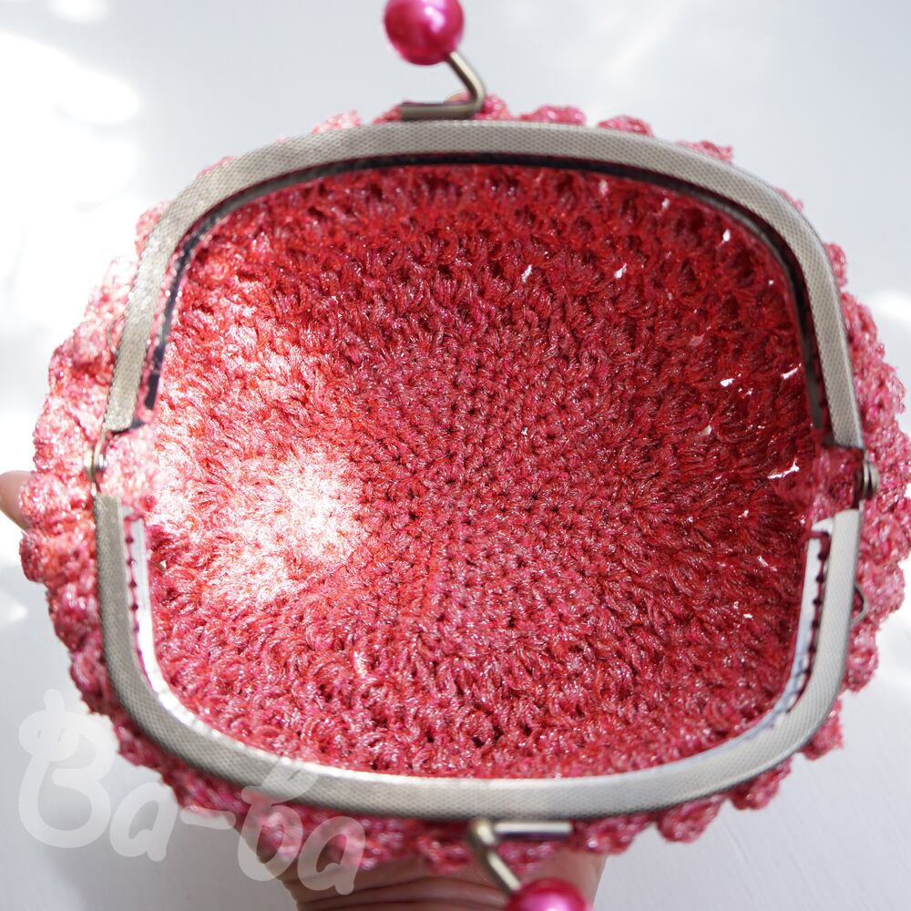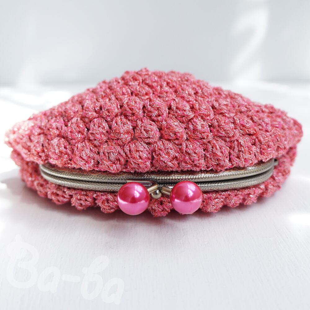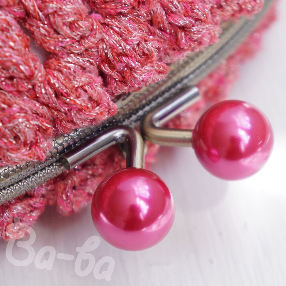 編み地と色を揃えたパールピンクのつまみ付き口金と組み合わせてキラキラ感をUPしました。