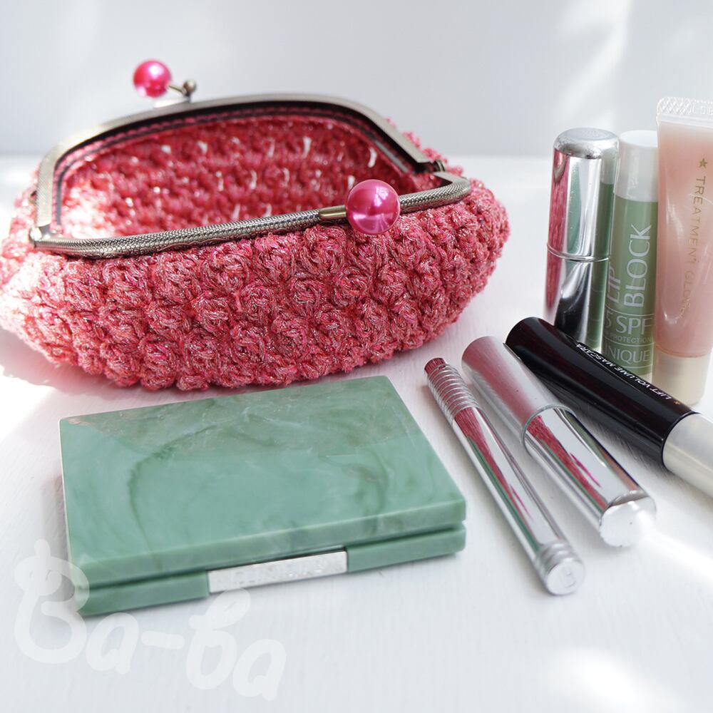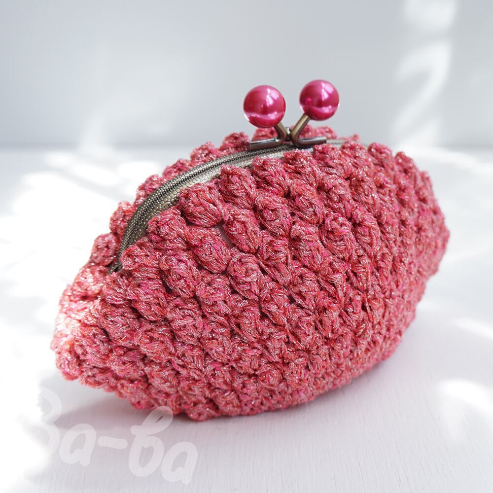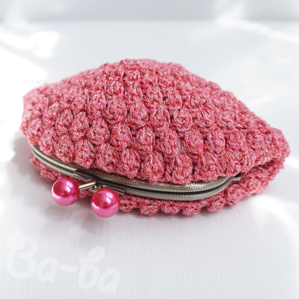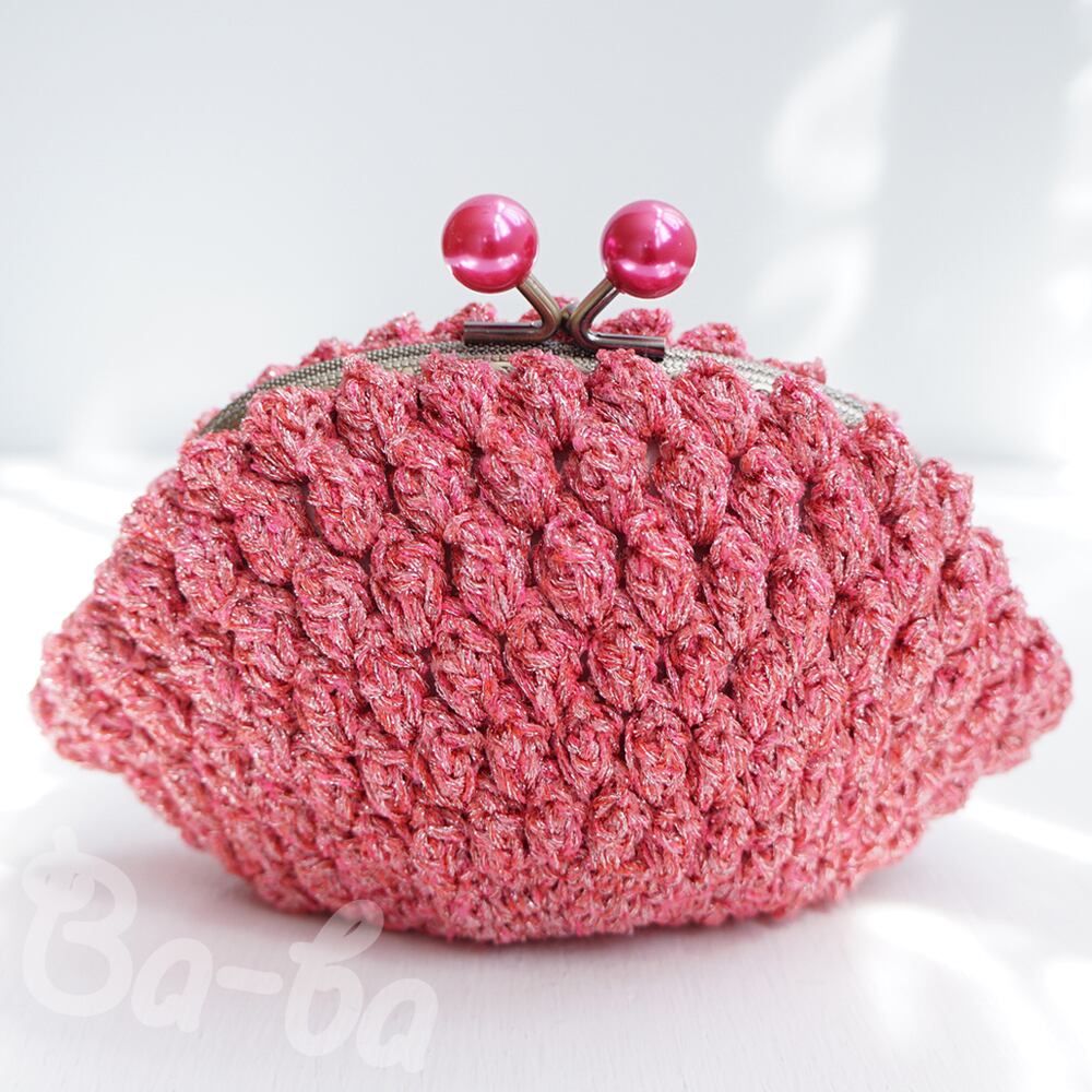 編み地と色を揃えたパールピンクのつまみ付き口金と組み合わせてキラキラ感をUPしました。