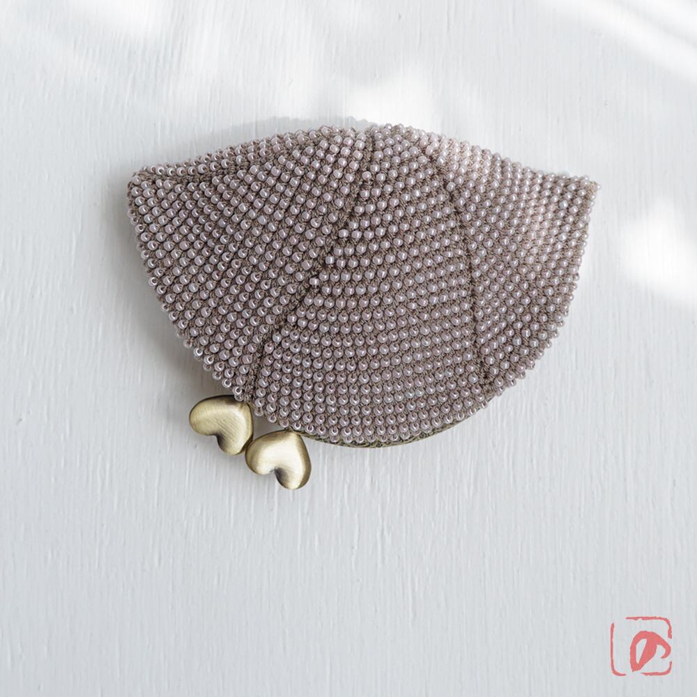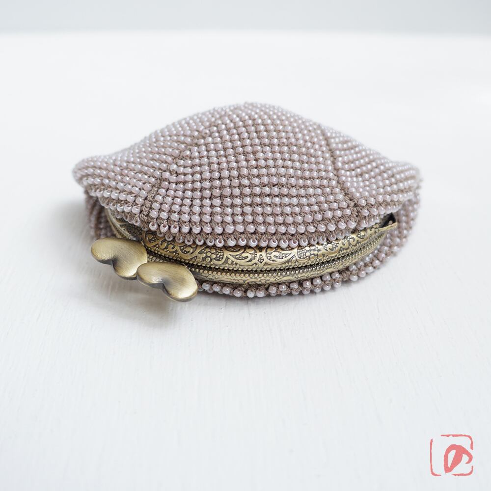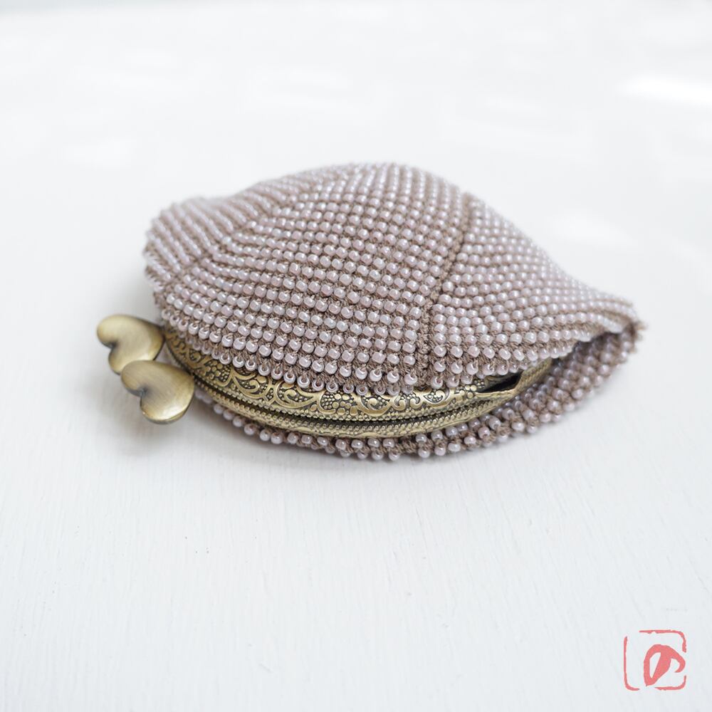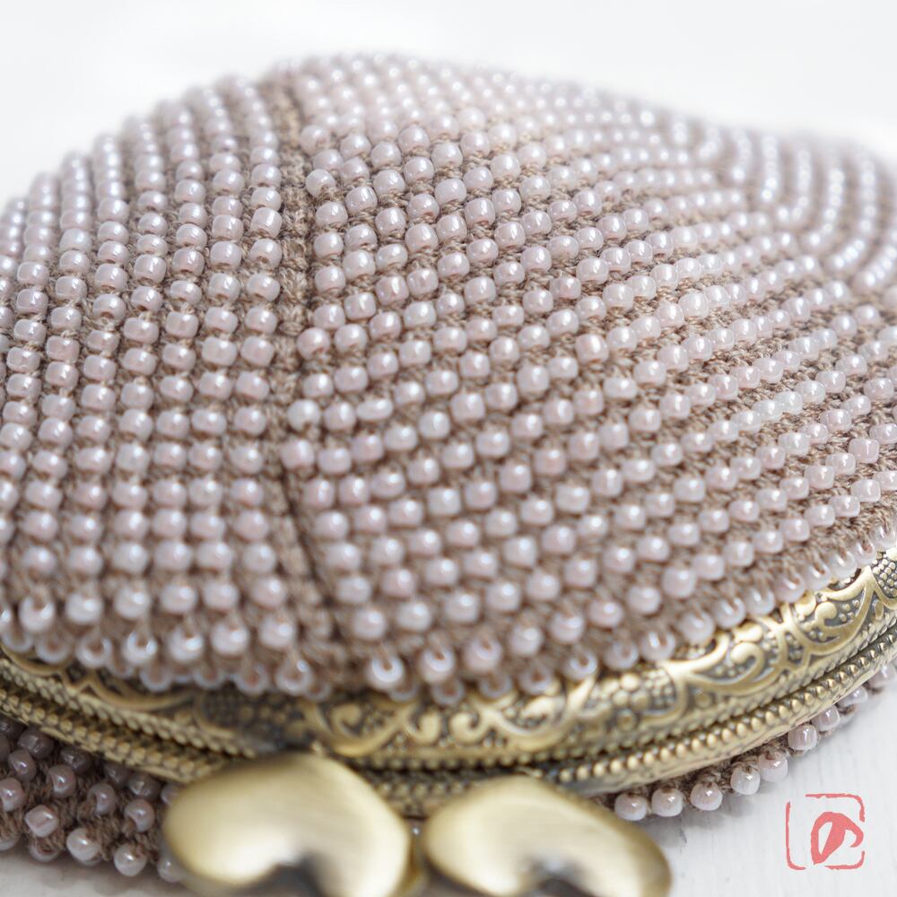 パールピンク2mmの日本製シードビーズをひとつぶづつ全面に編み込んだ、上質ながま口です。手触りなめらか、繊細な編み地が特徴です。