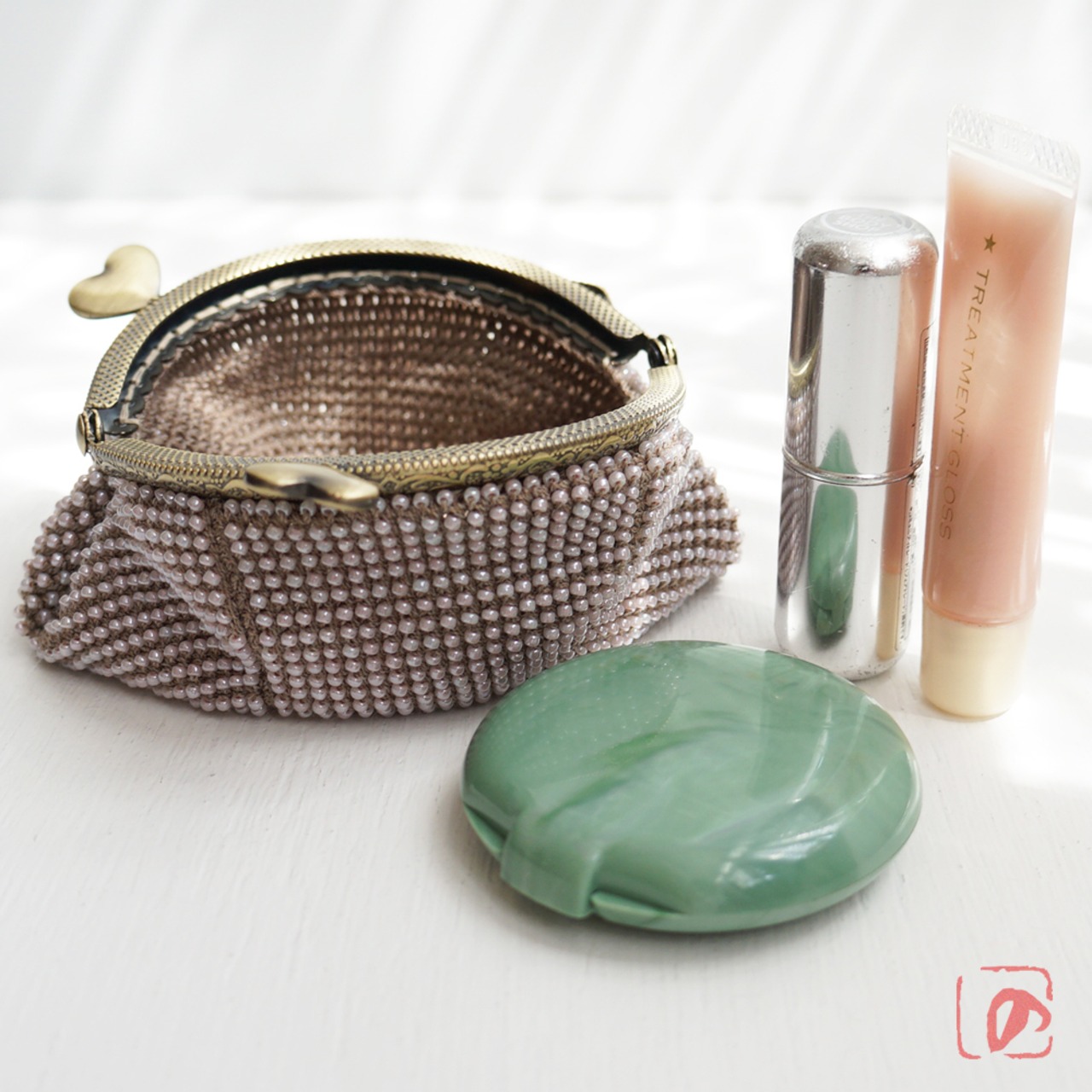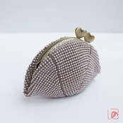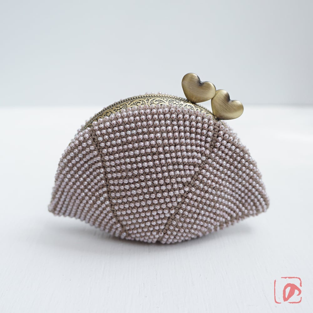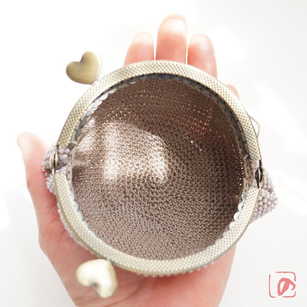 パールピンク2mmの日本製シードビーズをひとつぶづつ全面に編み込んだ、上質ながま口です。手触りなめらか、繊細な編み地が特徴です。