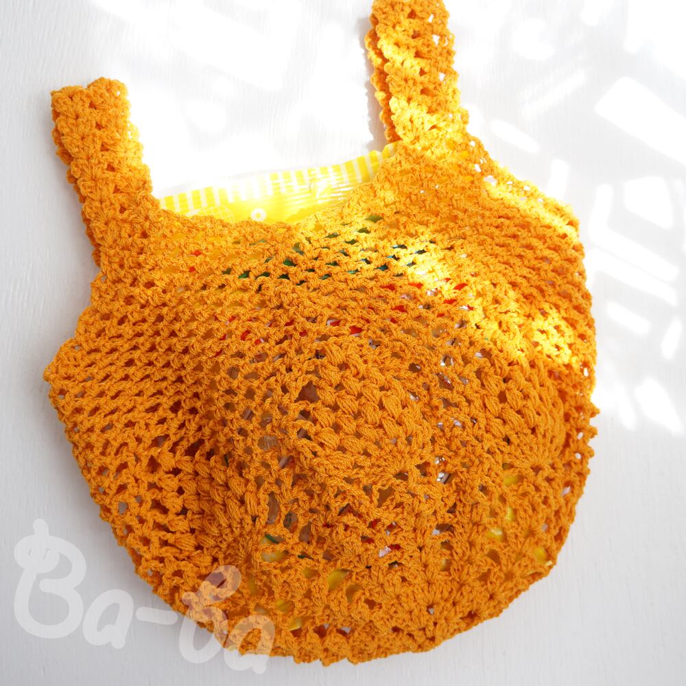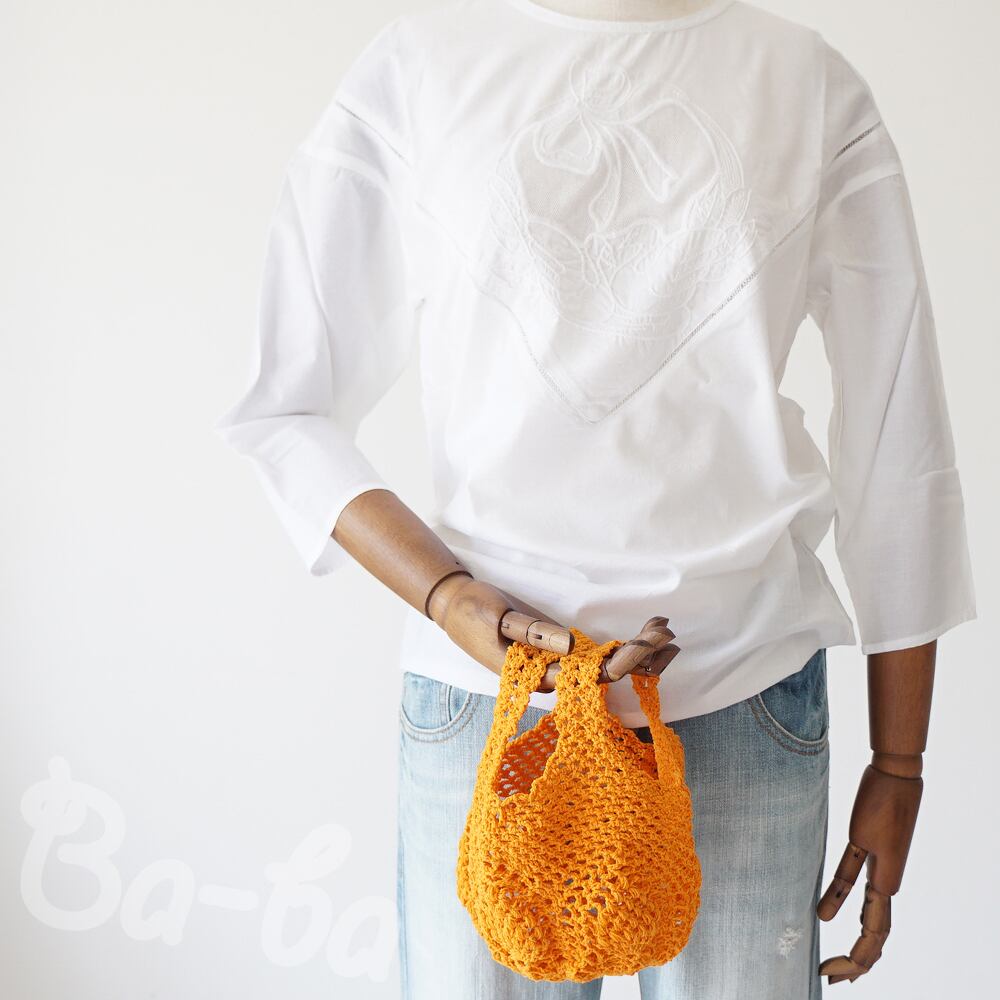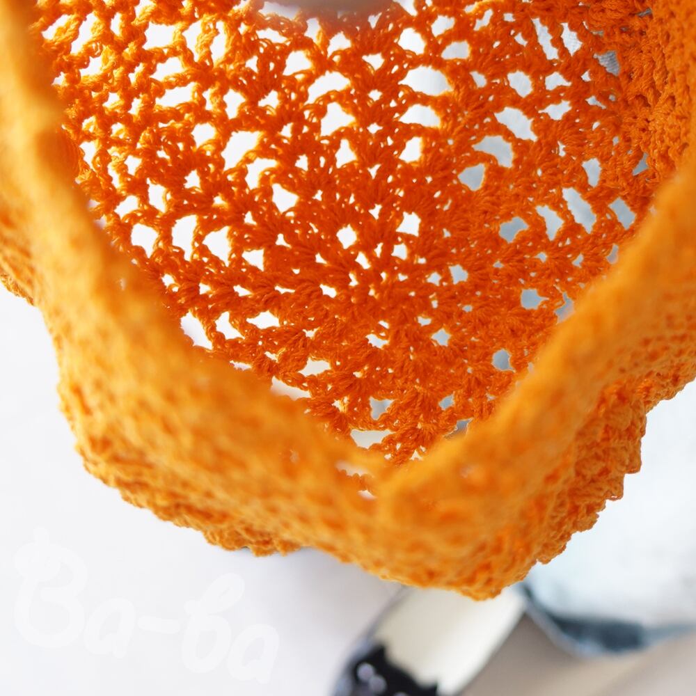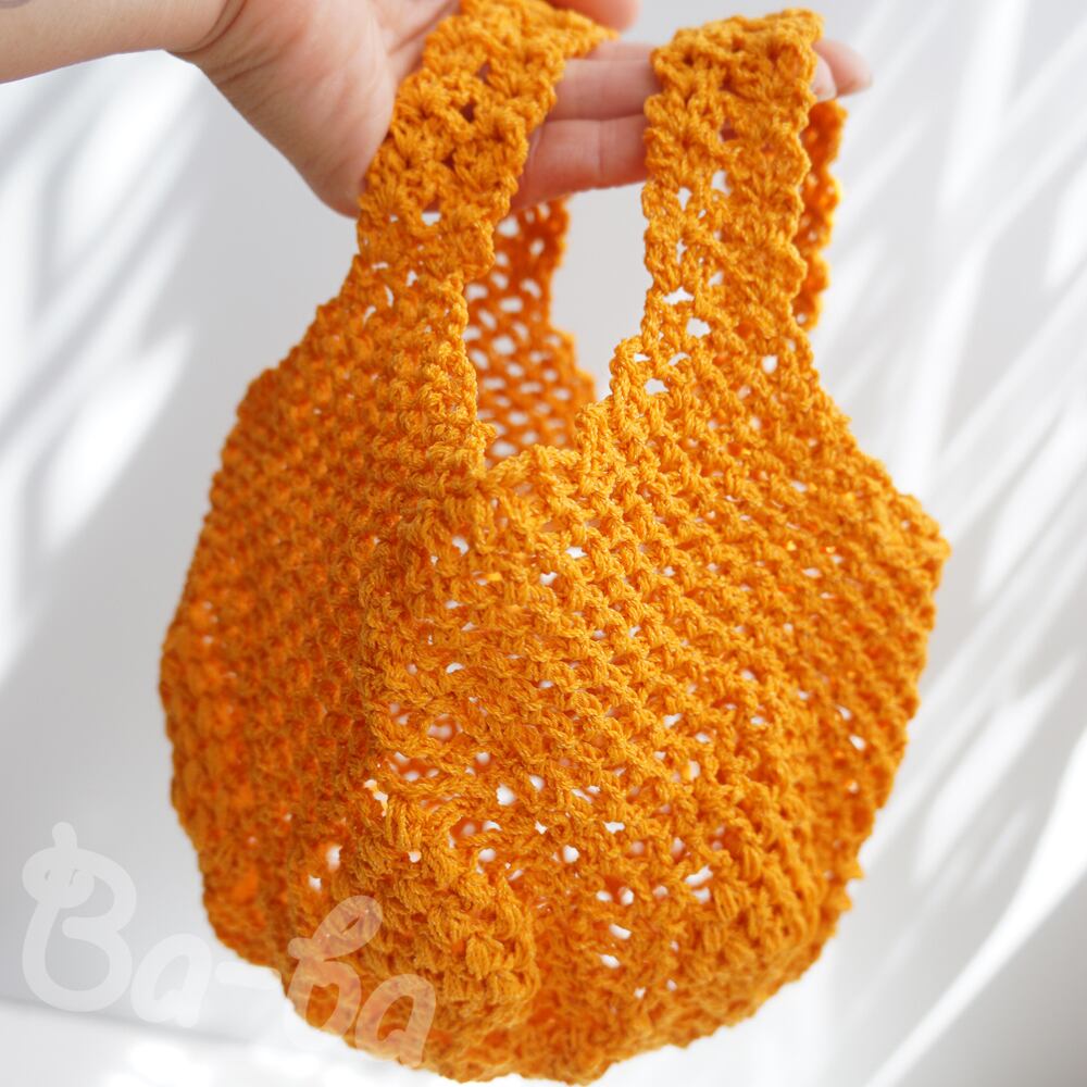 明るいオレンジのサマーヤーンを編み込んで小さな手さげ袋にしました。。