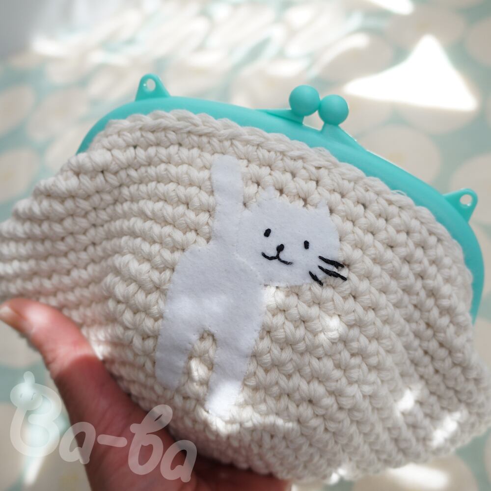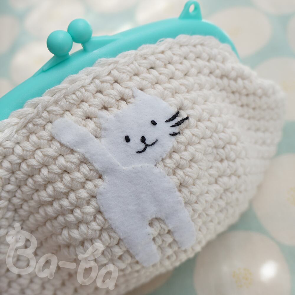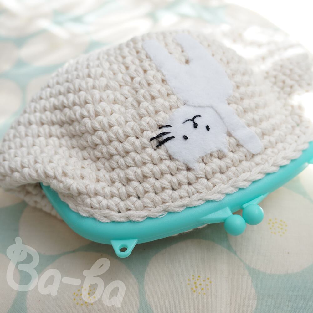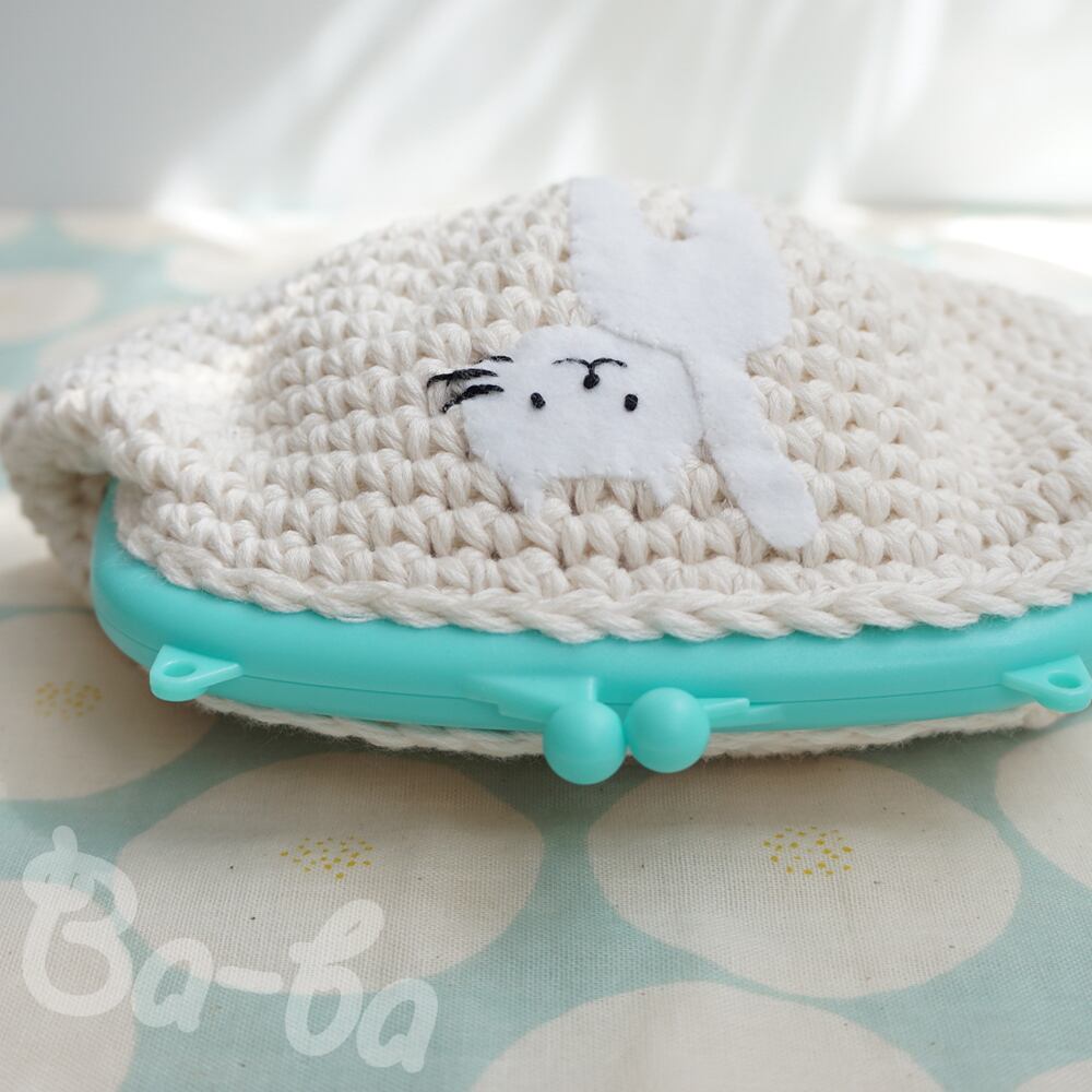 シンプル&きなりの編み地のがま口に、ふりかえるシロのアップリケをしました。