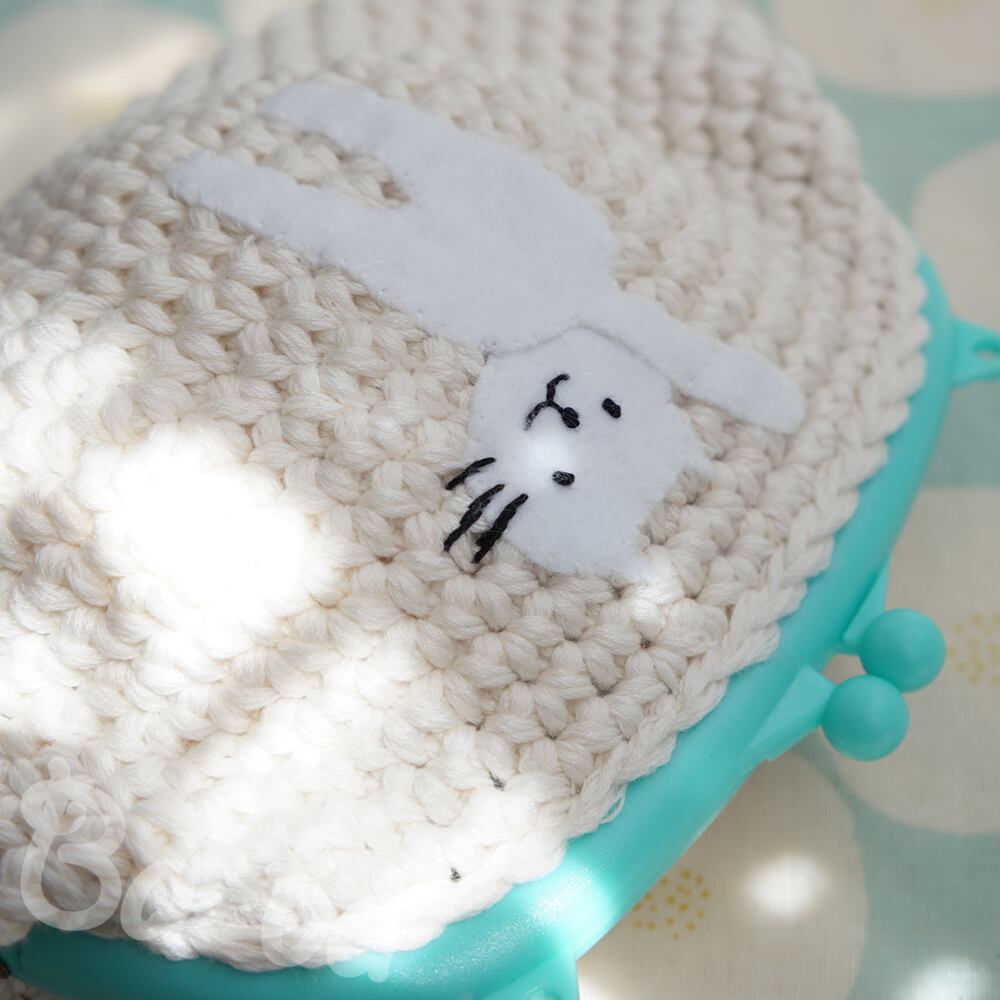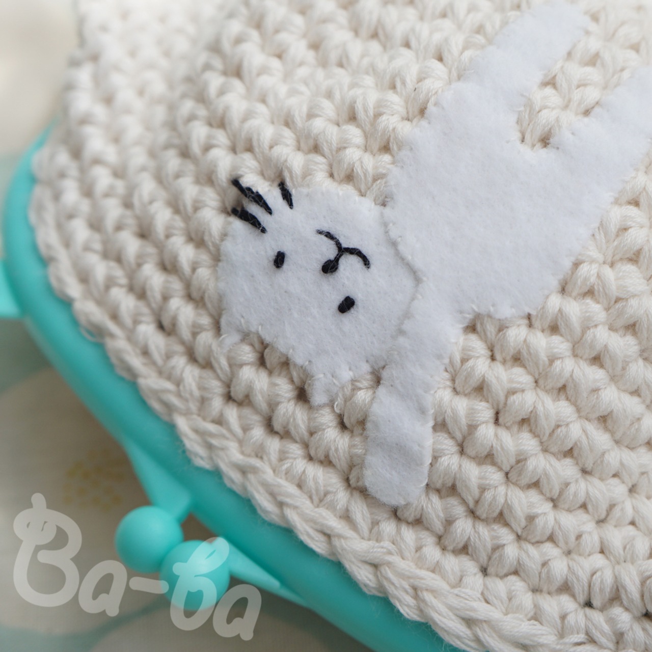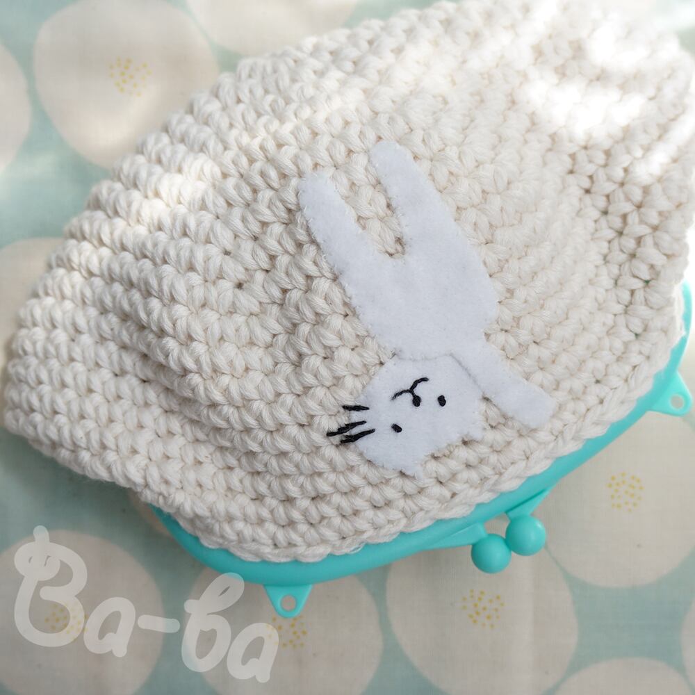 シンプル&きなりの編み地のがま口に、ふりかえるシロのアップリケをしました。