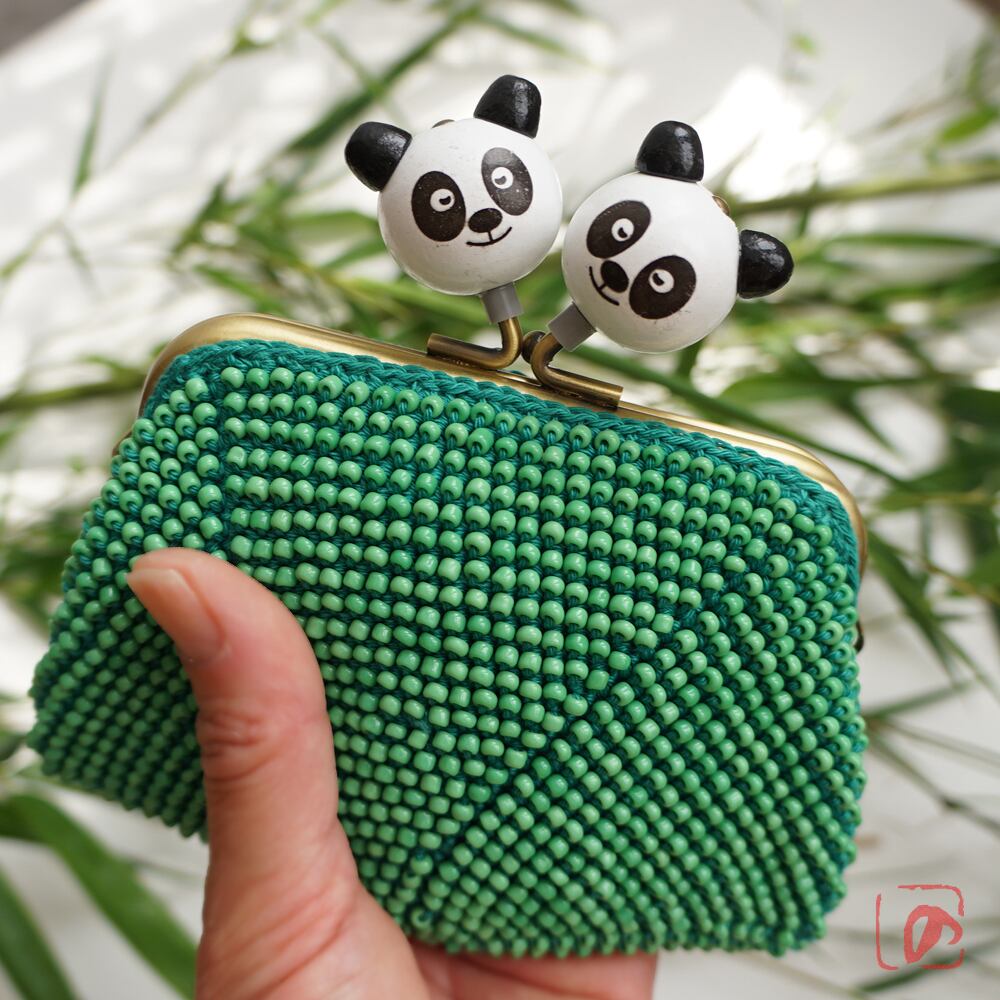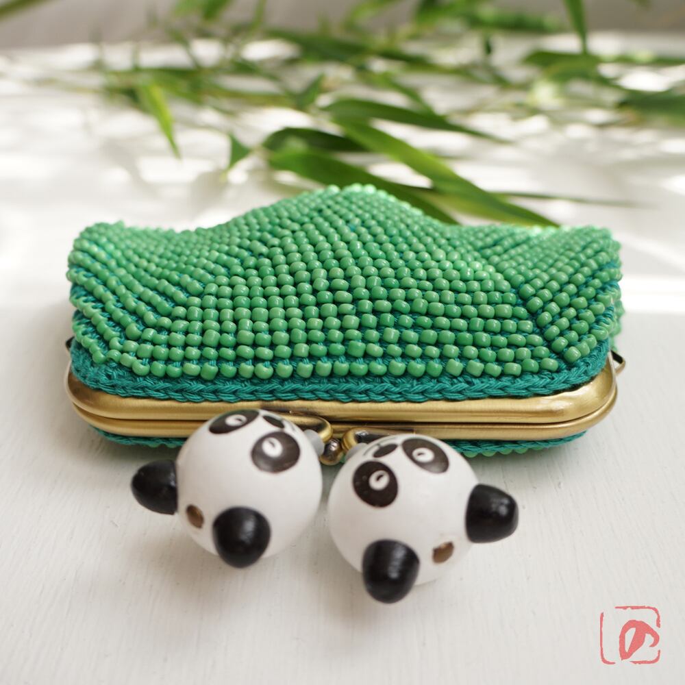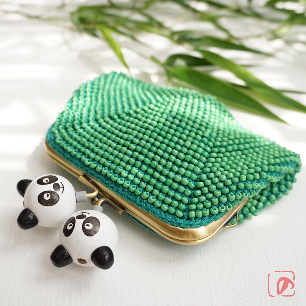 ばあば作 ♫ 仲良しパンダのビーズがま口(竹緑・1484)