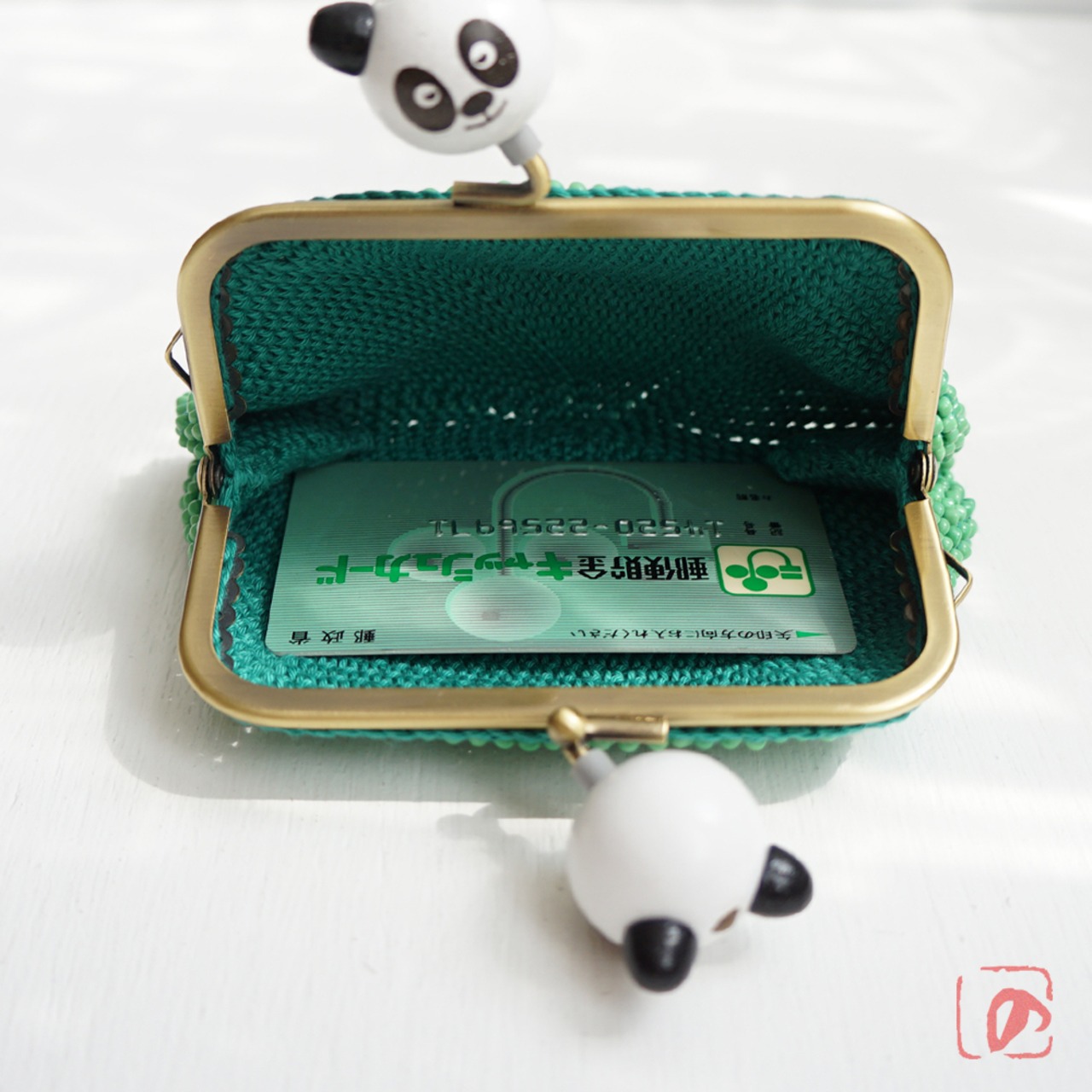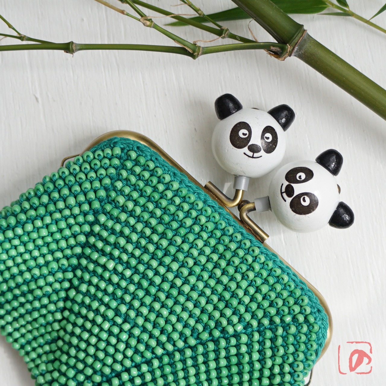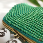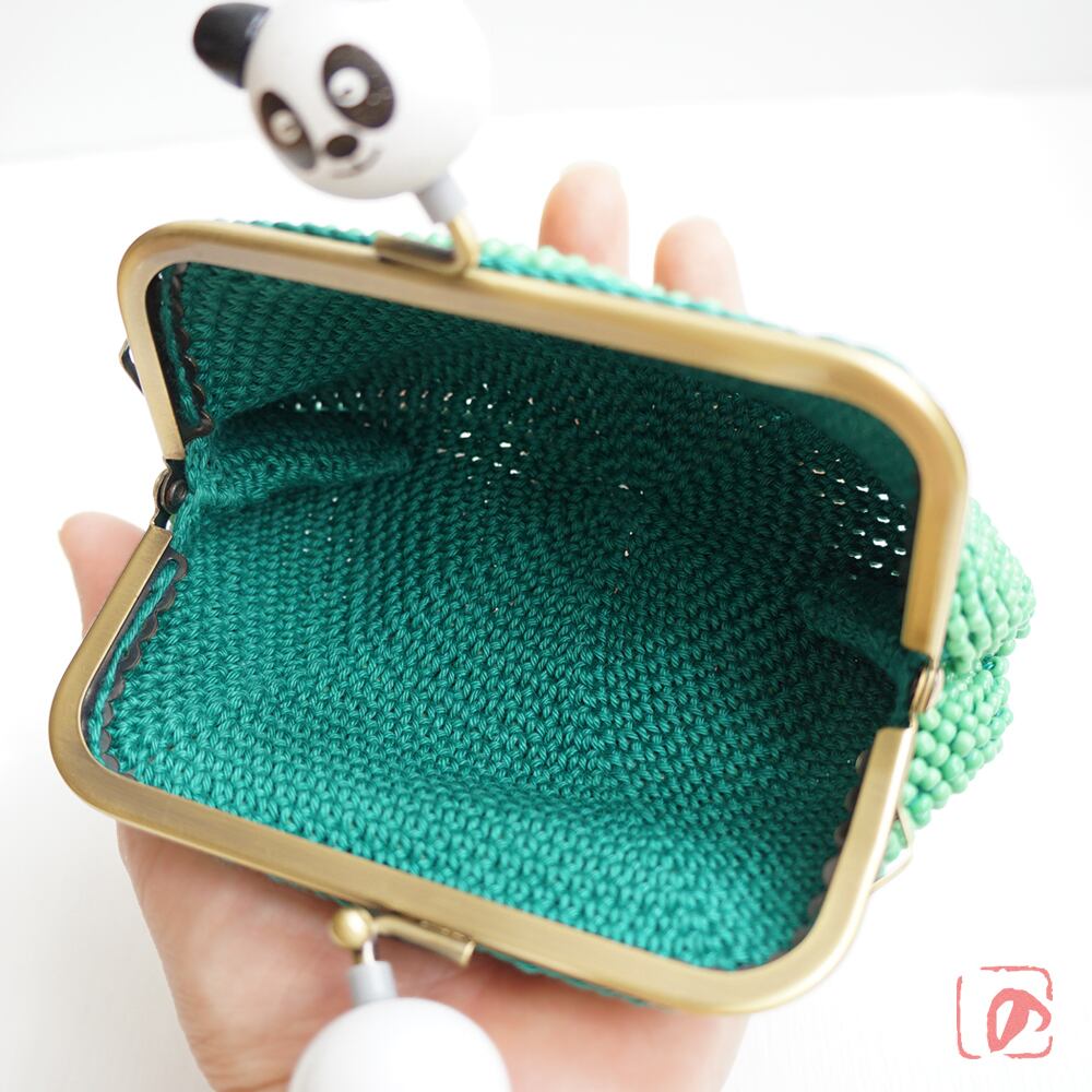 ばあば作 ♫ 仲良しパンダのビーズがま口(竹緑・1484)