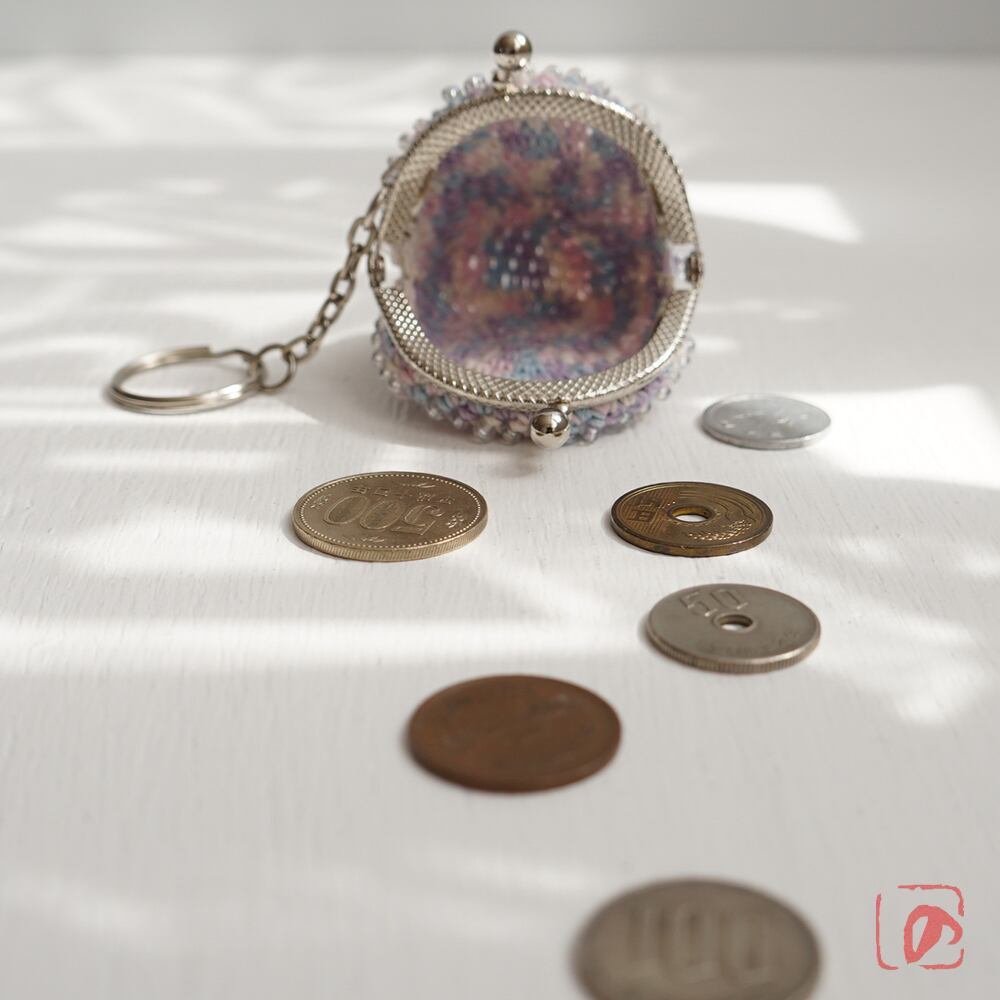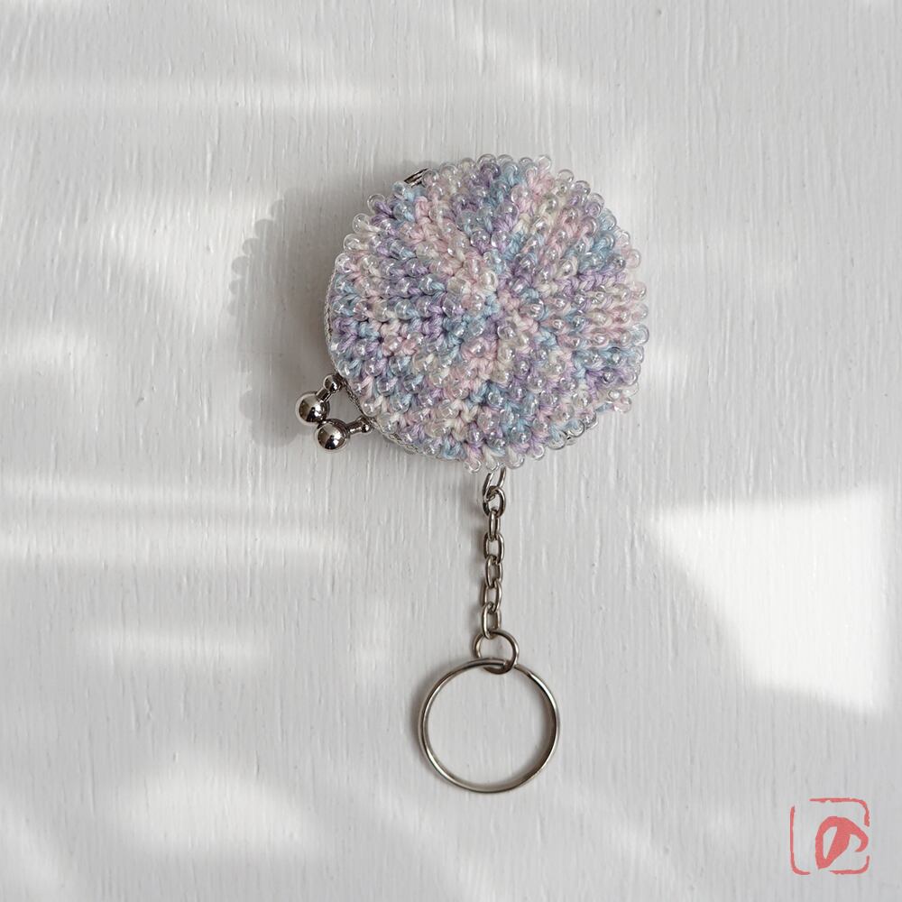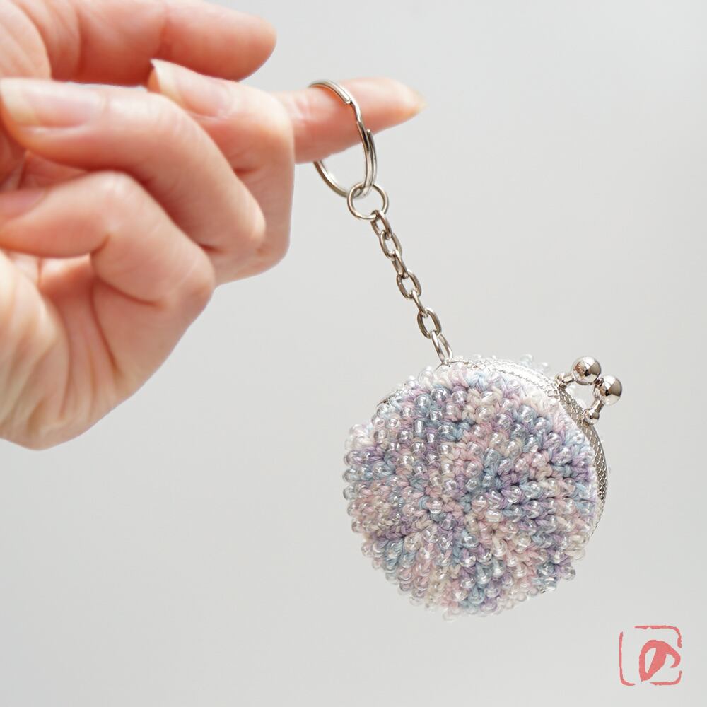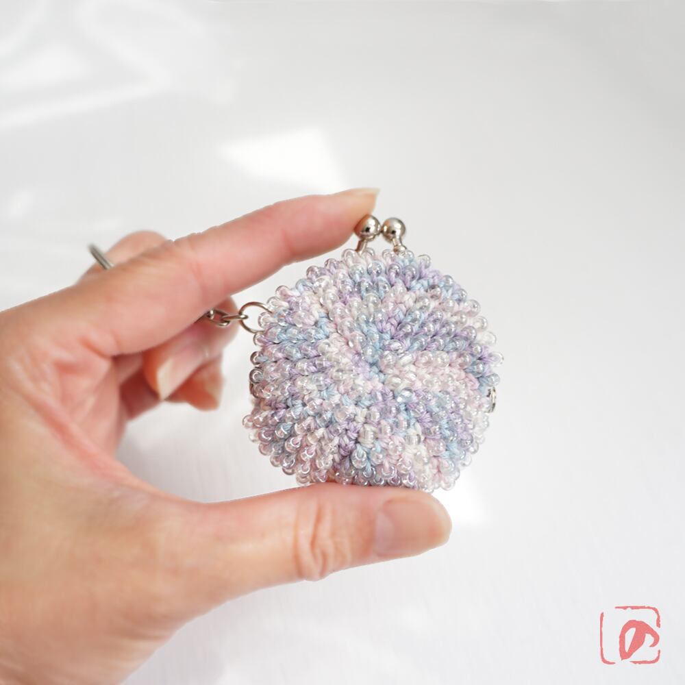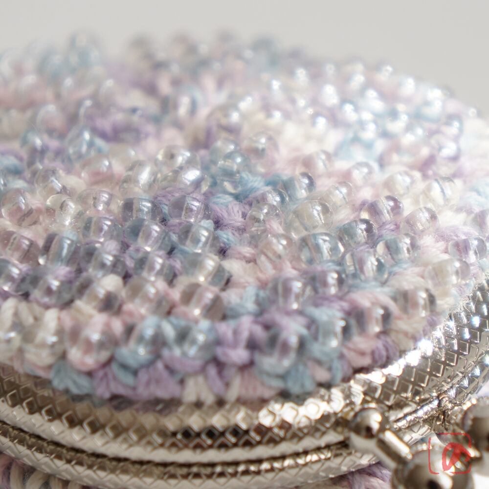 透明のガラスビーズをひとつぶづつ編み込んだがま口です。