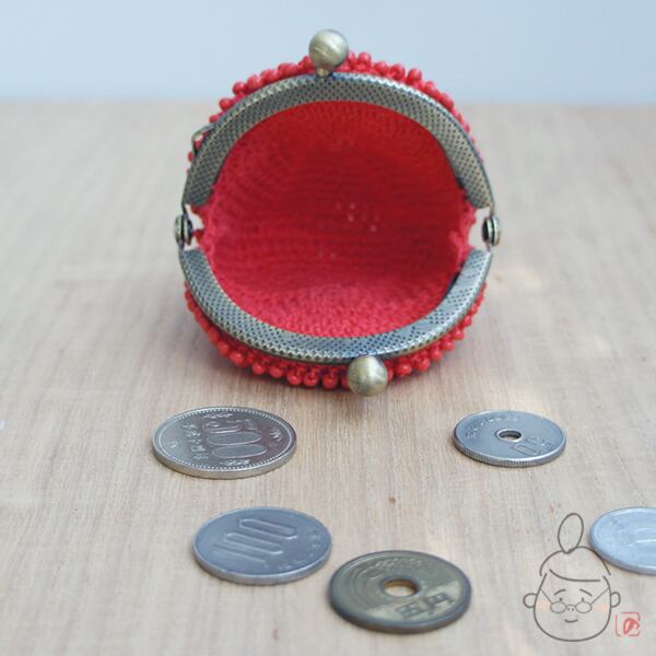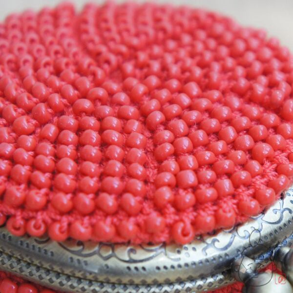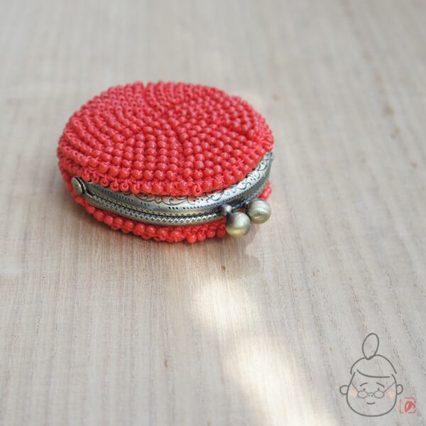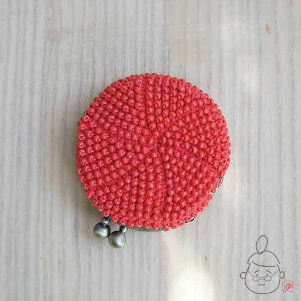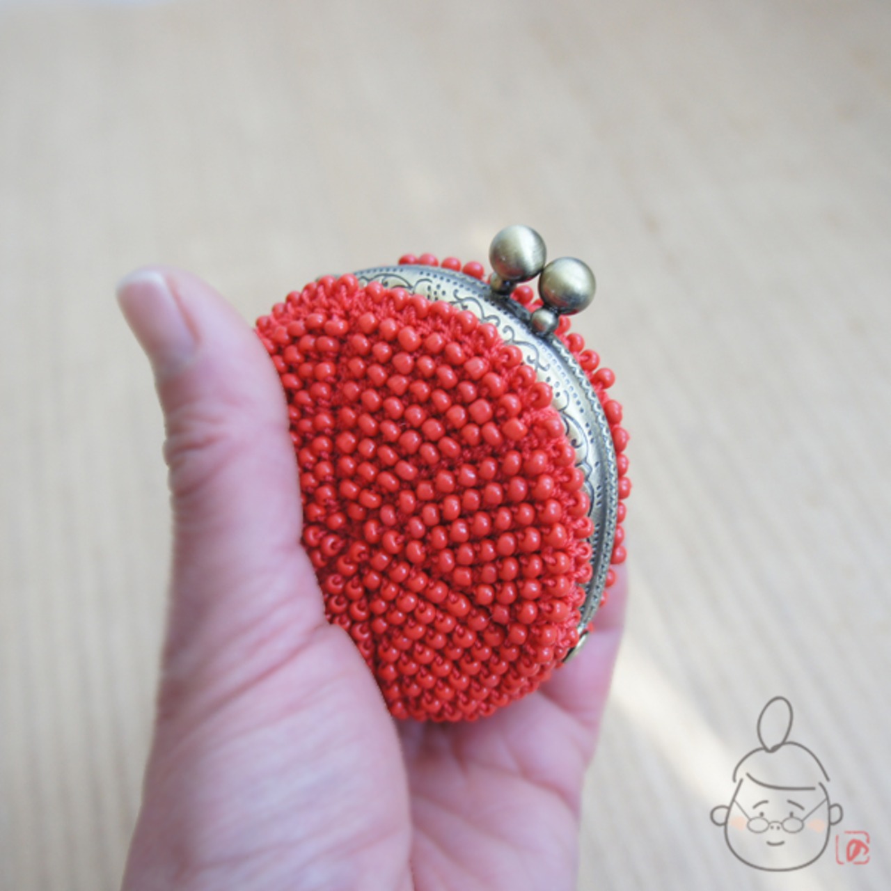 落ち着いた朱色の3mmガラスビーズをひとつぶづつ編み込んだがま口です。