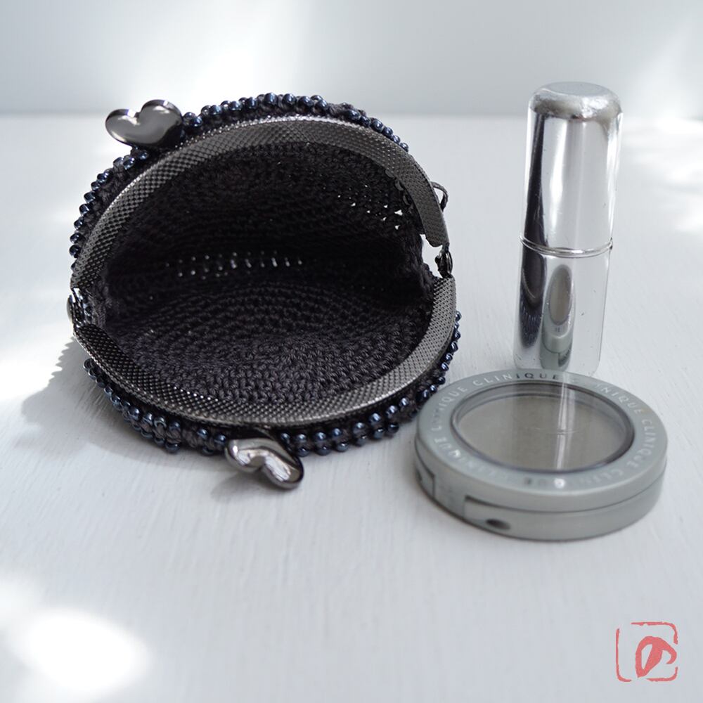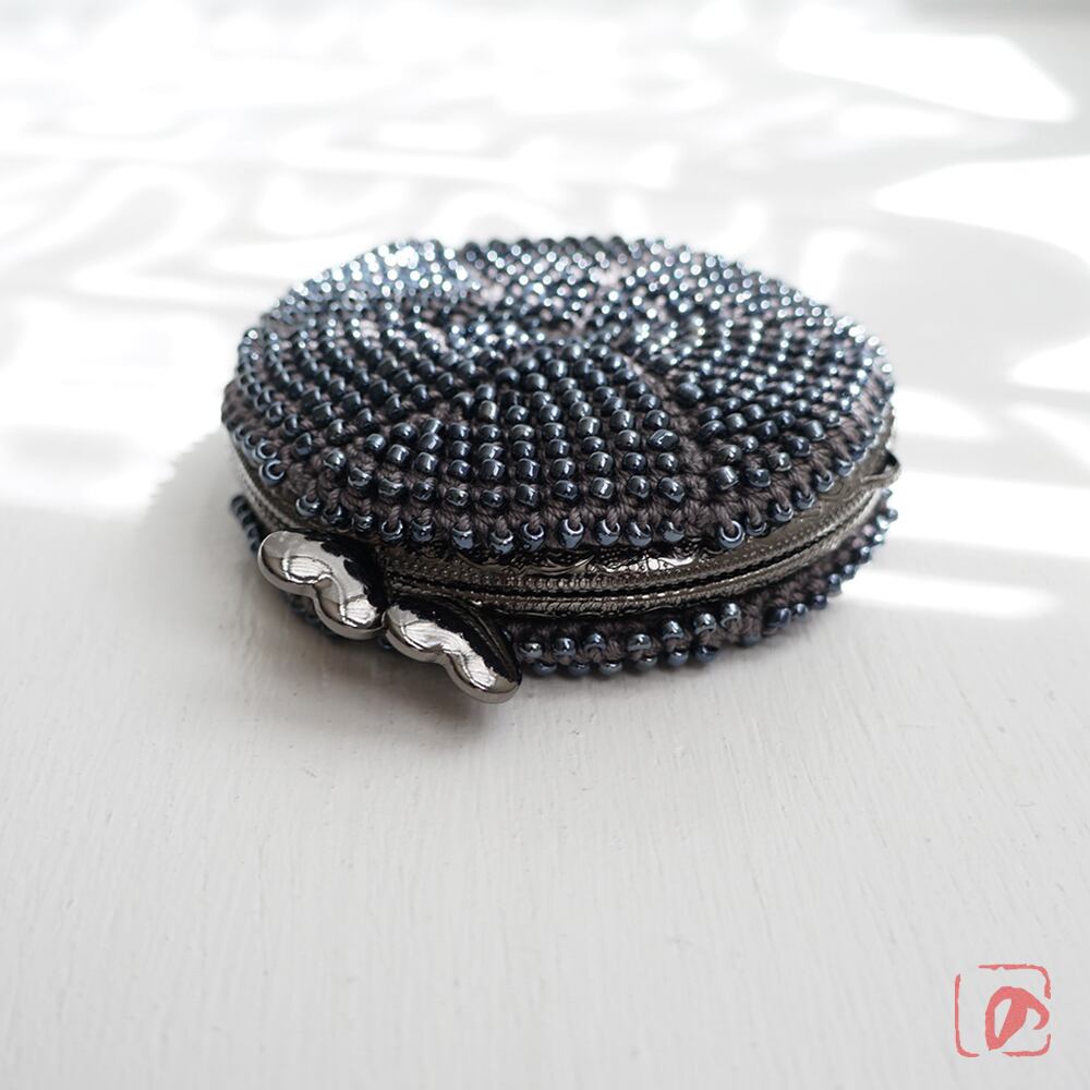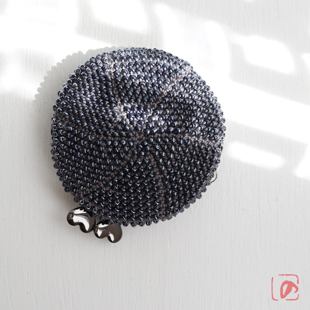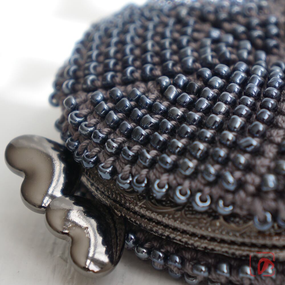 ビーズと口金をのメタルブラック、糸をグレーにし、クールな雰囲気に仕上げました。