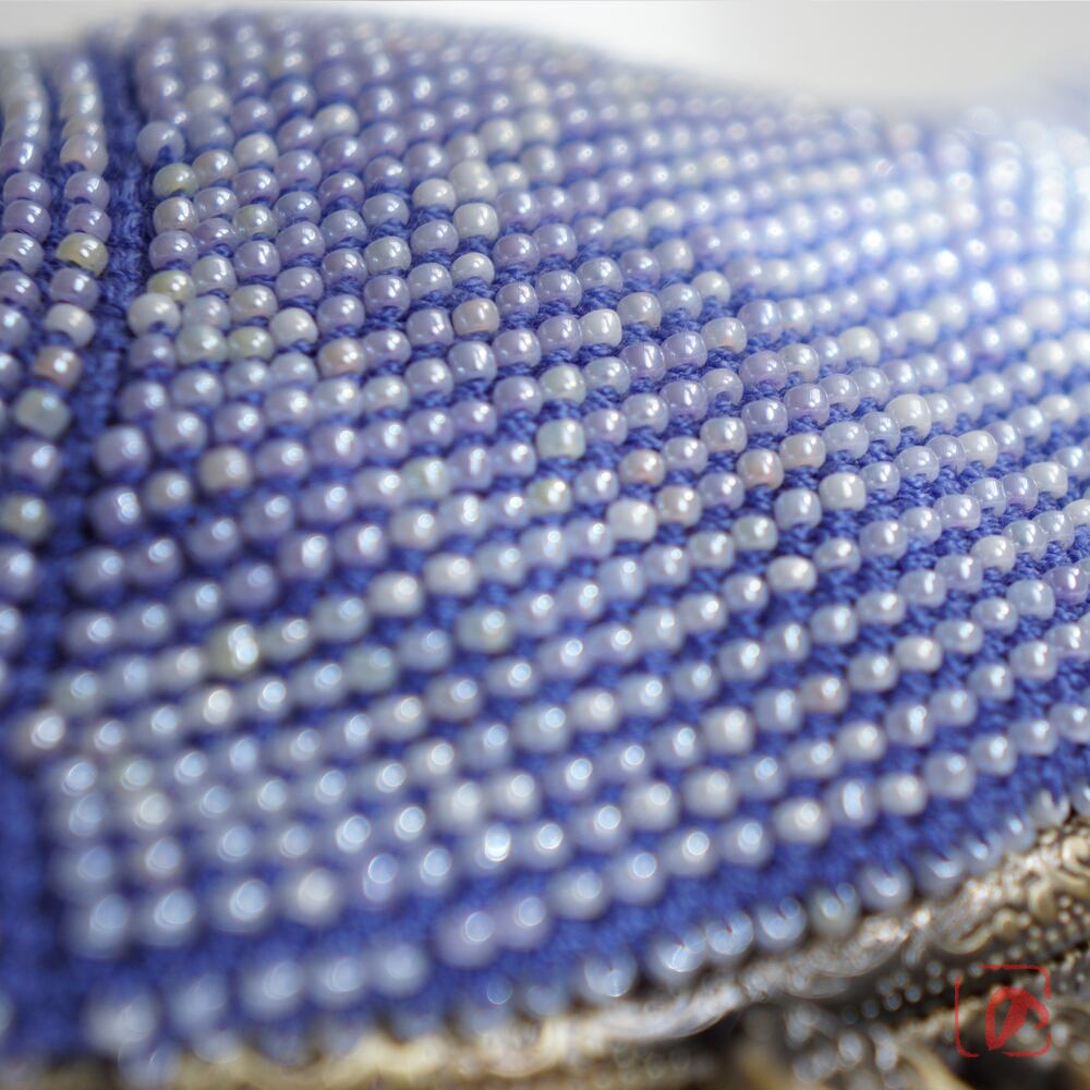 少しづつニュアンスの違うパープル系のビーズをミックスして使用、編み地に変化を出しました。シードビーズの輝きと、軽量を兼ねた作品です。