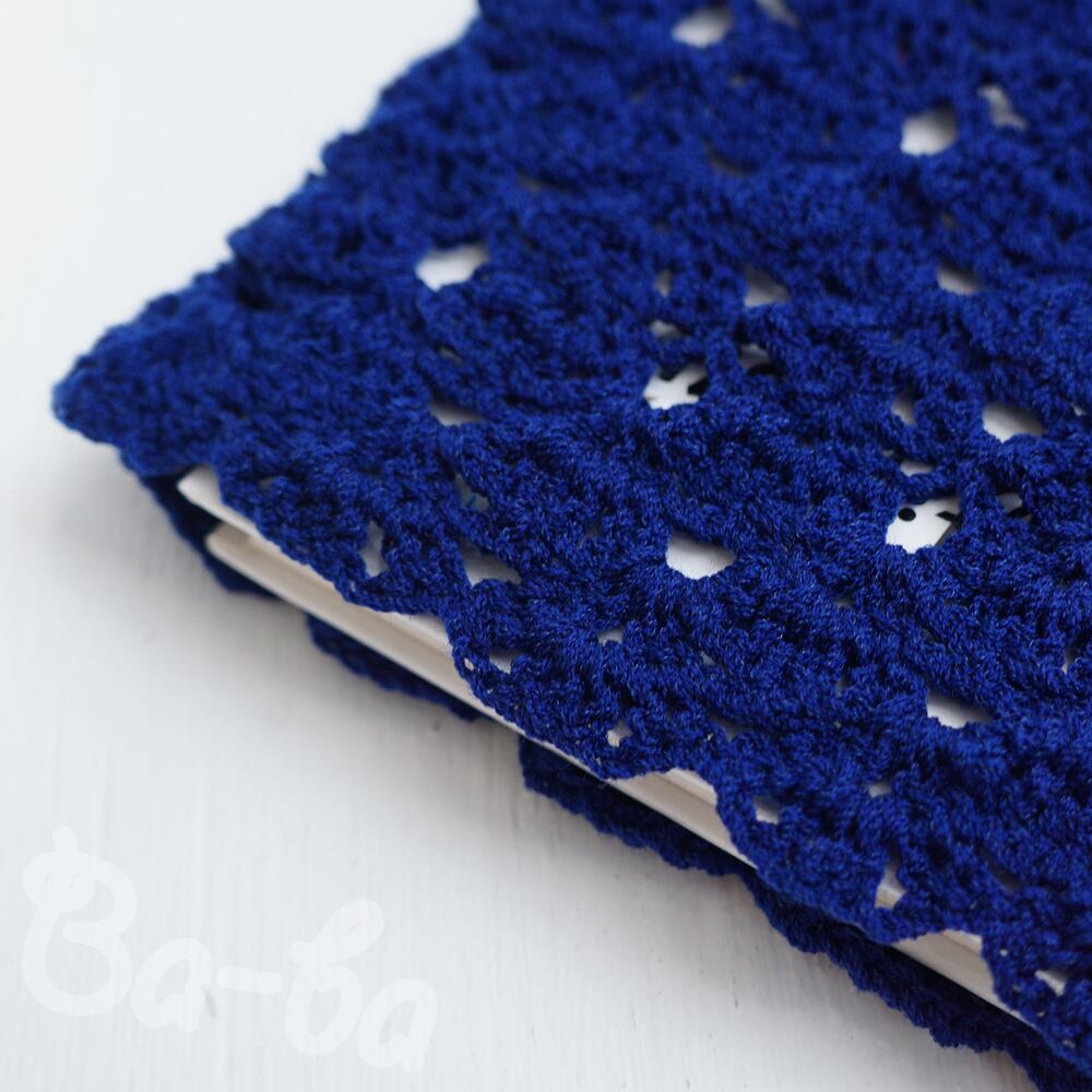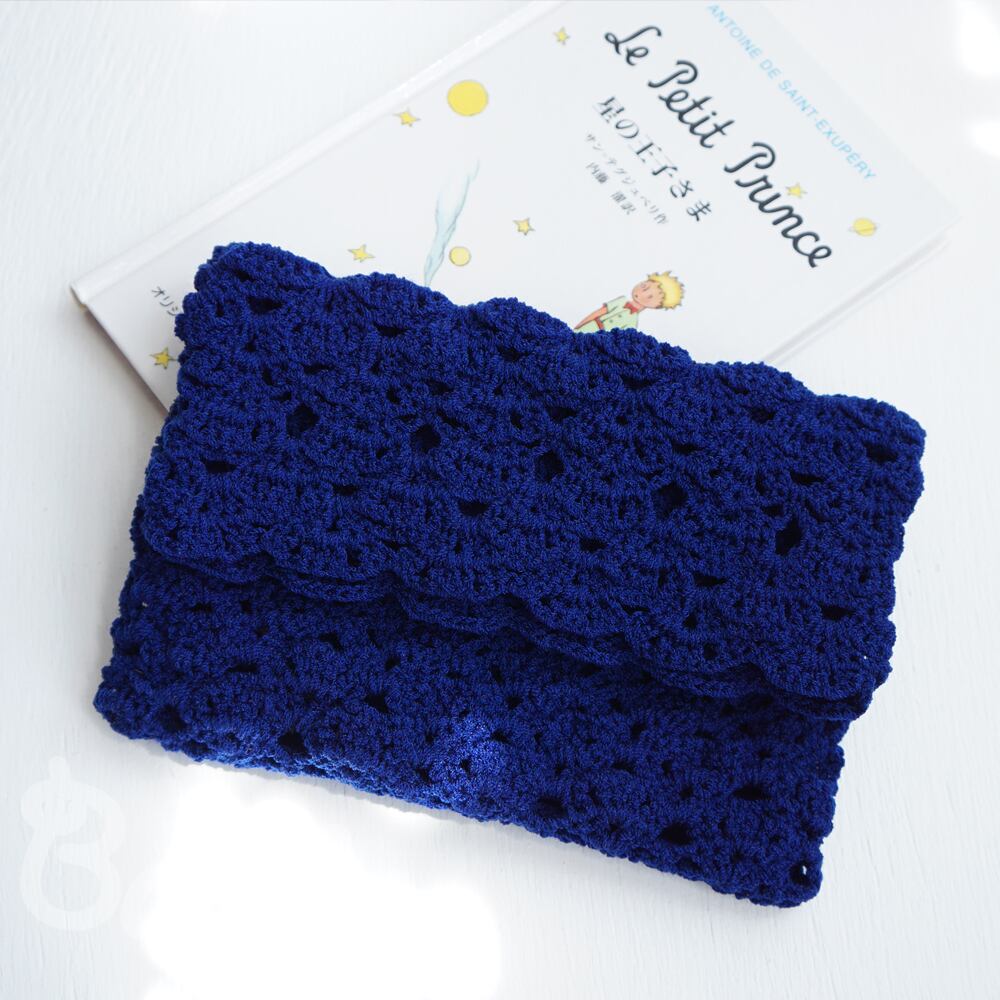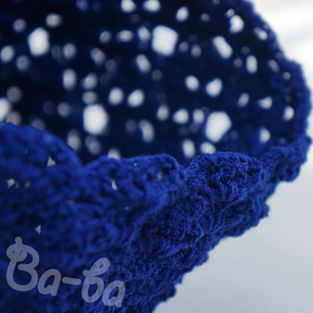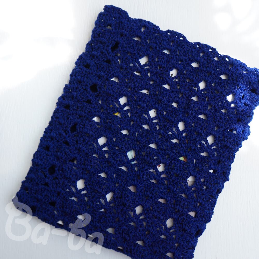 青い混紡サマーヤーンを、波模様のような透かし編みにしました。