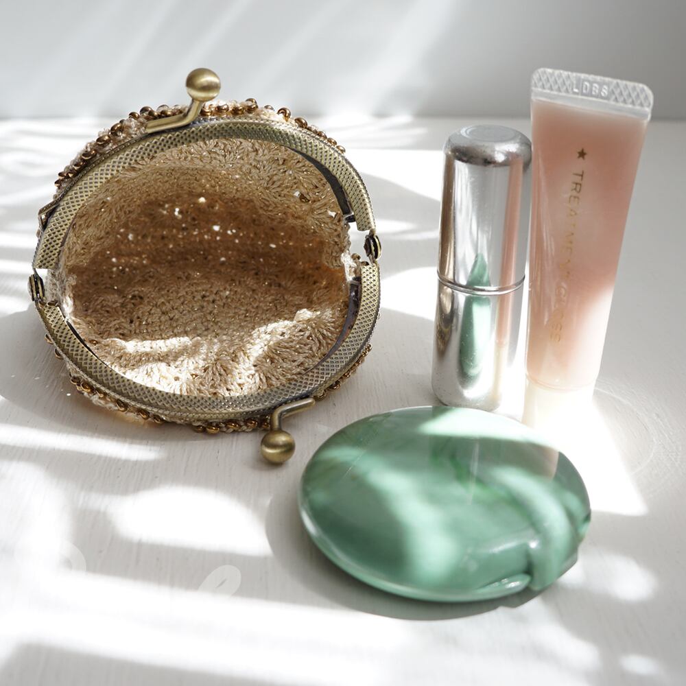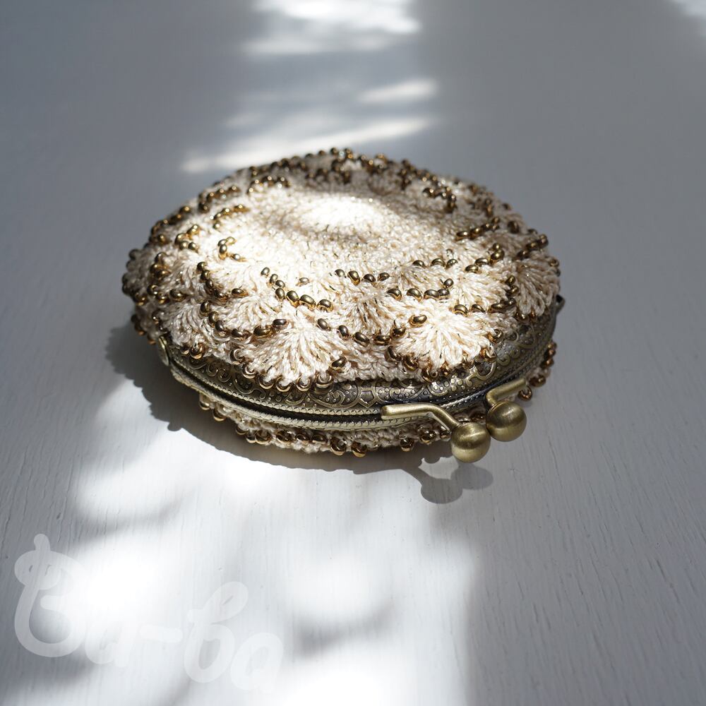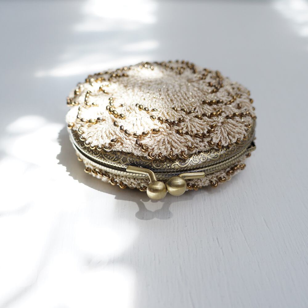 編みがま口の軽量さと、ビーズの輝きを両方取り入れた作品です。
