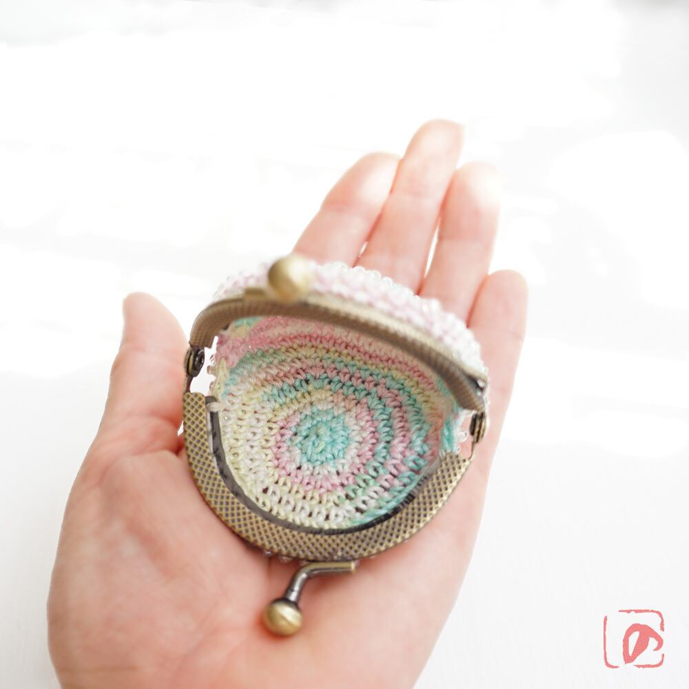 丸く編み上げた編み地を2枚あわせて、まぁるいがま口に仕上げました。