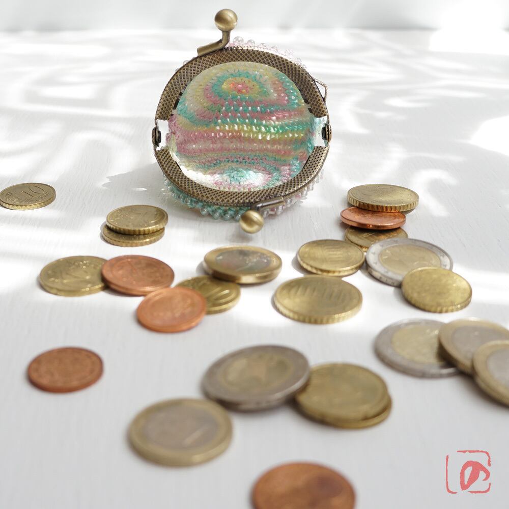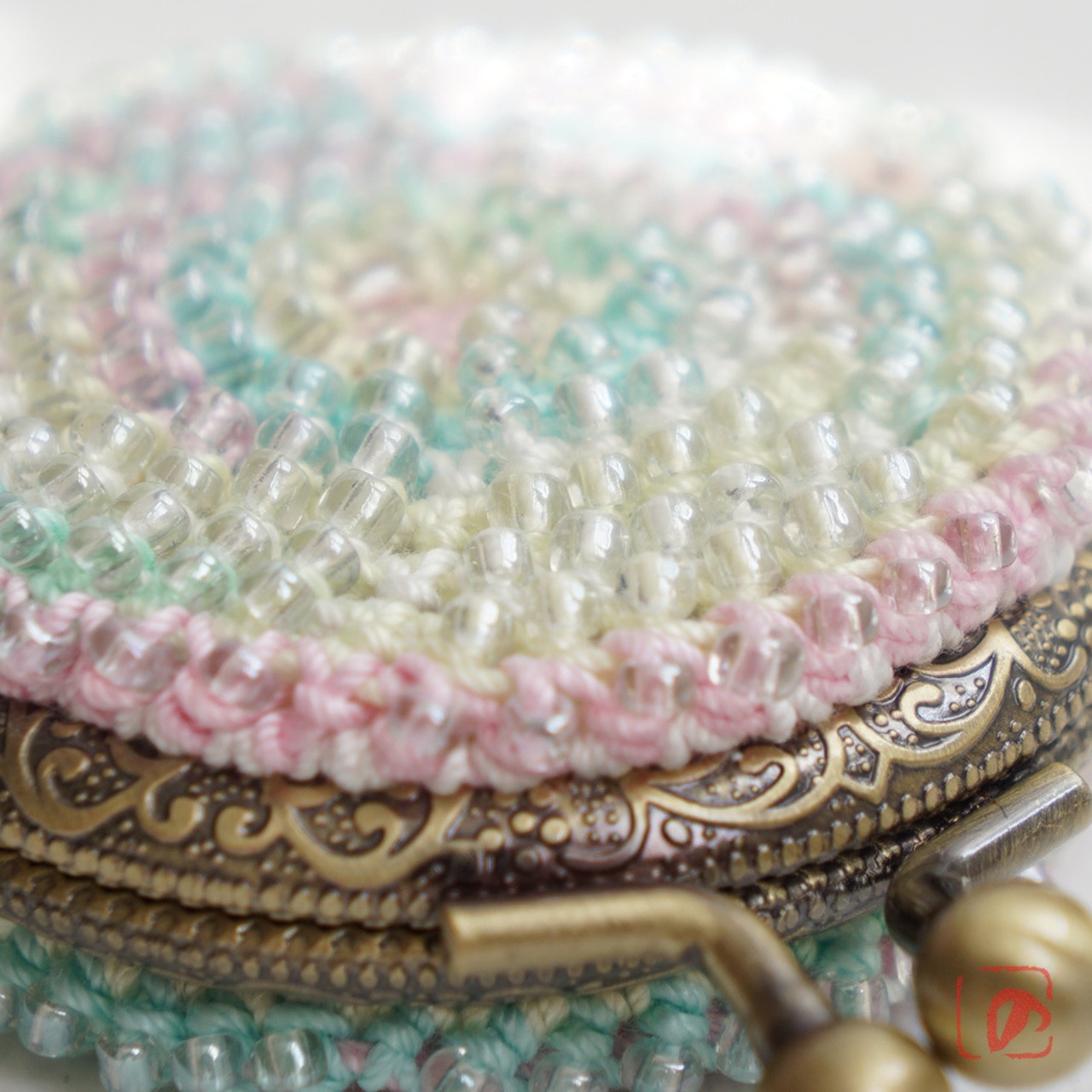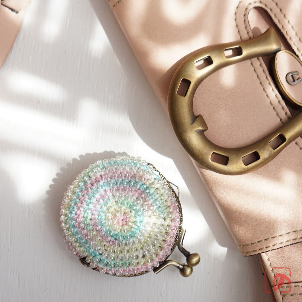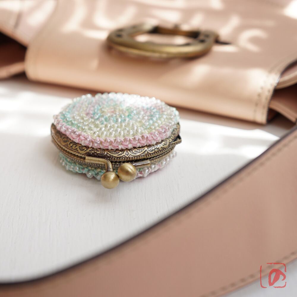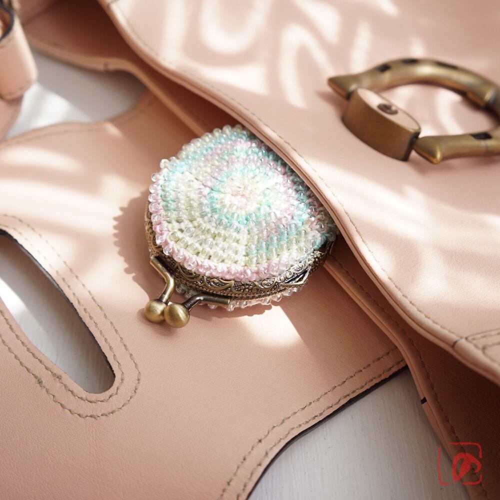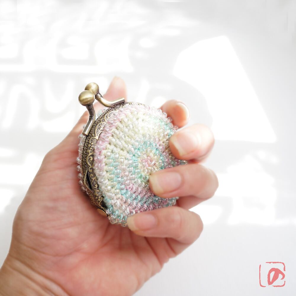 3mmガラスビーズをひとつぶづつ編み込んだまぁるいがま口です。