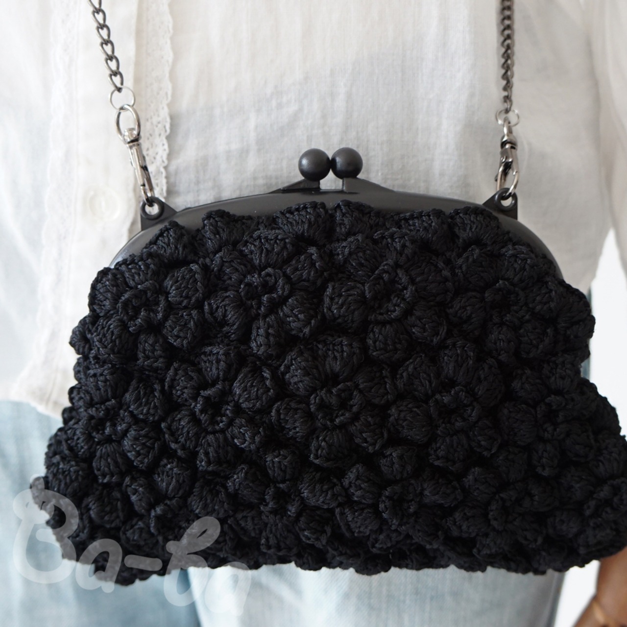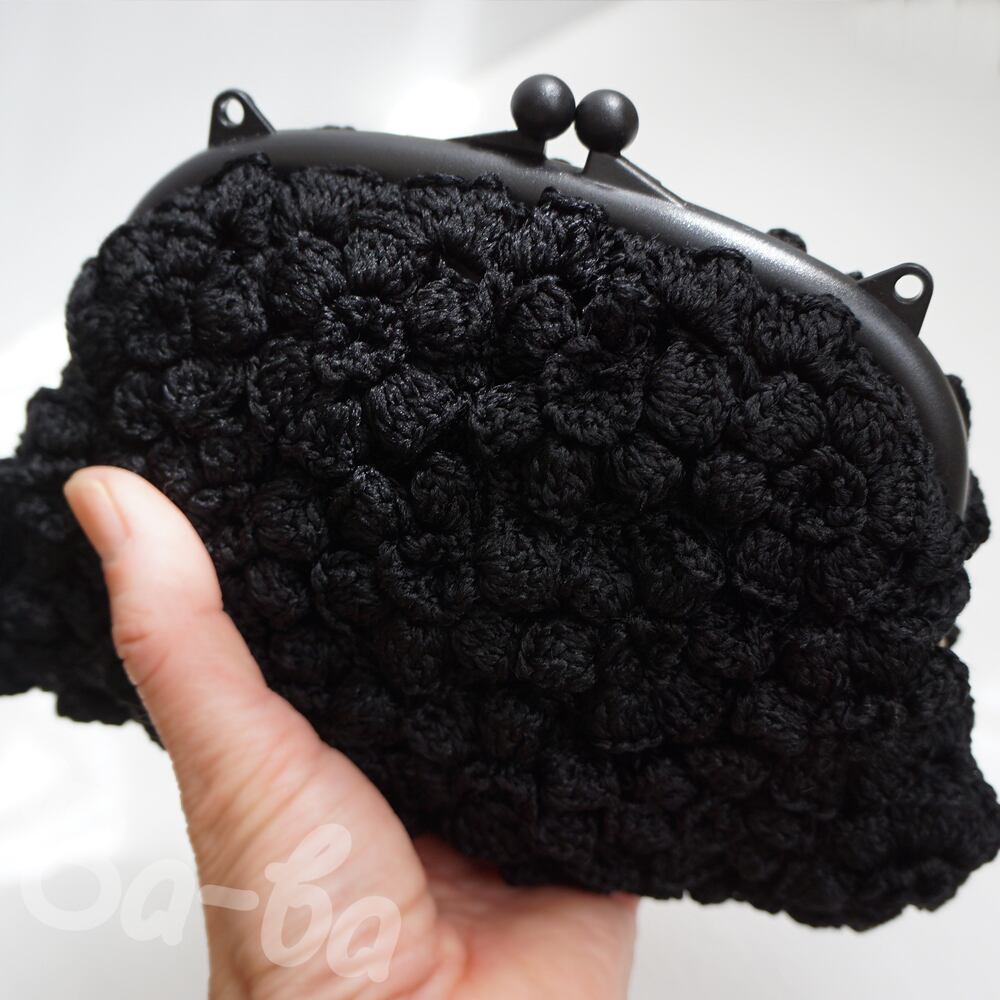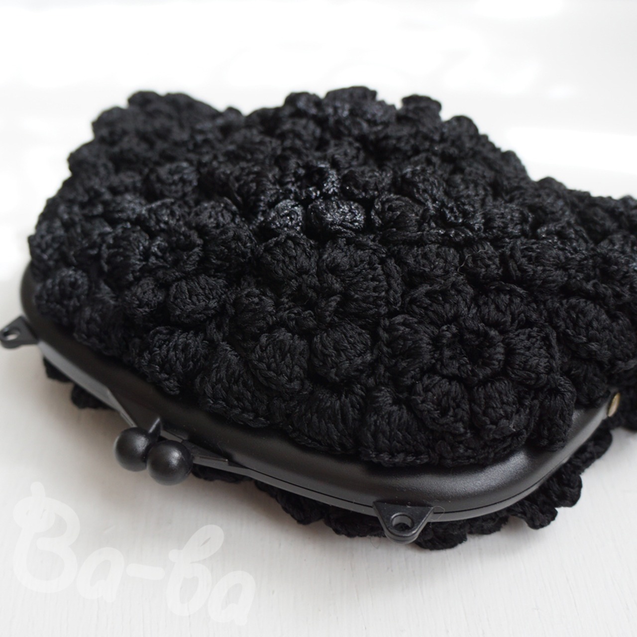 糸とプラ口金を黒で統一、大人っぽいプチバッグに仕上げました。
