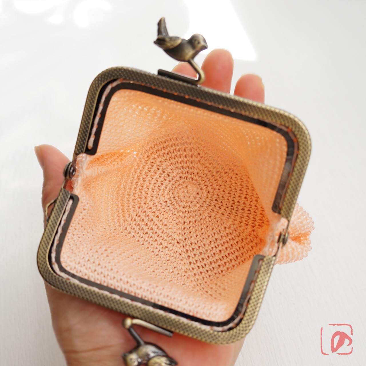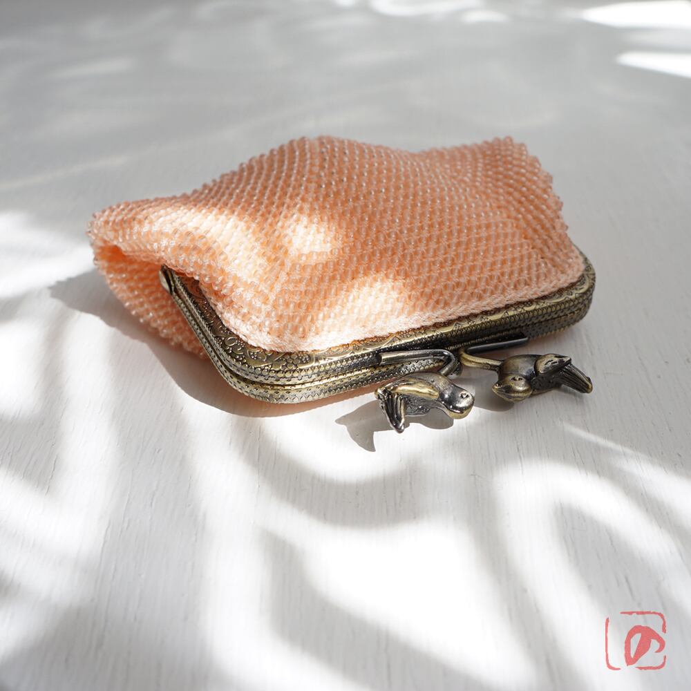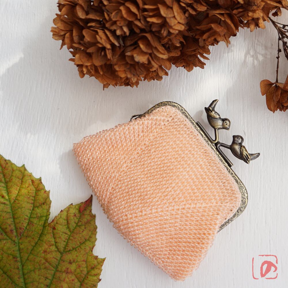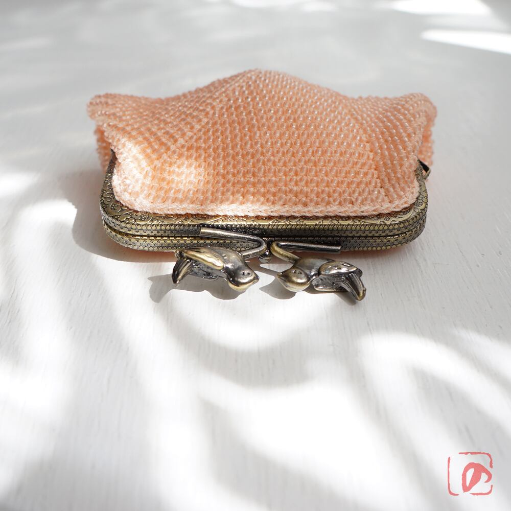 ピーチ色フロストビーズの編み地に、小鳥のつまみを組み合わせてアクセントにしました。