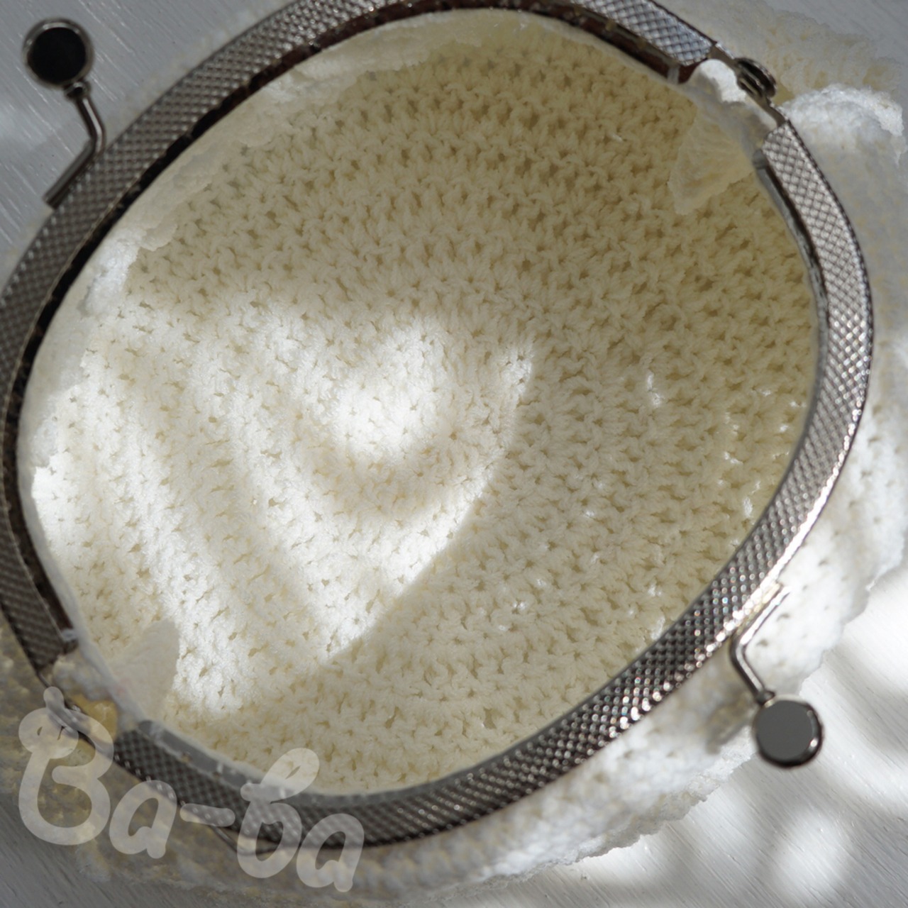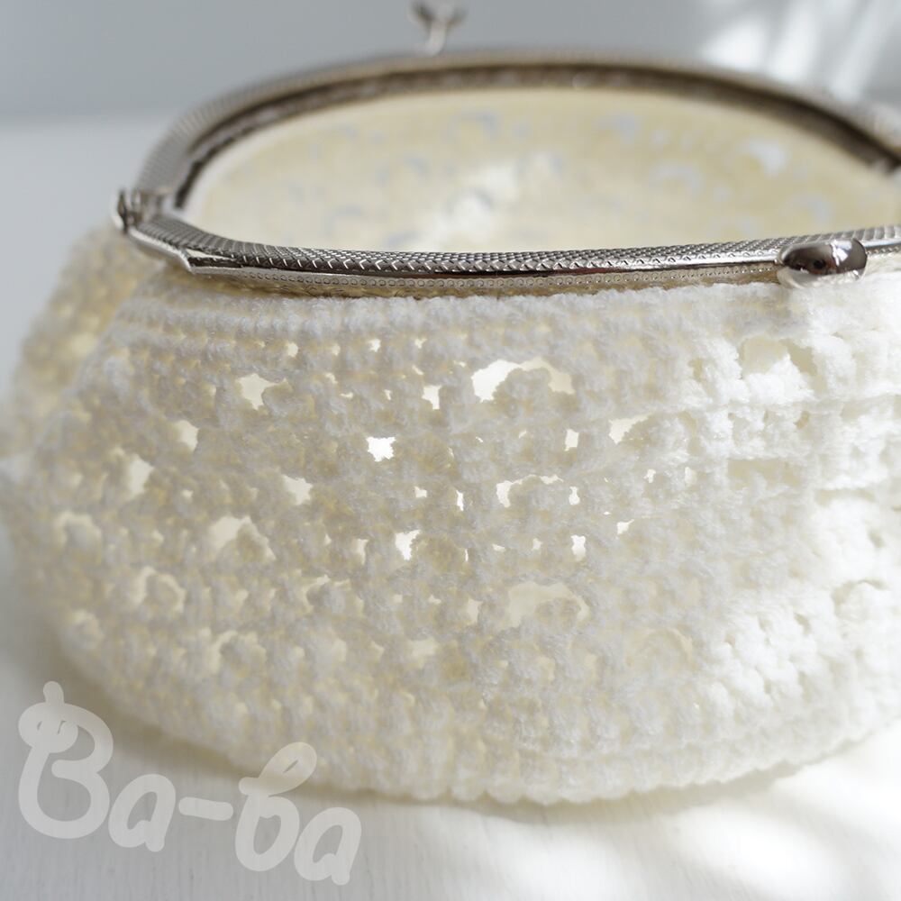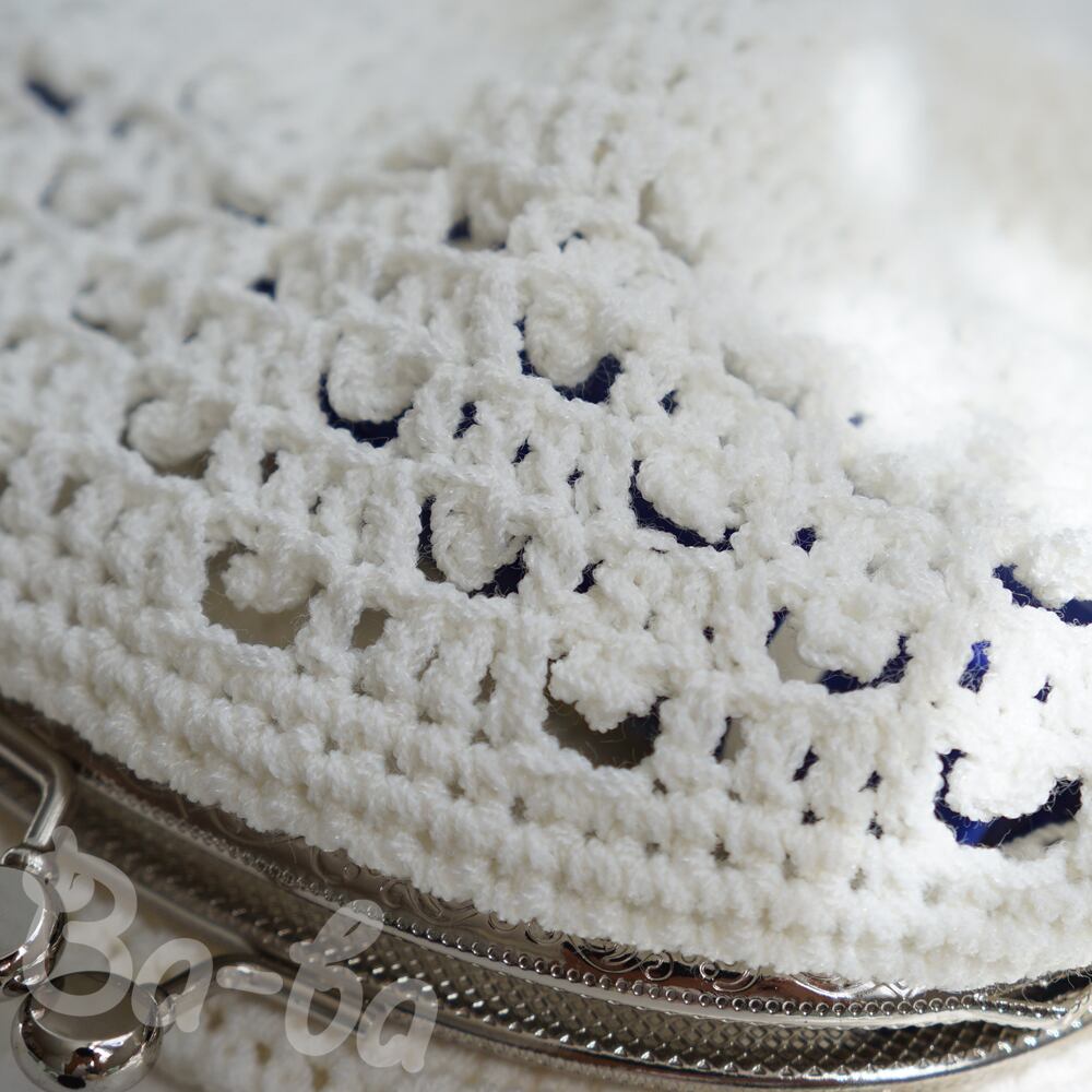 爽やかな白いサマーヤーンを模様編みで編み上げ、がま口に仕上げました。