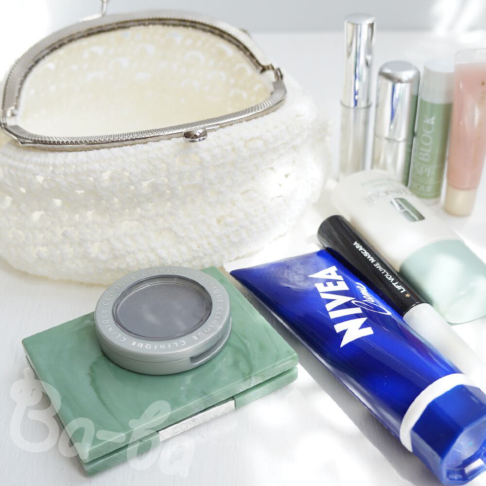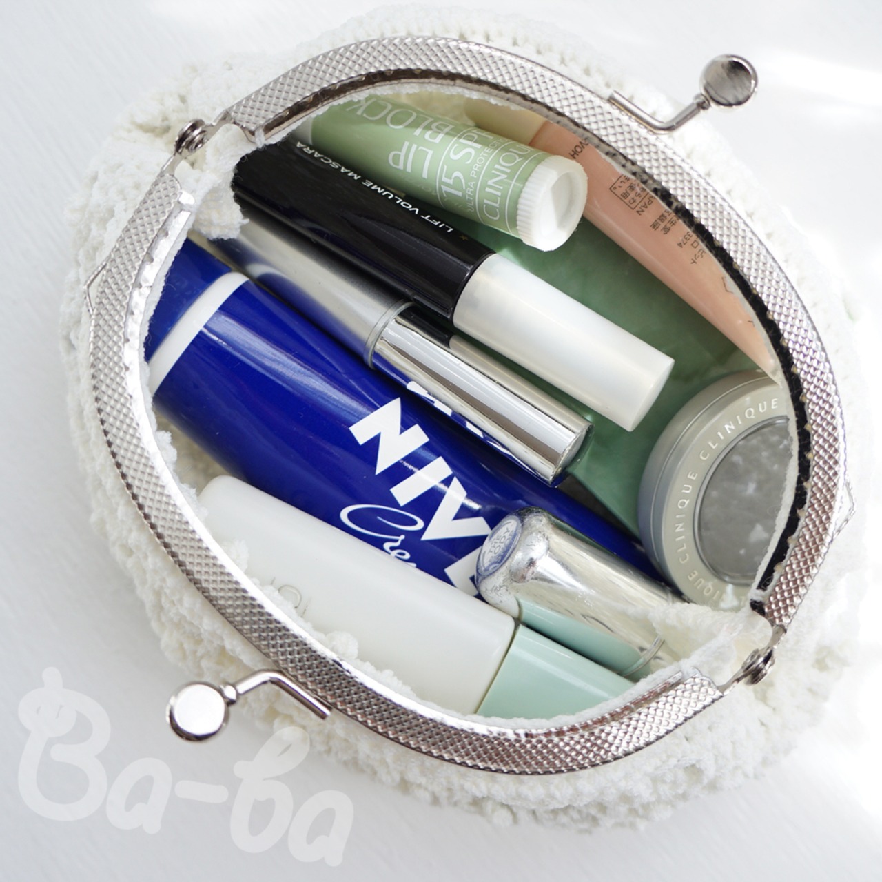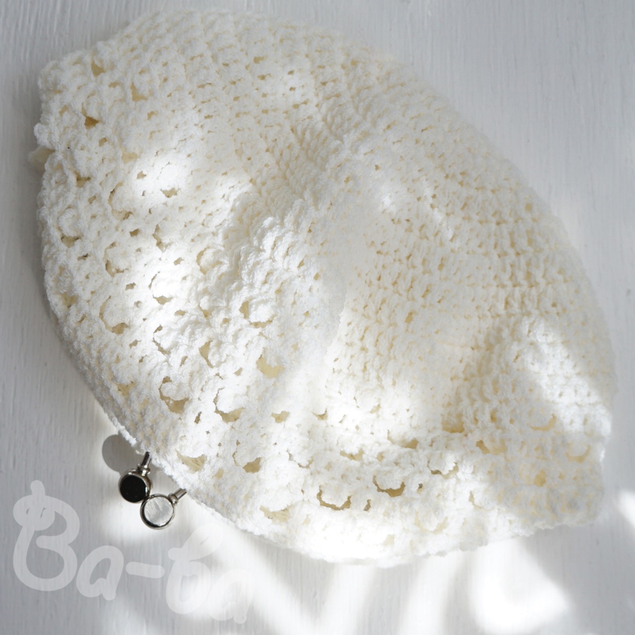 爽やかな白いサマーヤーンを模様編みで編み上げ、がま口に仕上げました。