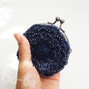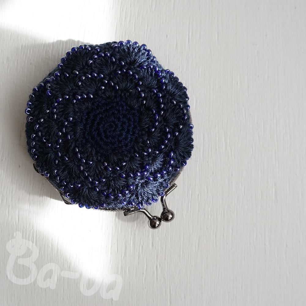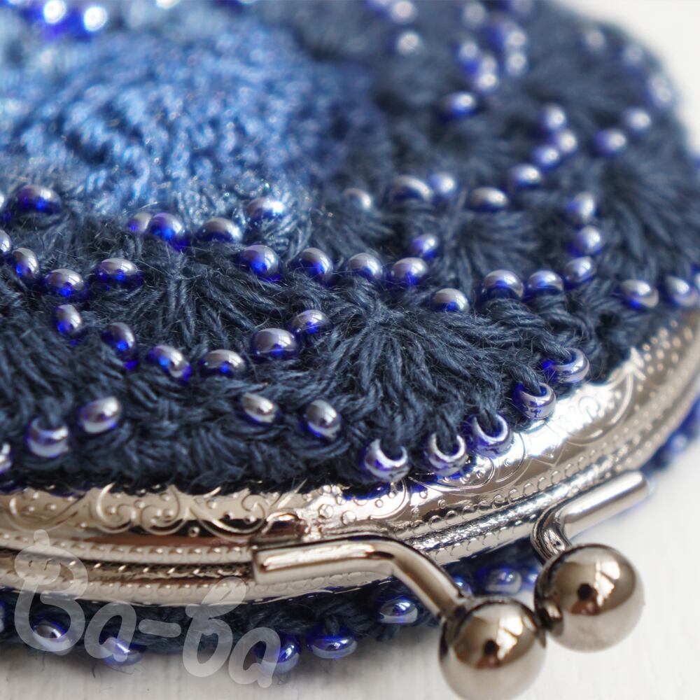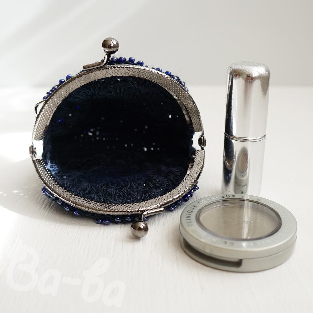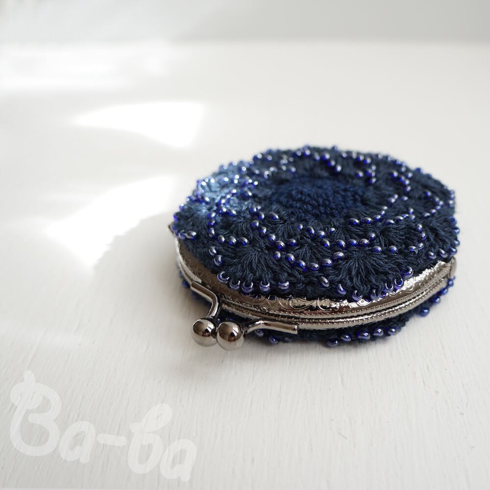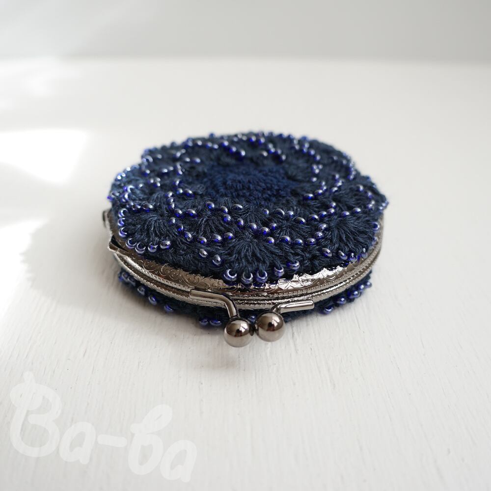 ばあば作、ビーズ入り松編み・まるまるがま口(navy blue・C1488)