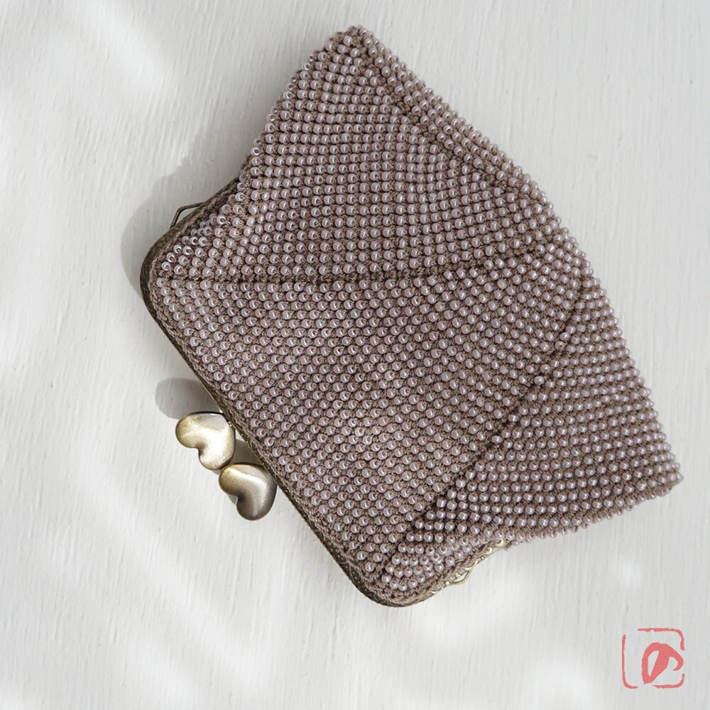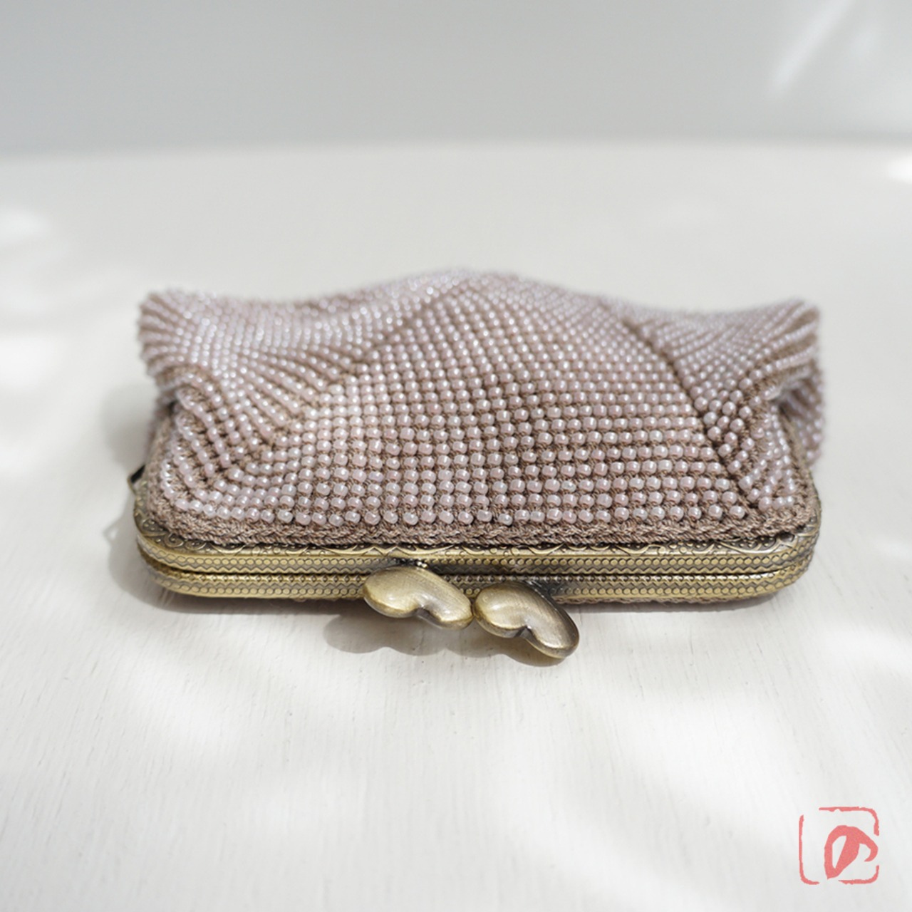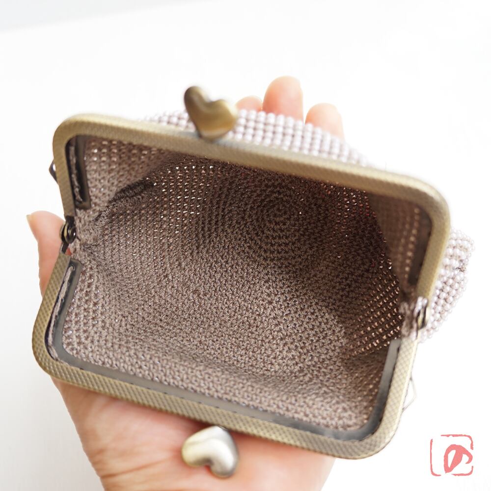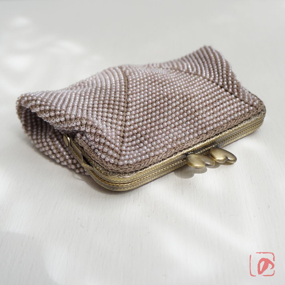 淡いラベンダー色のビーズを使用、ベージュの糸と合わせた優しい雰囲気のがま口です。