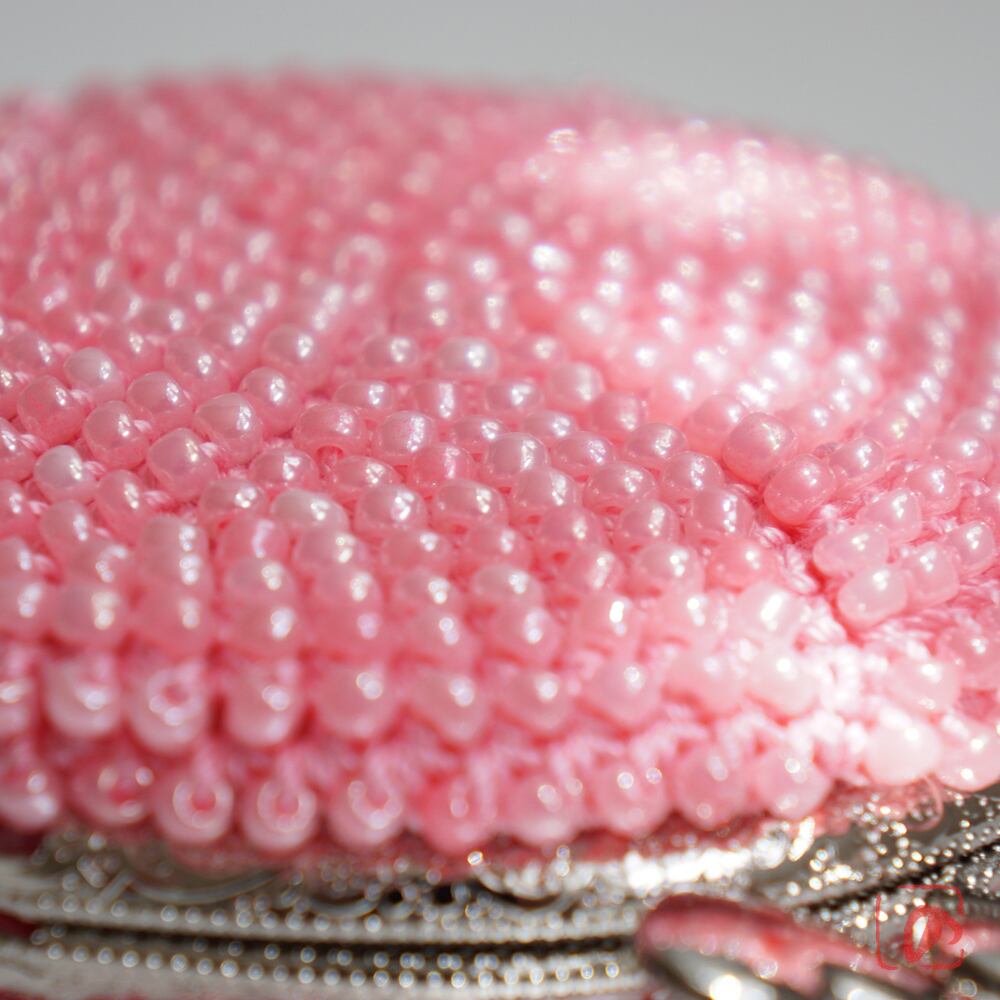 3mmのビーズをひとつぶづつ、まぁるい編み地全面に編み込みました。