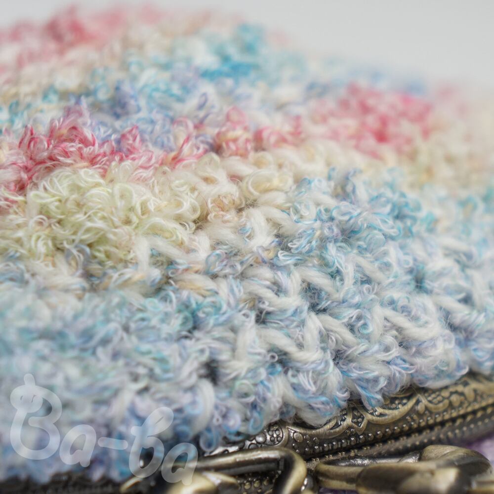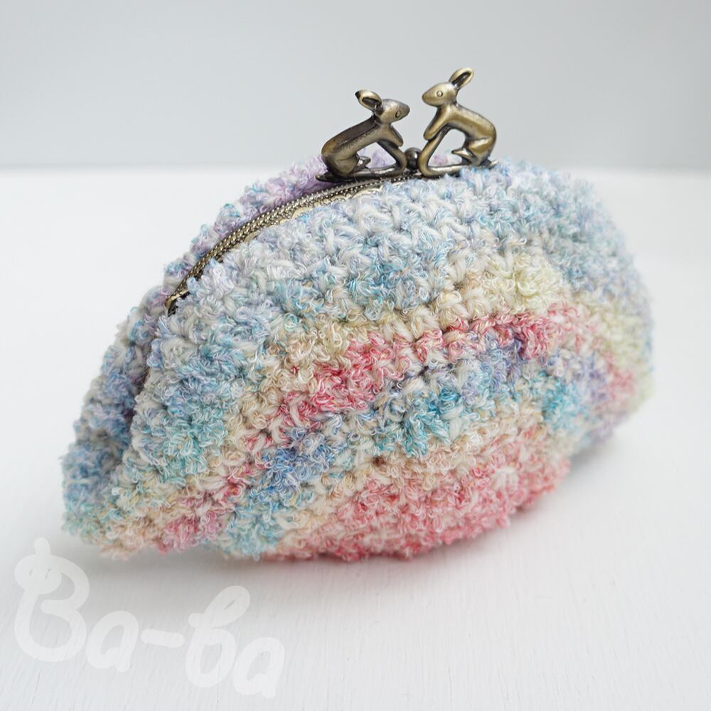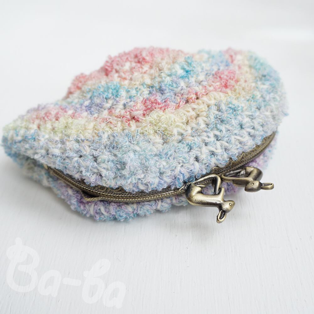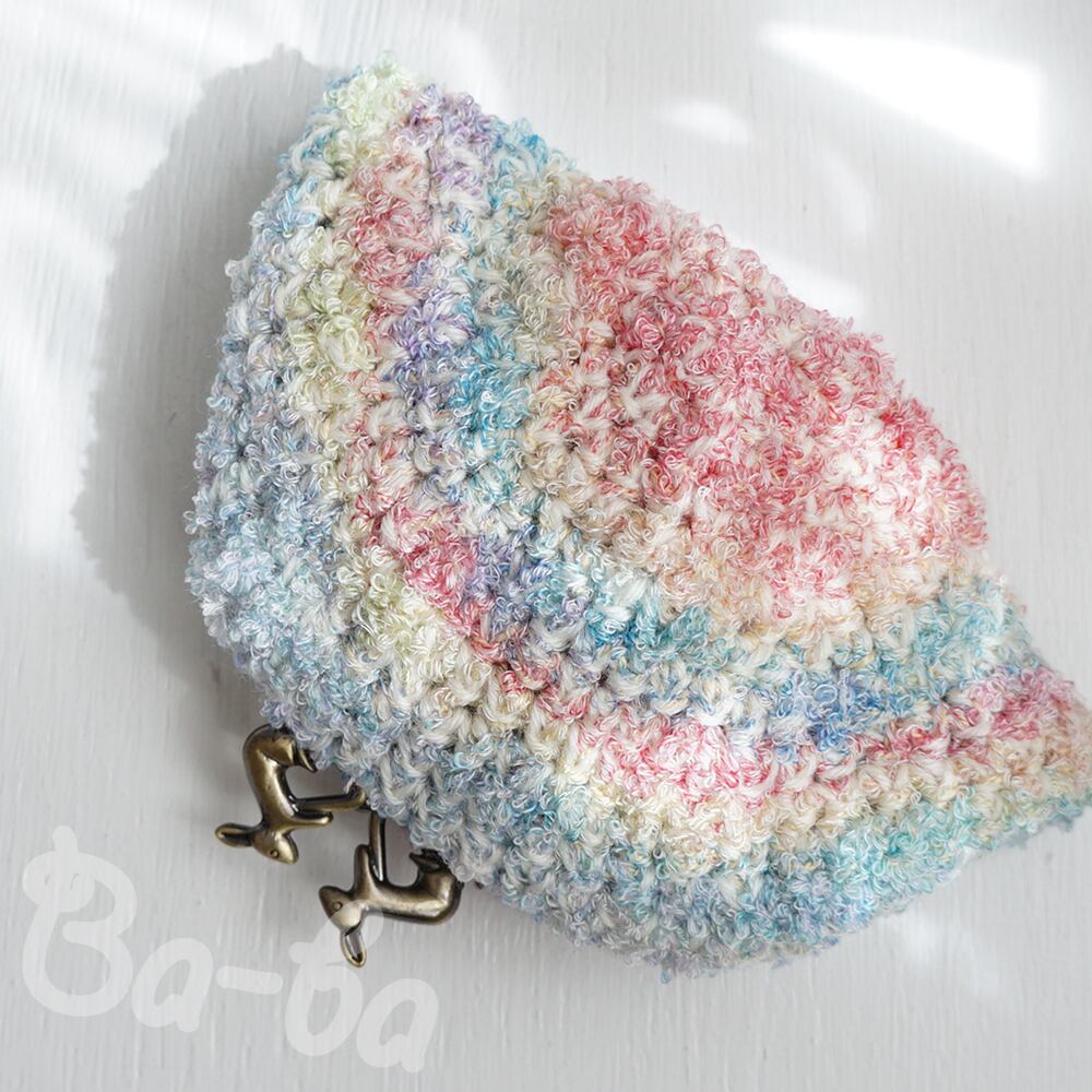 虹色段染めのモールヤーンをふんわりと編み上げ、がま口に仕上げました。